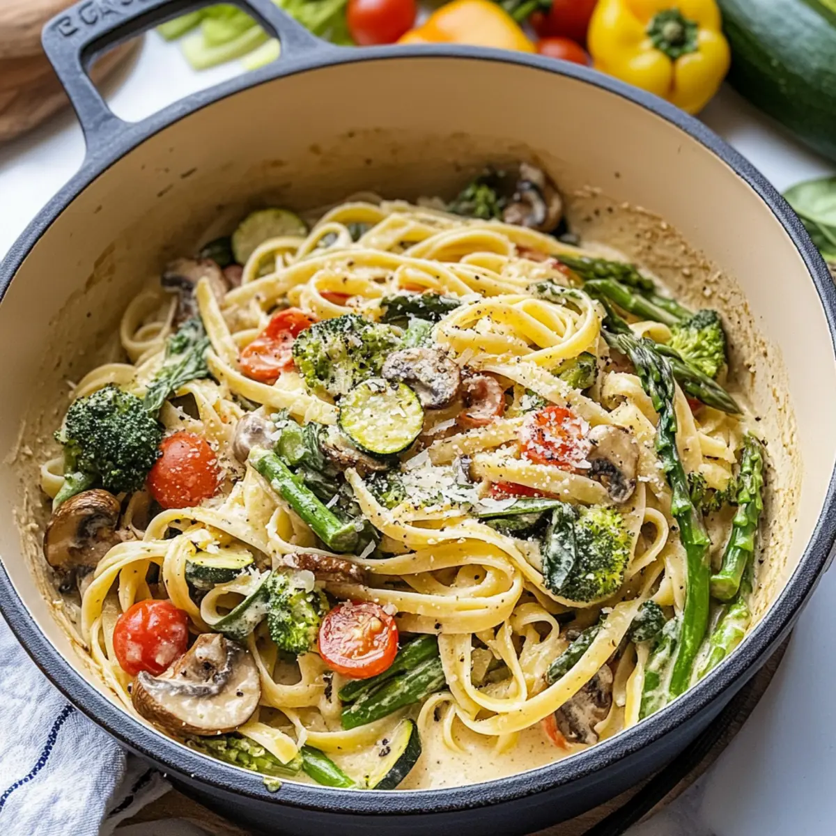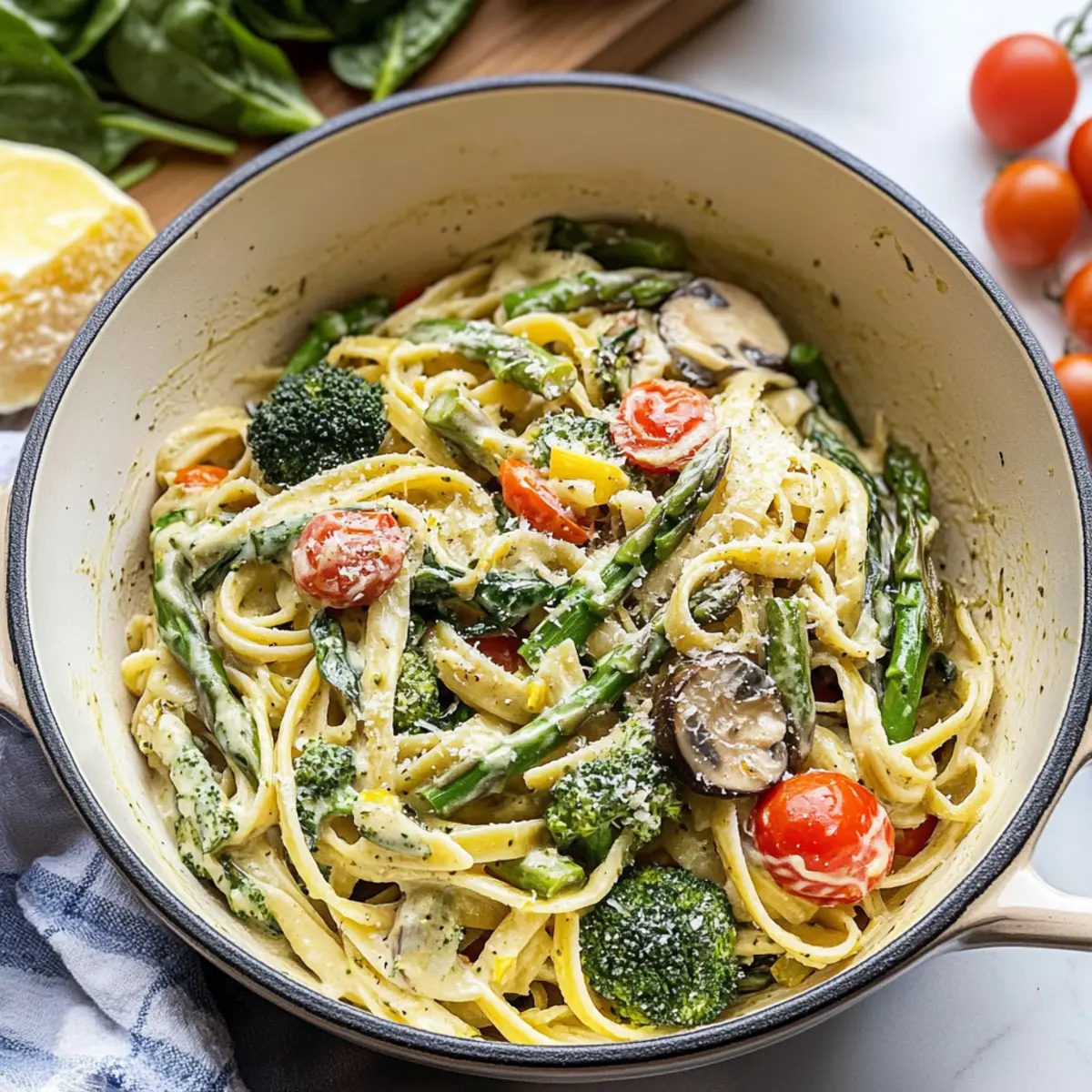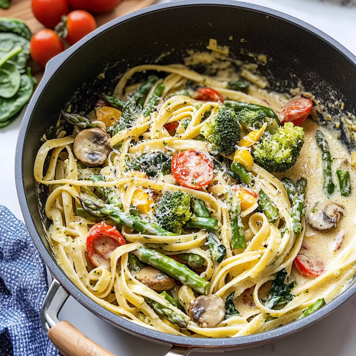 Drain the cooked fettuccine and add it to the skillet with the sautéed vegetables. Pour the creamy sauce over the pasta and toss gently to combine, adding reserved pasta water a little at a time to adjust the sauce consistency as needed. Serve your vibrant Spring Pasta Primavera warm, garnished with extra Parmesan and a drizzle of olive oil.