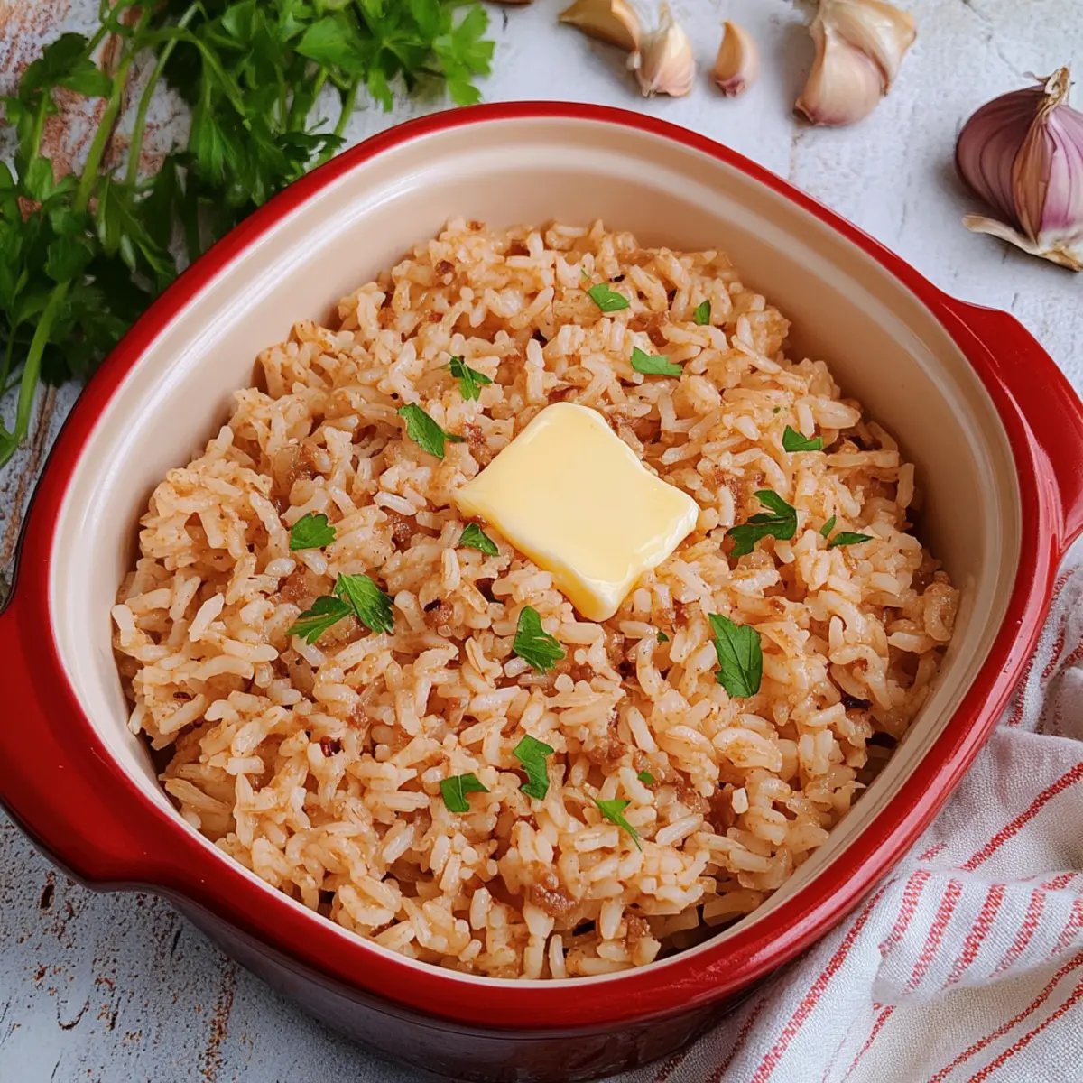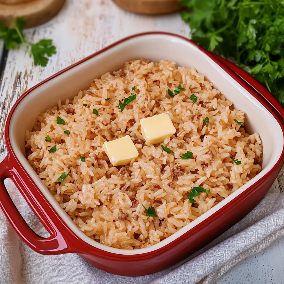 Jump to Recipe Print RecipeThe aroma wafting from the kitchen can often act as an inviting hug—part comfort, part curiosity. That’s exactly how I felt when I stumbled upon the delightful Stick of Butter Rice. This dish transforms ordinary rice into a fluffy, savory masterpiece with minimal effort. Utilizing just a handful of ingredients like onion soup mix and rich beef broth, it serves as a perfect weeknight side that requires no fuss, leaving you free to focus on other kitchen adventures. Plus, it’s freezer-friendly, making it a convenient option to have on hand for those busy days where you still crave homemade goodness. Want to know the secret to a side dish that elevates any meal to something special? Let’s dive into this simple yet satisfying recipe together! Why is Stick of Butter Rice a must-try? Effortless Preparation: This recipe requires just a handful of ingredients and minimal hands-on time, creating a hassle-free dining experience. Savory Satisfaction: The rich combination of onion soup mix and beef broth ensures that each bite is bursting with flavor, making it far from your typical rice dish. Versatile Side: Perfectly complements grilled meats, roasted veggies, or even acts as a delightful base for saucy meals like Cajun Honey Butter. Freezer-Friendly: Make a big batch and freeze leftovers for quick and delicious sides on busy nights—perfect for those craving homemade without the wait! Crowd-Pleasing Appeal: This dish is sure to impress family and friends, transforming any ordinary dinner into a comforting feast they’ll rave about. Stick of Butter Rice Ingredients For the Rice: • Long Grain White Rice – The base ingredient that provides delightful texture; avoid using instant rice for the best results. • Onion Soup Mix – Infuses your dish with rich, savory flavor; consider homemade for a low-sodium option. • Low-Sodium Beef Broth – Adds moisture and depth; you can substitute with chicken or vegetable broth for various taste profiles. For the Richness: • Unsalted Butter (1 stick) – Essential for adding creamy richness and flavor; using unsalted allows you to control the seasoning better. Enjoy making this flavorful Stick of Butter Rice, sure to enhance your meals with its delightful simplicity! Step‑by‑Step Instructions for Stick of Butter Rice Step 1: Preheat and Prepare Begin by preheating your oven to 425°F (220°C). While that heats up, grab a 2-quart casserole dish and generously coat it with cooking spray to prevent sticking. This will be the home for your Stick of Butter Rice, ensuring that it bakes evenly and releases easily when it’s ready. Step 2: Combine Ingredients In the prepared casserole dish, mix together 1 cup of long grain white rice, 1 packet of onion soup mix, and 2.5 cups of low-sodium beef broth. Stir carefully to ensure all ingredients are evenly combined, creating a flavorful base for your rice. This step is crucial for allowing the rice to absorb all the savory goodness as it cooks. Step 3: Add the Butter Slice 1 stick of unsalted butter into small pats and evenly distribute them over the rice mixture in the casserole dish. The butter will melt as the rice bakes, infusing every grain with rich, creamy flavor. Make sure the butter is well-spread for the best results, guaranteeing a decadent taste throughout your Stick of Butter Rice. Step 4: Cover and Bake Cover the dish tightly with aluminum foil or a lid to trap steam while baking. Place the covered casserole in the preheated oven and bake for 30 minutes. This initial baking phase cooks the rice while locking in moisture, ensuring fluffy grains that don’t stick together. Step 5: Uncover and Continue Baking After the first 30 minutes, carefully remove the foil or lid to check on your rice. Return the casserole to the oven and bake uncovered for an additional 30 minutes. This step allows the top to form a slight crust while the rice continues to absorb flavors, resulting in a beautifully tender and savory Stick of Butter Rice. Step 6: Fluff and Serve Once the total baking time is complete, remove the casserole from the oven and let it rest for a few minutes. Using a fork, gently fluff the rice to separate the grains and incorporate any remaining butter. Serve this irresistible Stick of Butter Rice alongside your favorite proteins or vegetables, making every meal memorable! Expert Tips for Stick of Butter Rice Choose the Right Dish: Use a deep, high-sided casserole dish to promote even cooking and prevent the rice from drying out. Check for Crunchy Bits: If some rice grains are crunchy after baking, it’s likely due to a loose cover. Fluff the rice to redistribute those sections. Rinse Your Rice: Rinsing the long grain white rice before cooking helps remove excess starch, resulting in a lighter, fluffier Stick of Butter Rice. Experiment with Broths: Feel free to swap the beef broth for chicken or vegetable broth to change the flavor profile and cater to dietary preferences. Utilize Leftovers Creatively: Store any leftover Stick of Butter Rice in an airtight container and reheat it for quick, easy meals throughout the week. Add Additional Ingredients: Enhance the dish by mixing in sautéed vegetables or herbs before baking for an extra burst of flavor and nutrition. Make Ahead Options These Stick of Butter Rice are perfect for meal prep enthusiasts! You can prepare the rice mixture (1 cup long grain white rice, 1 packet of onion soup mix, and 2.5 cups of beef broth) up to 24 hours in advance by assembling it in your casserole dish and covering it with plastic wrap. This allows the flavors to meld beautifully. Additionally, you can slice the butter into pats and keep them refrigerated, ready to be added before baking. When you’re ready to serve, simply place the prepared dish in the oven, add the butter pats, and bake as instructed. This way, your Stick of Butter Rice will be just as delicious and fluffy, saving you precious time on busy weeknights! How to Store 