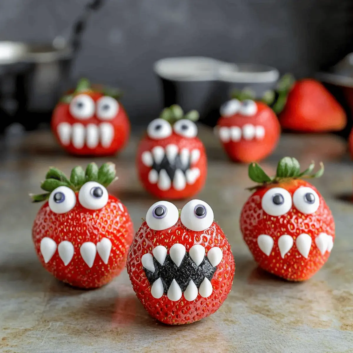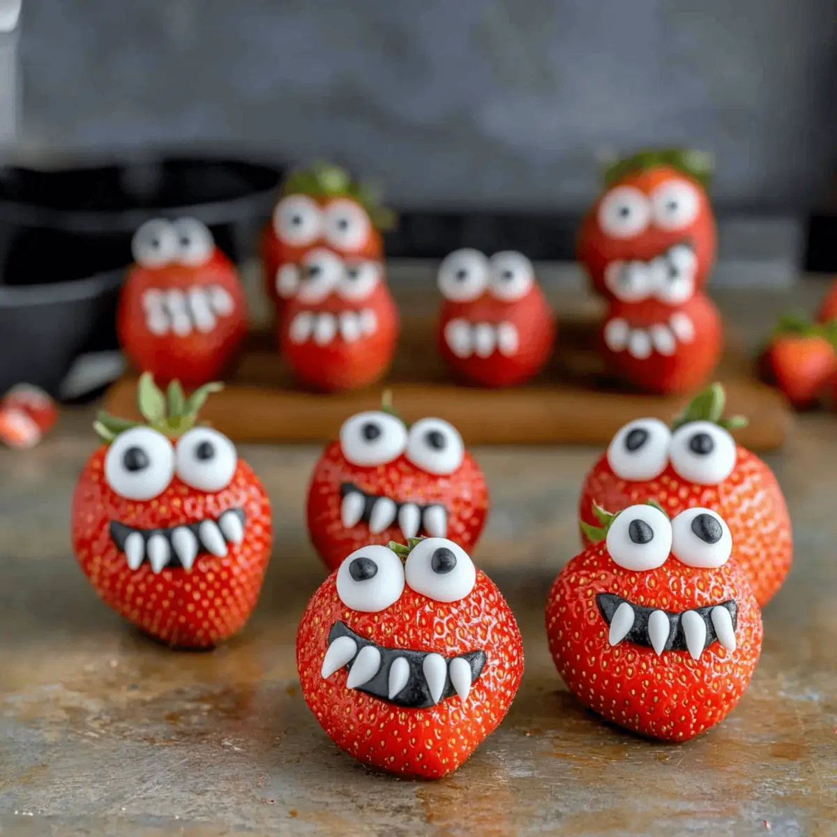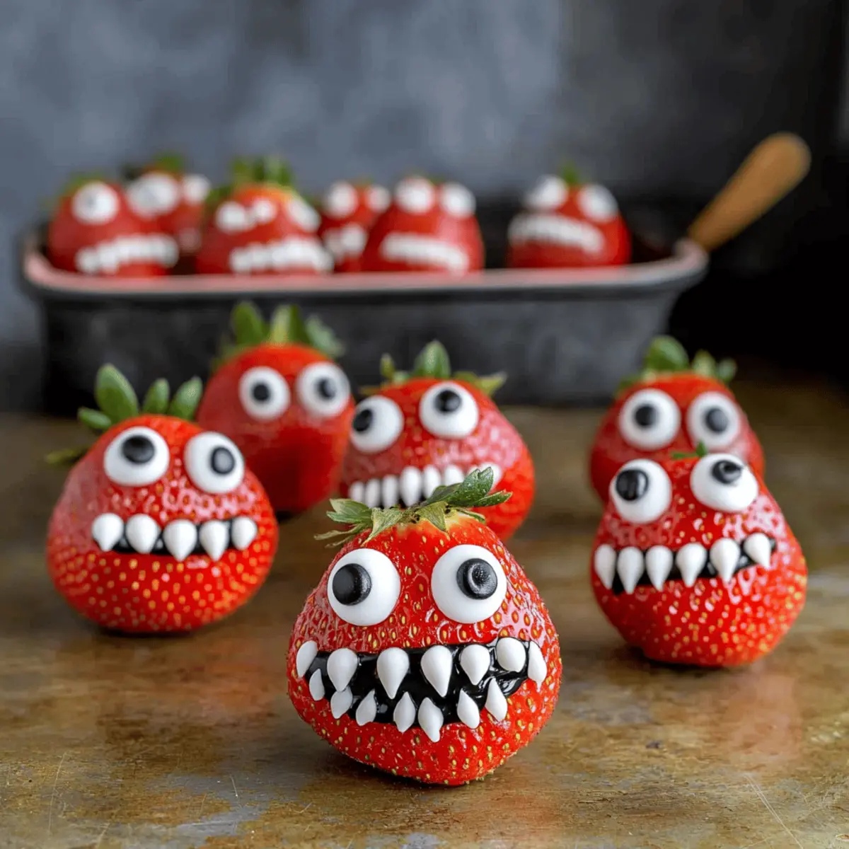 Jump to Recipe Print RecipeAs I strolled through the vibrant stalls of my local farmer’s market, the sight of plump, ripe strawberries caught my eye and ignited my imagination. This Halloween, instead of the usual sugar-laden treats, I decided to whip up some delightful Strawberry Halloween Monsters! These charming and healthy Halloween treats not only bring a dash of fun to any gathering but are also quick to prepare, ensuring you can celebrate without the hassle. Picture bright red strawberries transformed into whimsical creatures, adorned with candy eyes and playful mouths—a treat that will enchant kids and adults alike. Perfect as a festive party snack, or even a special surprise in lunchboxes, these strawberry monsters are a guilt-free way to indulge in the spirit of the season. So, who’s ready to create some spooky, edible art that’ll make everyone smile? Why Choose Strawberry Halloween Monsters? Fun and Festive: These playful creations bring Halloween spirit to life, making them a hit at parties or family gatherings. Healthy Twist: Packed with fresh strawberries, they offer a nutritious alternative to traditional treats without sacrificing taste. Quick Preparation: With just a few simple steps, you can whip up these adorable monsters in no time—perfect for busy schedules! Culinary Creativity: Get creative with fondant colors and shapes, turning the kitchen into your personal spooky art studio. Explore more fun treats like Strawberry Spinach Salad for a colorful add-on to your Halloween menu! Kid-Friendly Fun: Involve the little ones in decorating, creating memorable moments while they enjoy a healthy snack. Guilt-Free Indulgence: At approximately 34 calories per monster, you can enjoy these delightful treats without any post-Halloween regret! Strawberry Halloween Monsters Ingredients Here’s what you’ll need to create these delightful treats! For the Monsters Strawberries – A natural source of sweetness; pick ripe, vibrant berries for best results. White Fondant (2 ounces) – Perfect for creating spooky mouths and teeth; can be homemade or store-bought to save time. Black Food Coloring Gel – Adds a fun, dark dimension to your fondant; you may also use black fondant for convenience. Powdered Icing Sugar (⅓ cup) – Dusting this is key to preventing sticking while rolling out fondant. White Writing Icing Tube – Serves as an adhesive for attaching your creative details to the strawberries. Candy Eyes (12 pcs) – The finishing touch that brings your strawberry monsters to life and enhances the festive appeal! Feel free to get creative with these strawberry Halloween monsters, and enjoy a fun twist on healthy Halloween treats! Step‑by‑Step Instructions for Strawberry Halloween Monsters Step 1: Prepare the Strawberries Start by washing 12 ripe strawberries under cool running water. Gently scrub them to remove any dirt, then pat them dry with a clean paper towel. Next, carefully trim the green tops to create a flat base, allowing the strawberries to stand upright like little monster bodies. Take a moment to admire their bright red color—these will be the stars of your Strawberry Halloween Monsters! Step 2: Color the Fondant Take 2 ounces of white fondant and divide it in half. In a mixing bowl, knead black food coloring gel into one half until the color is evenly distributed and fully blended. The fondant should be smooth and pliable, resembling soft modeling clay. Set the black fondant aside, and make sure to keep your workspace dusted with powdered icing sugar to prevent sticking. Step 3: Roll Out the Fondant Dust your clean work surface with about ⅓ cup of powdered icing sugar to prevent the fondant from sticking. Roll out both the white and black fondant separately until they reach about 1/8 inch in thickness. Aim for a smooth and even surface, transforming the fondant into canvases for your creations. Visualize your Strawberry Halloween Monsters taking shape as you flatten the fondant! Step 4: Cut the Decorations Using a sharp knife or cookie cutter, cut out oval shapes from the rolled black fondant for the monster mouths. Additionally, slice small triangles from the white fondant for the teeth; these should be sharp and pointy to enhance the playful monster vibe. Arrange these fun pieces on your workspace, ready to come together in your delightful Strawberry Halloween Monsters! Step 5: Assemble the Monsters Grab your strawberries and prepare to assemble the mouth with your decorations. Use a tiny dab of water to “glue” the white teeth onto the black mouth pieces, creating monstrous grins. With a writing icing tube, carefully apply a line of icing around the top of the strawberry, then attach the black mouth piece directly to it, positioning them just right. Allow a moment for the icing to set. Step 6: Add the Candy Eyes Finish off your Strawberry Halloween Monsters by placing candy eyes on top of each strawberry, securing them with a touch of white writing icing. Give each creature its unique personality by adjusting the placement of the eyes. Stand back and admire your work—the transformation from plain strawberries to whimsical monsters is complete and ready to bring fun to your festive gathering! What to Serve with Halloween Strawberry Monsters Add a splash of festivity to your spread with these delightful accompaniments for your adorable Halloween treats. Crispy Veggie Platter: Fresh vegetables like carrots, celery, and bell peppers offer a crunchy contrast to sweetness and brighten up your table. Pumpkin Spice Dip: This creamy, seasonal dip pairs perfectly with apple slices for those who love a sweet and spicy combination. It’s a crowd-pleaser! Mini Cheese Boards: A selection of cheeses with some grapes and nuts can complement the sweetness of the strawberry monsters, providing balance and variety. Chocolate-Dipped Pretzels: The salty and sweet flavor of chocolate-dipped pretzels creates a fun, crunchy bite that kids and adults alike will