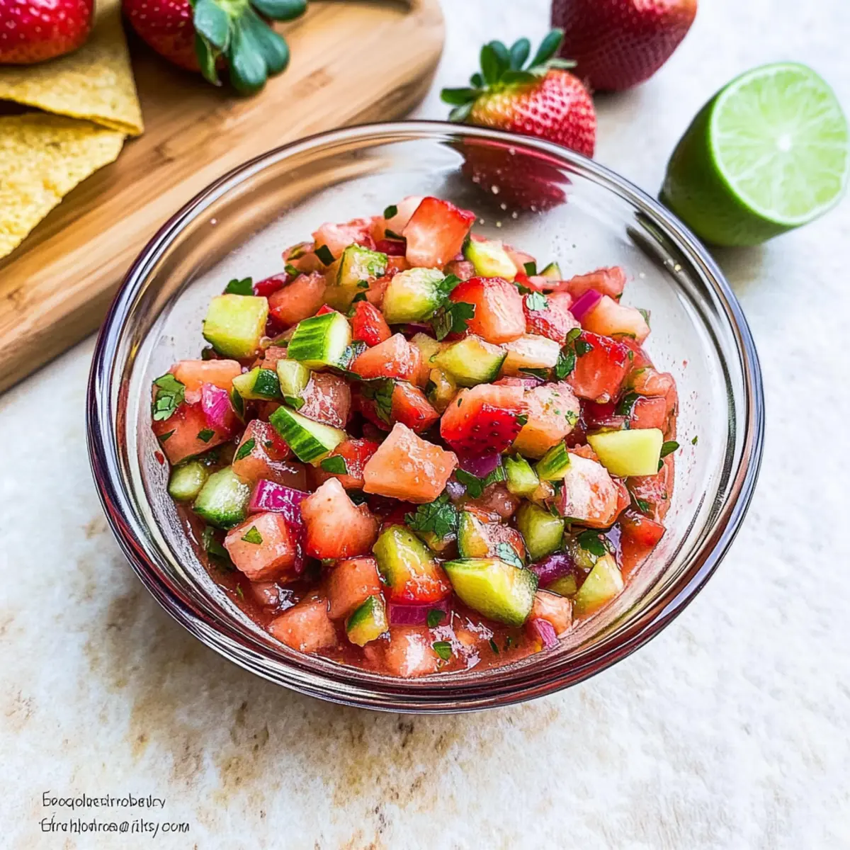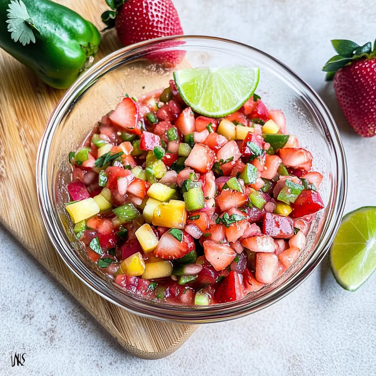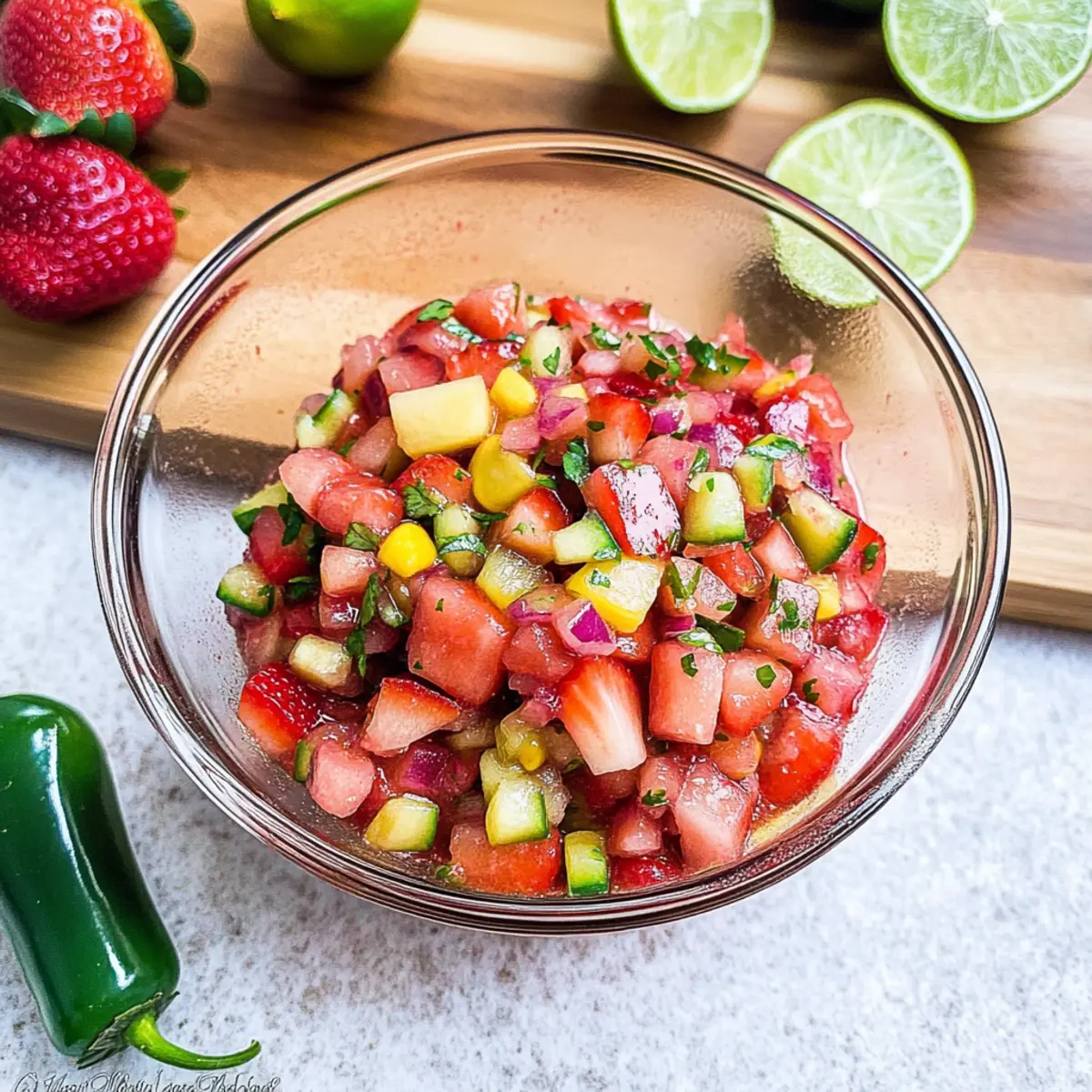 Jump to Recipe Print RecipeAs I stood in my kitchen, the vibrant colors of fresh strawberries and rhubarb captured my attention, a reminder that summer was just around the corner. This Fresh Strawberry Rhubarb Salsa is an exciting little creation that elevates any gathering with its sweet and spicy notes, a perfect no-bake appetizer that’s ready in just 20 minutes. This salsa is not only refreshing but also a versatile addition to your summer meals; enjoy it with crispy tortilla chips, on juicy grilled chicken, or tucked into tacos. With its delightful crunch and rich flavor, it’s a simple crowd-pleaser that takes your taste buds on a joyride. Are you ready to bring a touch of summer magic to your table? Why try this refreshing salsa? Easy to Make: This Strawberry Rhubarb Salsa is a no-bake delight, ready in just 20 minutes, making it perfect for spontaneous gatherings or busy weeknights. Vibrant Flavor: The sweet strawberries and tangy rhubarb create a fresh flavor profile that excites the palate; it’s a taste explosion you won’t forget! Versatile Use: Serve it with crispy tortilla chips, on grilled chicken, or even in tacos. It seamlessly elevates any meal! Healthy Snacking: With rhubarb’s low-calorie, high-fiber benefits, you can indulge guilt-free, making it a nutritious addition to your summer menu. Crowd-Pleasing Charm: Whether serving family or friends, this salsa is sure to impress and spark delightful conversations around your table. Enjoy it alongside a refreshing drink like Strawberry Pina Colada for a complete summer experience! Strawberry Rhubarb Salsa Ingredients For the Salsa Strawberries – Use ripe berries for optimal sweetness and juiciness, balancing the tartness of rhubarb. Rhubarb – Fresh rhubarb is preferred; blanching reduces its acidity for a harmonious flavor. Jalapeño Pepper – Adjust the quantity to your spice preference; remove seeds for a milder taste. Vinegar (Apple Cider or White) – Adds a zesty acidity; optional if you’d like a smoother flavor profile. Lime Juice – Freshly squeezed lime juice brightens the dish with a burst of citrus. Honey – Sweeten to taste; it beautifully balances the salsa’s tangy and spicy elements. Minced Garlic – Adds a savory depth, enhancing the overall flavor of your Strawberry Rhubarb Salsa. Step‑by‑Step Instructions for Strawberry Rhubarb Salsa Step 1: Blanch the Rhubarb Begin by chopping fresh rhubarb into small pieces, then bring a pot of water to a rolling boil. Carefully add the rhubarb and blanch it for 1 minute to soften its tartness. After time’s up, quickly transfer the rhubarb to a bowl of ice water to halt the cooking process. Let it chill for 10-15 minutes, then drain and set aside. Step 2: Prepare the Other Ingredients While the rhubarb cools, wash and dice ripe strawberries into small, bite-sized pieces for your Strawberry Rhubarb Salsa. Next, finely mince a jalapeño pepper, adjusting the amount based on your spice preference; be sure to remove seeds for a milder salsa. Gather your other ingredients including honey, lime juice, vinegar, and minced garlic, ready for mixing. Step 3: Combine Ingredients In a large mixing bowl, combine the blanched rhubarb, diced strawberries, and minced jalapeño. Pour in the lime juice and vinegar, followed by a drizzle of honey and the minced garlic. Use a spatula to gently fold the ingredients together, ensuring everything is evenly coated and well combined for a harmonious blend of flavors in the salsa. Step 4: Let the Flavors Develop Cover the bowl with plastic wrap or a lid and refrigerate the salsa for at least 2 hours. This chilling step is essential as it allows the flavors to meld and intensify, creating a deliciously cohesive Strawberry Rhubarb Salsa. If time permits, letting it sit overnight can enhance the taste further. Step 5: Serve and Enjoy Once the salsa has chilled, it’s time to serve this vibrant dish. Present your Strawberry Rhubarb Salsa in a colorful bowl, paired with crispy tortilla chips, or use it as a refreshing topping on grilled chicken or tacos. The appealing colors and fresh flavors are sure to impress family and friends! What to Serve with Strawberry Rhubarb Salsa? Elevate your summer gatherings with delightful pairings that complement the vibrant flavors of this refreshing salsa. Crispy Tortilla Chips: The crunchiness of chips provides the perfect vehicle for the sweet and spicy salsa, creating a delightful textural contrast. Grilled Chicken: The juicy, smoky flavor of grilled chicken pairs wonderfully with the fresh, zesty notes of the salsa, enhancing each bite. Tacos: Use this salsa as a zesty topping, adding layers of flavor to fish or chicken tacos, making for a colorful and vibrant meal. Creamy Avocado Toast: The rich creaminess of avocado creates a dreamy contrast with the bright salsa, making each bite a perfect blend. Flatbreads: Lightly toasted flatbreads topped with hummus and a generous scoop of salsa make for an easy yet impressive appetizer. Margaritas: A refreshing margarita complements the fruity and tangy flavors, rounding out your summer soiree with a festive flair. Greek Yogurt Dip: Incorporating this salsa into a creamy dip combines savory and sweet elements, providing a unique experience for your guests. Watermelon Salad: A refreshing salad with watermelon and mint balances the spiciness of the salsa, making it a refreshing choice for a hot day. Pineapple Salsa: Continue the fruity theme with a sweet pineapple salsa; the two salsas served together will entice guests with vibrant variety. Vanilla Ice Cream: For a sweet twist, drizzle this salsa over vanilla ice cream to create a surprising and delightful dessert option. Make Ahead Options These Strawberry Rhubarb Salsa are perfect for meal prep enthusiasts! You can blanch the rhubarb and mix it with diced strawberries, jalapeño, and other ingredients up to 24 hours in advance, storing it in an airtight container in the refrigerator for optimal fl