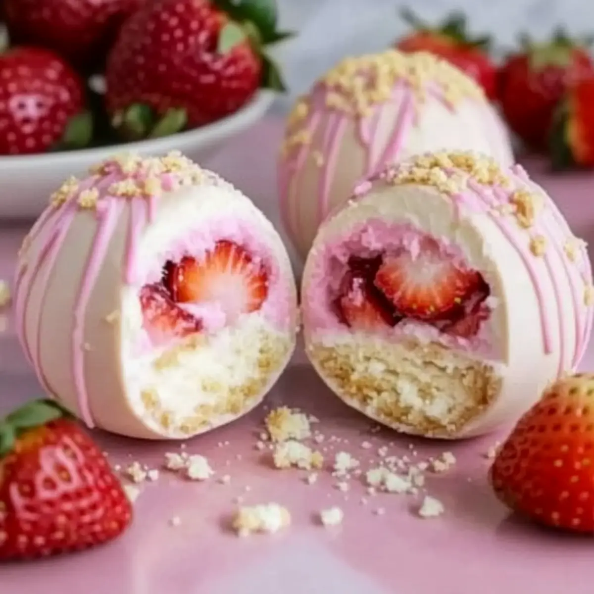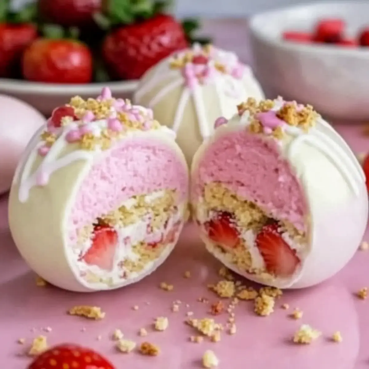 Once the treats are firm, remove them from the refrigerator and carefully drizzle additional melted white chocolate over the top for an elegant finish. Then, sprinkle some shortcake crumbs on top to mimic the classic dessert’s texture. For a festive touch, feel free to add colorful sprinkles to brighten up your Strawberry Shortcake Easter Egg Bombs.