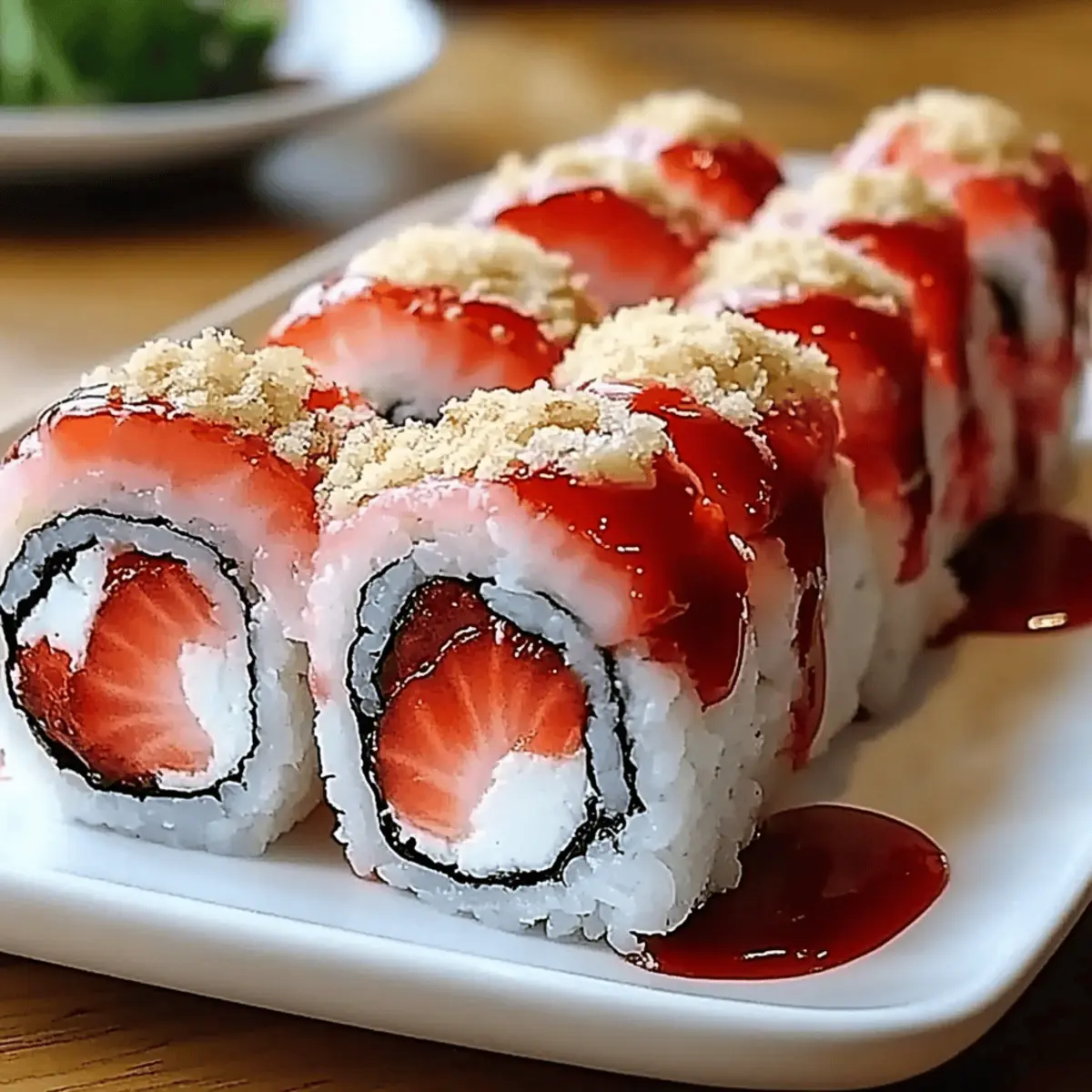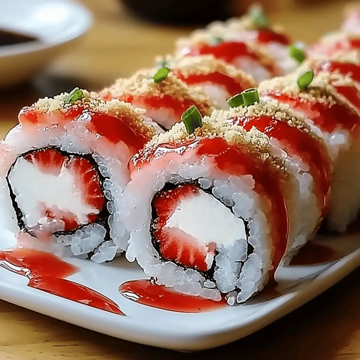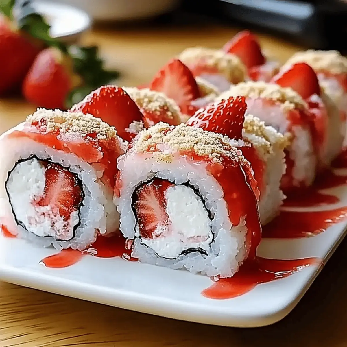 Jump to Recipe Print RecipeDid you ever think that sushi could be sweet? Well, get ready to be amazed, because this Strawberry Shortcake Sushi Roll takes a beloved dessert and transforms it into a playful and creative masterpiece. This no-bake delight combines the light texture of fluffy sponge cake with a creamy cheesecake filling, all wrapped around juicy strawberries – talk about an Instagram-worthy dessert! Perfect for impressing guests at parties or simply treating yourself at home, this recipe is quick to assemble and versatile enough to customize with your favorite fruits. Whether you’re a seasoned home chef or just looking for a fun twist to share with friends, this Strawberry Shortcake Sushi Roll is sure to add a sprinkle of excitement to any occasion. So, are you ready to roll into a sweet culinary adventure? Why Is This Recipe a Must-Try? Delightful presentation: The playful sushi roll appearance transforms a classic dessert into a visual feast that will wow your guests. Easy to make: This no-bake dessert is perfect for anyone, regardless of baking experience; just roll and serve! Flavor explosion: Experience a delightful blend of creamy cheesecake, fresh strawberries, and light sponge cake that’s simply irresistible. Versatile options: Customize with various fruits or toppings, like drizzled chocolate or a hint of mint for garnish. Perfect for gatherings: Ideal for parties, potlucks, or special occasions, this treat is guaranteed to be a crowd-pleaser. For more party-ready ideas, don’t miss out on our fresh and vibrant Strawberry Spinach Salad or the classic Strawberry Pie Resist. Strawberry Shortcake Sushi Roll Ingredients • Get ready for a sweet treat! For the Cake Sponge Cake – Provides structure and a light base; for convenience, substitute with a store-bought sheet cake. For the Filling Cream Cheese – Adds creaminess to the filling; can substitute with mascarpone for a richer taste. Powdered Sugar – Sweetens the filling; reduce to taste for a lighter option. Vanilla Extract – Enhances flavor; can be omitted for a different profile. Whipped Cream – Incorporates air into the filling for lightness; use store-bought for ease or homemade for a richer touch. For the Strawberry Layer Strawberry Preserves – Adds fruity sweetness and moisture; fresh strawberries can also be used for added texture. Fresh Strawberries – Provides freshness and flavor; thawed frozen strawberries may be used if properly drained. Optional Toppings White Chocolate – For drizzling, adds a sweet touch; dark chocolate or no chocolate can be alternatives. Mint Leaves – For garnish, can also use edible flowers for a beautiful decoration. Get everything ready, and prepare to create your delicious Strawberry Shortcake Sushi Roll! Step‑by‑Step Instructions for Strawberry Shortcake Sushi Roll Step 1: Prepare the Sponge Cake Begin by preheating your oven to 350°F (175°C) if you’re making the sponge cake from scratch. Grease a jelly roll pan and line it with parchment paper. Pour the batter evenly into the pan and bake for 10-15 minutes until it’s lightly golden and springs back when touched. Once baked, remove from the oven and allow to cool completely while still in the pan. Step 2: Make the Cream Cheese Filling In a large mixing bowl, combine 8 oz of cream cheese, 1/2 cup of powdered sugar, and 1 teaspoon of vanilla extract. Using an electric mixer, beat the mixture on medium speed until it’s smooth and creamy, about 2-3 minutes. Ensure there are no lumps for a velvety filling. Set the mixture aside while you prepare the whipped cream. Step 3: Incorporate the Whipped Cream Next, gently fold in 1 cup of whipped cream into the cream cheese mixture. Use a spatula and employ a careful folding technique to maintain the airy texture of the whipped cream. You want to create a light and fluffy texture that will blend seamlessly with the strawberry flavors. Step 4: Assemble the Sushi Roll Once the sponge cake is fully cooled, spread a thin layer of strawberry preserves over the cake, covering it evenly. Then, dollop the cream cheese filling over the preserves. Finally, sprinkle diced fresh strawberries across the filling. This layer of fruity goodness will elevate your Strawberry Shortcake Sushi Roll beautifully. Step 5: Roll the Cake Using parchment paper or a rolling mat, carefully start rolling the cake from one of the short edges, applying gentle pressure to create a tight roll without squishing the filling out. Roll it all the way to the end, then seal the edges by pressing lightly. Wrap the roll in parchment paper and refrigerate for 20-30 minutes to help it set. Step 6: Slice the Sushi Rolls After chilling, remove the roll from the refrigerator and unwrap it. Using a sharp knife, slice the roll into 1-inch pieces. Clean the knife with a damp cloth between cuts for neat edges. These charming slices will resemble sushi pinwheels and will be visually captivating on your serving platter. Step 7: Serve and Garnish Arrange the adorable Strawberry Shortcake Sushi Roll slices on a serving platter. For a touch of elegance, drizzle melted white chocolate over the top. If desired, garnish with fresh mint leaves or even a swirl of whipped cream for an extra pop. This delightful dessert is perfect for any occasion! Expert Tips for Strawberry Shortcake Sushi Roll Avoid Overfilling: Ensure you don’t add too much filling or fruit, as it may burst out when rolling. A thin layer works best for rolling the cake neatly. Chill Before Slicing: Refrigerate the rolled cake for at least 20-30 minutes before slicing. This helps the Strawberry Shortcake Sushi Roll maintain its shape and makes cutting easier. Use a Sharp Knife: A sharp knife is essential for cleanly slicing the rolls. Wipe the knife with a damp cloth between cuts for the best presentation. Cool Your Cake: Make sure the sponge cake is completely cooled before adding fillings to avoid melting the cream cheese and compromising the text
