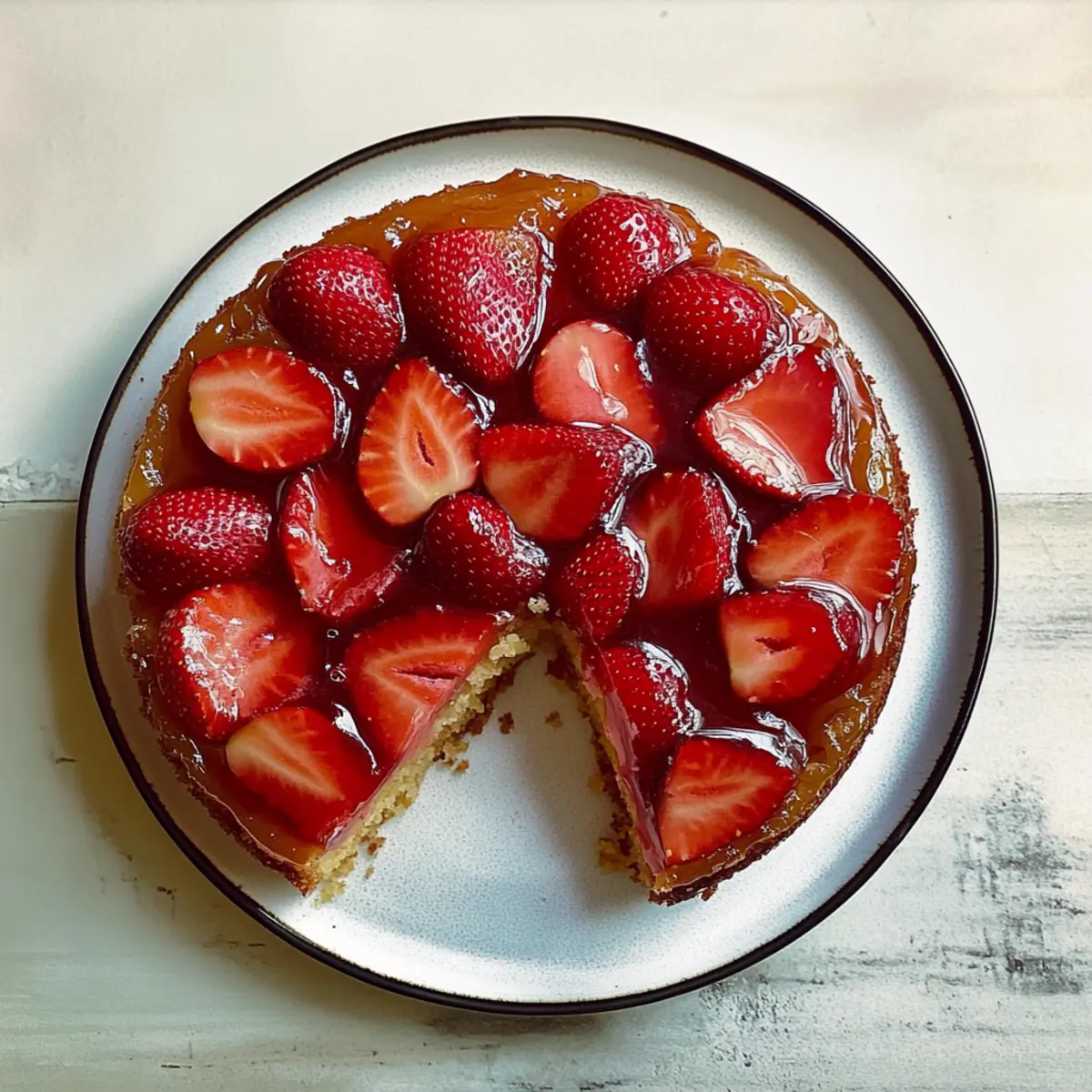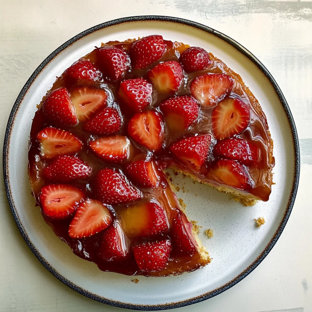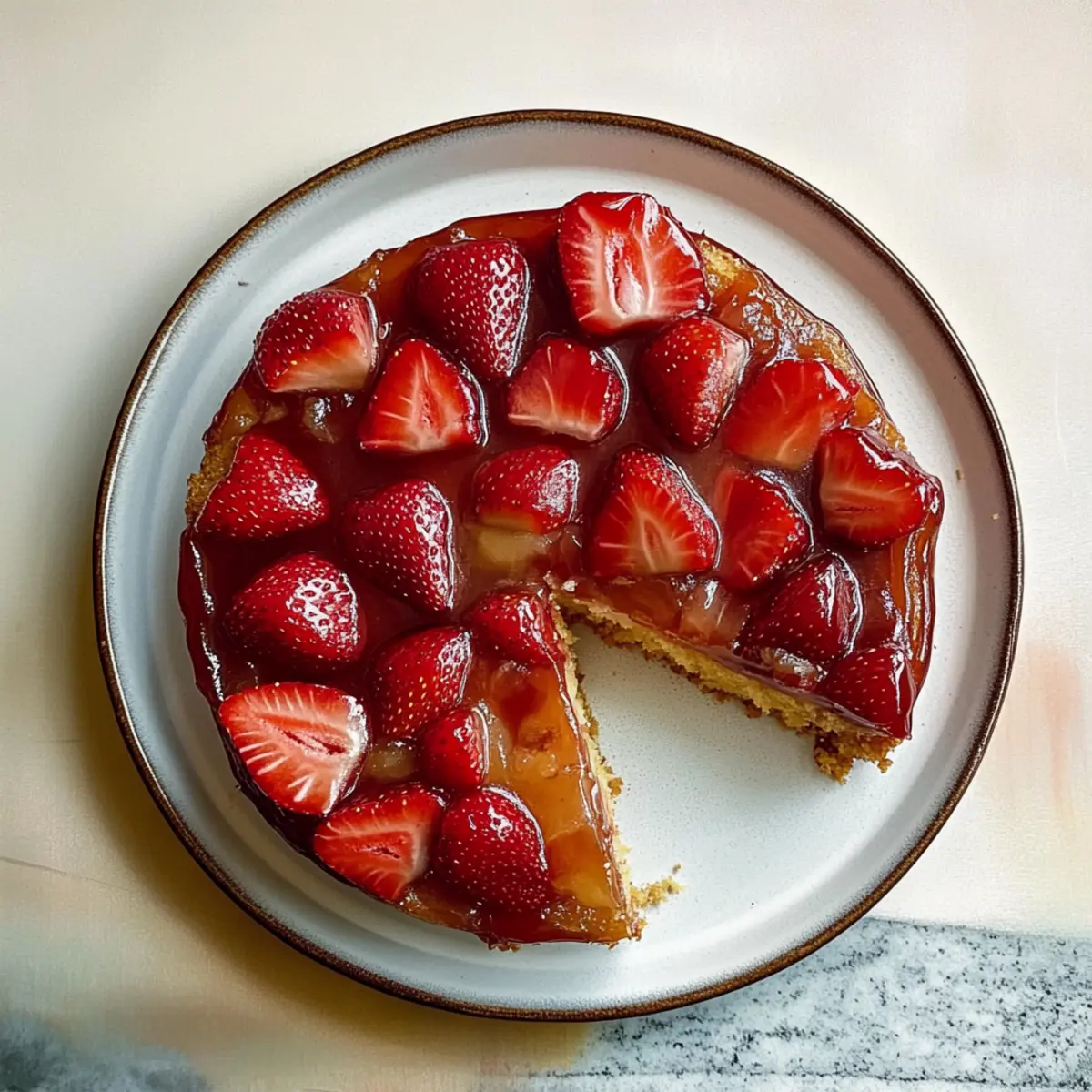 Jump to Recipe Print RecipeAs I pulled the cake from the oven, the sweet, warm scent of caramelized strawberries wafted through my kitchen, instantly transforming my space into a cozy haven. This Strawberry Upside-Down Cake is not just a dessert—it’s a delightful experience, with its tender crumb embracing that luscious layer of fruit on top. The best part? It’s incredibly easy to whip up and makes for a stunning centerpiece at any gathering. Whether celebrating a special occasion or simply enjoying a sunny afternoon, this cake is sure to impress and satisfy your sweet tooth. Ready to savor the taste of summer with every bite? Let’s dive into this delightful recipe! Why is this cake a must-try? Unforgettable Flavor: The combination of sweet caramelized strawberries and a fluffy cake creates a burst of flavor that’s simply irresistible. Easy to Make: With straightforward steps and common ingredients, you’ll have this stunning dessert ready in no time. Versatile Options: Feel free to swap out strawberries for other fruits like peaches or pineapples, making it adaptable to any season. Showstopper Presentation: Invert it, and voilà! You’ll have a beautiful cake that looks as good as it tastes, perfect for any gathering. Elevate Your Celebrations: Pair it with a scoop of vanilla ice cream for an unforgettable treat that your guests will talk about long after the last bite! If you’re also a fan of delicious salads, check out this vibrant Strawberry Spinach Salad for a fresh side option! Strawberry Upside-Down Cake Ingredients For the Cake • Unsalted Butter – 11 tablespoons, divided; this provides the moisture and richness essential for a tender crumb. Vegan butter can be used for a dairy-free option. • Brown Sugar – 3 tablespoons + ½ cup; this adds sweetness and depth of flavor, but feel free to replace it with coconut sugar for a healthier twist. • Strawberries – 1 quart, hulled and thinly sliced; the star of the dish, offering delightful natural sweetness, can also be substituted with other berries if desired. • Whole Wheat Flour – ⅔ cup; contributes structure and texture; all-purpose flour is perfect for a lighter cake. • All-Purpose Flour – ⅔ cup; helps create a tender crumb; may substitute with gluten-free flour blend for a gluten-free version. • Cinnamon – 1 teaspoon; enhances the overall flavor profile; it can be omitted if you’re looking for a simpler taste. • Baking Powder – ¾ teaspoon; essential for that lovely lift; ensure it’s fresh for the best results. • Baking Soda – ¼ teaspoon; works in conjunction with acidic ingredients to help the cake rise. • Kosher Salt – Pinch; this is key in balancing sweetness; sea salt makes a perfect alternative. • Large Egg – 1; acts as a binder in the mixture; replace it with a flax egg to make it vegan-friendly. • Vanilla Extract – 1 teaspoon; pure vanilla is best for adding aroma and depth of flavor. • Greek Yogurt – ⅔ cup; creates moisture in the cake; if you don’t have this on hand, sour cream is a great substitute. For Serving • Whipped Cream – A dollop to add a light, airy complement to the sweetness. • Vanilla Ice Cream – A scoop will elevate your dessert to divine status, making each bite irresistible. Explore the warm, inviting world of this deeply flavorful Strawberry Upside-Down Cake, perfect to brighten up your next gathering! Step‑by‑Step Instructions for Strawberry Upside-Down Cake Step 1: Preheat and Prepare the Pan Begin by preheating your oven to 350°F (175°C). While the oven heats, take a 9-inch round cake pan and grease it with 3 tablespoons of unsalted butter. Make sure to cover the bottom and sides thoroughly to ensure easy release of the cake later on. Step 2: Arrange the Strawberries Once your pan is prepared, sprinkle 3 tablespoons of brown sugar evenly across the bottom. Then, take your hulled and thinly sliced strawberries and arrange them tightly in a single layer on top of the brown sugar. The strawberries should cover the entire bottom and create a beautiful foundation for your Strawberry Upside-Down Cake. Step 3: Mix the Dry Ingredients In a medium mixing bowl, combine ⅔ cup of whole wheat flour, ⅔ cup of all-purpose flour, 1 teaspoon of cinnamon, ¾ teaspoon of baking powder, ¼ teaspoon of baking soda, and a pinch of kosher salt. Whisk these dry ingredients together until they are well blended, and set them aside to allow the flavors to meld. Step 4: Cream the Butter and Sugar In a stand mixer, cream together the remaining 8 tablespoons of butter and ½ cup of brown sugar on medium speed for about 5 minutes. The mixture should become light and fluffy. After this, add in 1 large egg and 1 teaspoon of vanilla extract, mixing for an additional 2 minutes until fully incorporated. Step 5: Combine Wet and Dry Ingredients Gradually add the dry ingredient mixture to the creamed butter and sugar. Alternate this addition with ⅔ cup of Greek yogurt, mixing until just combined. Be careful not to overmix, as we want the Strawberry Upside-Down Cake to remain tender and fluffy. Step 6: Spread the Batter Spoon the batter over the beautifully arranged strawberries in the cake pan. Using a spatula, dollop and gently spread the batter until it covers the fruit evenly. Make sure to smooth the top for an even bake and a lovely final appearance. Step 7: Bake the Cake Place the cake pan in your preheated oven and bake for 25 to 30 minutes. You’ll know it’s done when a toothpick inserted in the center comes out clean and the top is lightly golden. Allow the cake to bake until you see a slight pulling away from the sides of the pan, signaling it is ready. Step 8: Cool and Serve After baking, let the cake cool in the pan for about 15 minutes. Carefully run a knife around the edges to loosen it, then invert the cake onto a serving platter. Allow it to cool completely before serving, so the flavors meld beautifully and you can fully appreciate