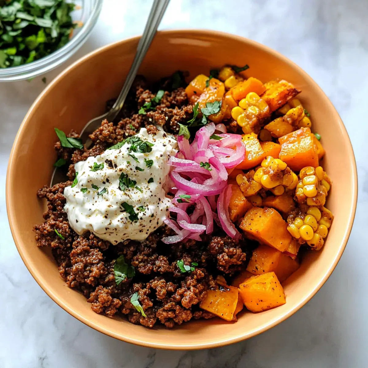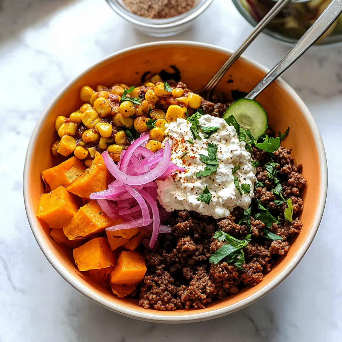 4. Layer the roasted sweet potatoes at the bottom of each bowl, add seasoned ground beef, and drizzle the creamy street corn dip on top.