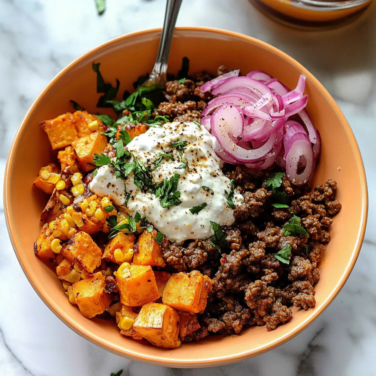 Once the sweet potatoes are cooked to a golden crisp, it’s time to assemble your Street Corn Beef Potato Bowls. Layer the roasted sweet potatoes at the bottom of each bowl, followed by a generous scoop of the seasoned ground beef. Drizzle the creamy street corn dip generously over the top for that perfect finish, adding a rich layer of flavor and texture.