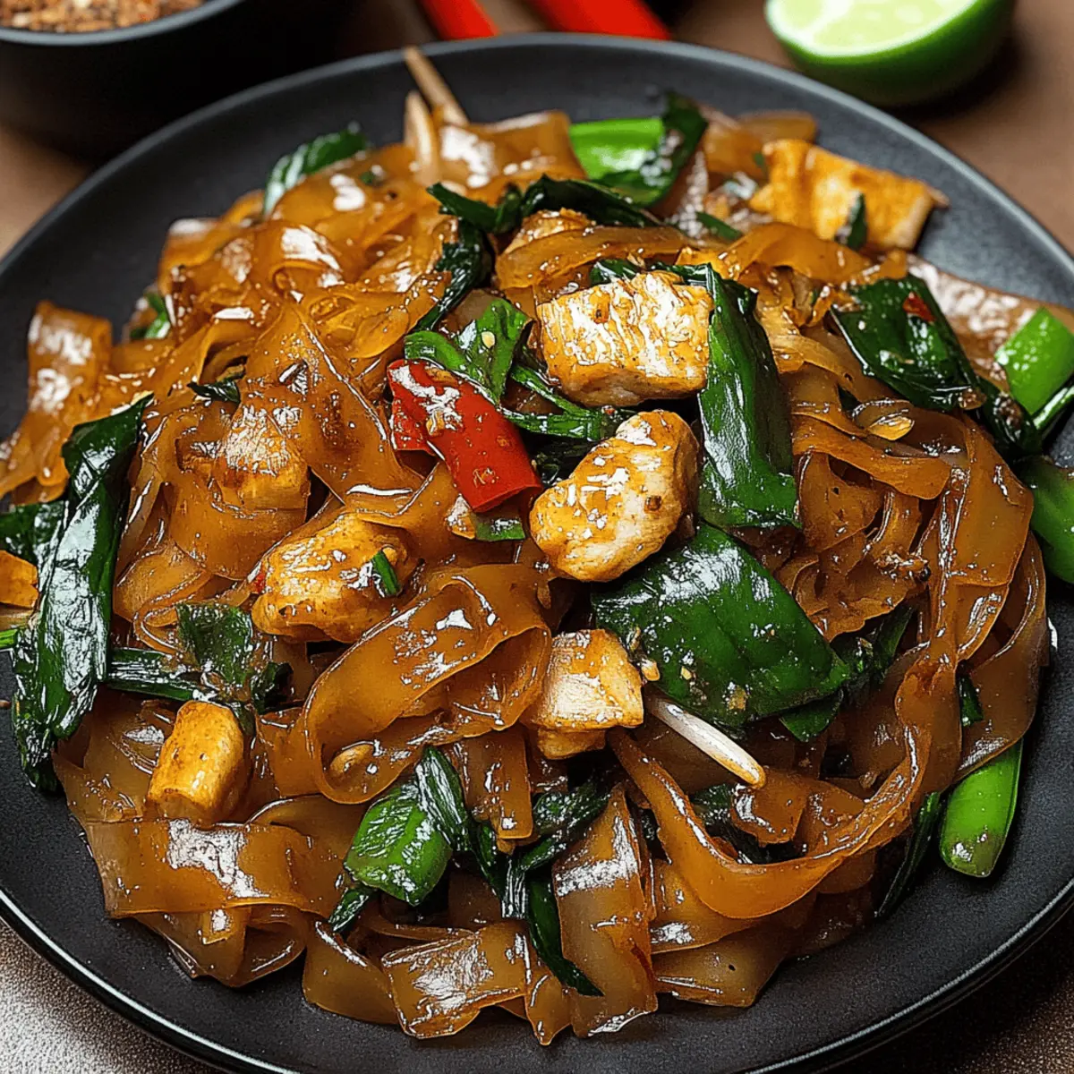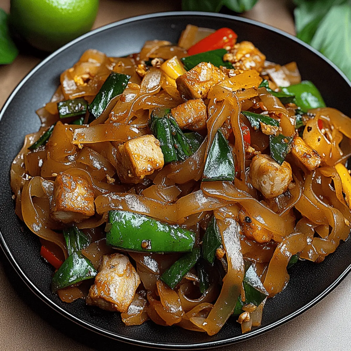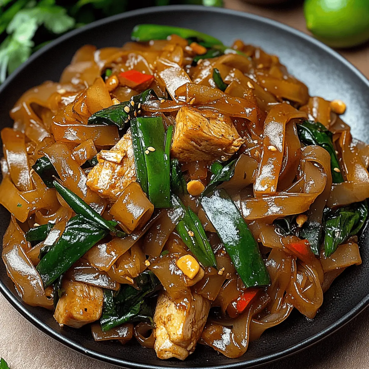Jump to Recipe Print RecipeThe first time I tasted Street Style Thai Drunken Noodles, I felt like I had been transported to a bustling market in Thailand, where the aroma of sizzling garlic mingled with the laughter of friends gathering around a vibrant dish. These quick and flavorful stir-fried noodles can be customized with your favorite protein and seasonal vegetables—making them a versatile meal that’s perfect for busy weeknights or casual gatherings. Ready in under 30 minutes, this dish promises not just amazing flavor but also the joy of creating something special without the fuss. Curious about how to whip up this delightful dish in your kitchen? Let’s dive in! Why Are Thai Drunken Noodles Amazing? Customization: Tailor your Street Style Thai Drunken Noodles with your favorite protein, be it chicken, shrimp, or tofu! Quick Meal: Ready in under 30 minutes, this recipe is perfect for busy weeknights when you crave something delicious yet simple. Vibrant Flavors: The blend of spices and fresh ingredients delivers a mouthwatering experience that transports you straight to Thailand. Crowd-Pleaser: Impress family and friends with a dish that’s not only tasty but also visually stunning with its colorful mix of vegetables. Consider serving it with a refreshing cucumber salad for a complete meal! Fresh Ingredients: By using fresh, seasonal produce, you elevate the dish’s flavor profile, making every bite a reason to savor. You’ll find yourself loving the vibrant taste of homemade noodles even more than takeout. For a further flavor adventure, you might want to check out how to elevate your stir-fry with our Ground Beef Noodles recipe! Street Style Thai Drunken Noodles Ingredients • Get ready for an explosion of flavor! For the Noodles Wide Rice Noodles – Use flat rice noodles like Pad See Ew for the perfect chewy texture in your Street Style Thai Drunken Noodles. For the Cooking Vegetable Oil – This oil is ideal for high-heat stir-frying; consider substituting with sesame oil to deepen the flavor. Garlic (Minced) – Freshly minced garlic adds a fragrant aroma and powerful flavor. For the Protein Proteins (Chicken/Shrimp) – Chicken or shrimp makes for a satisfying protein choice; feel free to swap in tofu for a delightful vegetarian option. For the Vegetables Mixed Vegetables – Colorful fresh vegetables like bell peppers or broccoli not only enhance nutrition but also provide visual appeal; use what’s in season for the best results. For the Sauce Soy Sauce – This essential ingredient adds depth and saltiness; opt for low-sodium soy sauce for a healthier alternative. Sugar – Balances the dish’s flavors perfectly; alternatives like honey can be used as a substitution. Chili Paste – Adjust the heat to your personal preference—this is the magic ingredient that brings excitement to your noodles! Fish Sauce – An authentic flavor enhancer that can be replaced with more soy sauce for a vegetarian twist. Lime Juice – Freshly squeezed lime juice delivers a bright, tangy acidity that brings the dish to life. Step‑by‑Step Instructions for Street Style Thai Drunken Noodles Step 1: Prepare Noodles Begin by bringing a large pot of water to a rolling boil. Once boiling, add the wide rice noodles and cook them until al dente, about 4-5 minutes. Stir occasionally to prevent sticking, then drain the noodles and rinse them under cold water to stop the cooking process. Set the noodles aside, ready for that flavorful mix in your Street Style Thai Drunken Noodles. Step 2: Heat Oil In a large skillet or wok, pour in a tablespoon of vegetable oil and heat over medium-high until the oil shimmers and is almost smoking, usually about 2 minutes. This high heat is crucial for achieving the smoky flavor typical of Street Style Thai Drunken Noodles. Be careful not to let the oil burn; you want it just right to stir-fry the next ingredients. Step 3: Sauté Aromatics Add the minced garlic to the hot oil and sauté for about 1 minute, stirring continuously until the garlic is fragrant and golden but not burnt. This aromatic base is essential, as it will infuse your Street Style Thai Drunken Noodles with a rich flavor. Make sure to keep an eye on it to avoid overcooking. Step 4: Cook Protein Introduce your choice of protein, whether chicken, shrimp, or tofu. Stir-fry for about 3-5 minutes until the chicken is cooked through or the shrimp turns pink and opaque. If using tofu, cook until it’s golden on the edges. This step creates a hearty foundation for your noodles, so ensure everything is nicely browned before moving on. Step 5: Add Vegetables Next, toss in your mixed vegetables, such as bell peppers and broccoli. Stir-fry for about 2 minutes until they become vibrant and just tender, ensuring they maintain a bit of crunch. The colorful vegetables will not only enhance the visual appeal but also add fresh flavors to your Street Style Thai Drunken Noodles. Step 6: Combine Everything Finally, reintroduce the cooked noodles to the skillet along with the soy sauce and sugar. Toss everything together for about 2-3 minutes until the noodles are heated through and evenly coated with the sauce. You’ll want to see that classic stir-fry gloss and the ingredients combined harmoniously. Your Street Style Thai Drunken Noodles are now ready to serve! Expert Tips for Street Style Thai Drunken Noodles Fresh Ingredients: Use fresh, seasonal produce to enhance the flavor of your Street Style Thai Drunken Noodles, ensuring a vibrant taste that outshines takeout. Avoid Overcooking: Aim for al dente noodles; overcooking can lead to a mushy texture. Quickly rinse the noodles with cold water after draining to stop the cooking process. High Heat is Key: Maintain high heat while stir-frying to achieve a smoky flavor reminiscent of street food. Avoid overcrowding the pan to ensure everything cooks evenly. Customize Smartly: Feel free to mix and match proteins and vegetables based on availability and pref