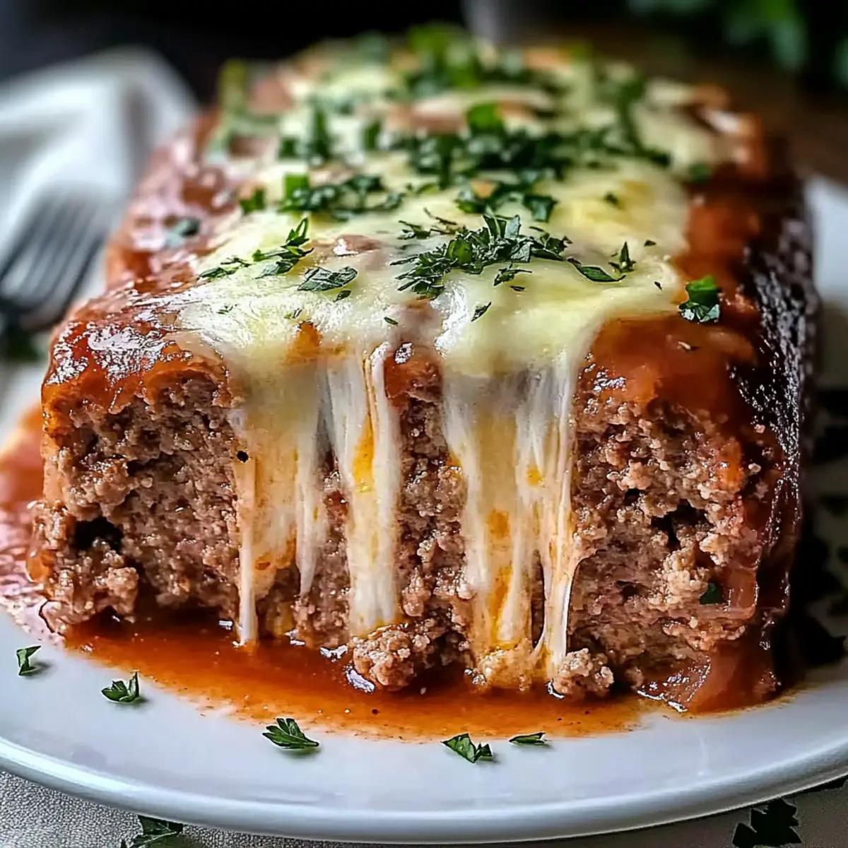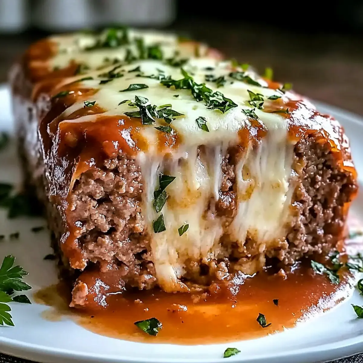 Jump to Recipe Print RecipeThe aroma of a bubbling cheese-filled delight wafting from the oven is nothing short of magical. This Stuffed Meatloaf with Mozzarella redefines comfort food, wrapping classic flavors in a rich, Italian-inspired twist that’s ready to become a family favorite. Imagine digging into a perfectly baked meatloaf, only to discover a melty, gooey mozzarella center that elevates your weeknight dinner into something extraordinary. The recipe is not only delicious but also quick to prepare, making it an easy solution for busy evenings. Plus, it’s a sure crowd-pleaser, guaranteed to satisfy even the pickiest palates at your table. Are you ready to transform your dinner routine and impress everyone with this cheesy masterpiece? Why Is This Meatloaf a Must-Try? Comforting, hearty goodness: This Stuffed Meatloaf with Mozzarella brings warmth and satisfaction to your table, making it a perfect family meal. Cheesy surprise: The melty mozzarella core is a delightful surprise that will have everyone asking for seconds. Quick and easy: With just a few simple steps, you can whip up this delicious dish on a busy weeknight. Versatile variations: Don’t hesitate to personalize the recipe with your choice of seasonings or alternative meats. Leftover love: Enjoy tasty sandwiches with your leftovers, a quick and delicious option for lunch! If you’re looking for more appealing dinner ideas, check out Mozzarella Pepperoni Croissant or a refreshing Spinach Salad Poppy. Stuffed Meatloaf with Mozzarella Ingredients For the Meatloaf • Ground Beef (2 lbs) – Use an 80/20 fat ratio for a juicy texture. • Breadcrumbs (1/2 cup) – Helps bind the meatloaf; substitute with crushed crackers or oats if needed. • Large Eggs (2) – These act as a binder, keeping everything together. • Milk (1/2 cup) – Adds moisture and richness to your stuffed meatloaf. • Onion (1 small, finely chopped) – Provides flavor and moisture that enhances the entire dish. • Garlic (3 cloves, minced) – Adds a savory depth that complements the meat. • Worcestershire Sauce (2 tablespoons) – Boosts umami flavor for an extra punch. • Tomato Paste (1 tablespoon) – Introduces richness and a hint of sweetness. • Salt (1 teaspoon) – A crucial flavor enhancer that ties all ingredients together. • Black Pepper (1/2 teaspoon) – Brings a mild warmth to your favorite comfort food. • Dried Oregano (1 teaspoon) – Infuses that beloved Italian herb flavor into the meatloaf. • Dried Basil (1 teaspoon) – Complements the mozzarella while adding a fresh note. • Shredded Mozzarella (1 1/2 cups) – The star of the dish; this adds a gooey, cheesy filling. Fresh mozzarella can be used if patted dry. For the Glaze • Ketchup (1/3 cup) – Adds sweetness and tang; a must for topping your meatloaf. • Brown Sugar (2 tablespoons) – Balances acidity and provides depth to the glaze. • Balsamic Vinegar (1 tablespoon) – Adds complexity that shouldn’t be skipped for best flavor. Optional Garnish • Chopped Parsley – Freshens up the dish when sprinkled on top before serving. With these ingredients, you’re all set to make the amazing Stuffed Meatloaf with Mozzarella that will bring smiles and satisfaction to the dining table! Step‑by‑Step Instructions for Stuffed Meatloaf with Mozzarella Step 1: Preheat the Oven Begin by preheating your oven to 375°F (190°C). This step is crucial for ensuring that your Stuffed Meatloaf with Mozzarella cooks evenly and thoroughly. While the oven heats, prepare a baking sheet lined with foil or parchment paper, or lightly grease a loaf pan with nonstick spray to make cleanup easier. Step 2: Combine Ingredients In a large mixing bowl, combine the ground beef, breadcrumbs, eggs, milk, finely chopped onion, minced garlic, Worcestershire sauce, tomato paste, and seasonings. Using your hands, mix gently until just combined, being careful not to overmix, which can toughen the meatloaf. Aim for a uniform mixture without visible lumps. Step 3: Shape the Meatloaf Take half of the meat mixture and shape it into a rectangular loaf on a clean surface or place it in the prepared loaf pan. Make a trench in the center to create a pocket for the magic that is the mozzarella. Ensure the loaf is compact yet maintains rounded edges for even cooking. Step 4: Add the Mozzarella Generously fill the trench in the meatloaf with shredded mozzarella. This cheesy filling will be the star of your dish! Afterward, take the remaining meat mixture and cover the mozzarella pocket, sealing the edges well to prevent leakage during baking. Ensure the meatloaf has a smooth surface for the glaze. Step 5: Prepare the Glaze In a small bowl, mix together the ketchup, brown sugar, and balsamic vinegar to create a luscious glaze. This mixture will add a sweet and tangy finish to your Stuffed Meatloaf with Mozzarella. Brush a generous coating over the loaf, reserving a bit to serve on the side for those who like extra flavor. Step 6: Bake the Meatloaf Place the meatloaf in the preheated oven and bake for 50-60 minutes. Check for doneness using a meat thermometer; the internal temperature should reach 160°F (71°C). If the top browns too quickly, tent it with foil to prevent burning while allowing the inside to cook through. Step 7: Rest the Meatloaf Once baked, remove the Stuffed Meatloaf with Mozzarella from the oven and let it rest for about 10 minutes. This crucial step helps the flavors meld and keeps the meat moist. As it rests, the cheese will stay intact, making slicing easier and preventing the gooey goodness from spilling out. Step 8: Slice and Serve After resting, carefully slice the meatloaf into serving pieces. Each slice should reveal a delightful flow of melted mozzarella at the center. Serve warm, optionally garnished with chopped parsley, and enjoy the comforting, cheesy delight this dish brings to your family meal! What to Serve with Stuffed Meatloaf with Mozzarella Transform your c
