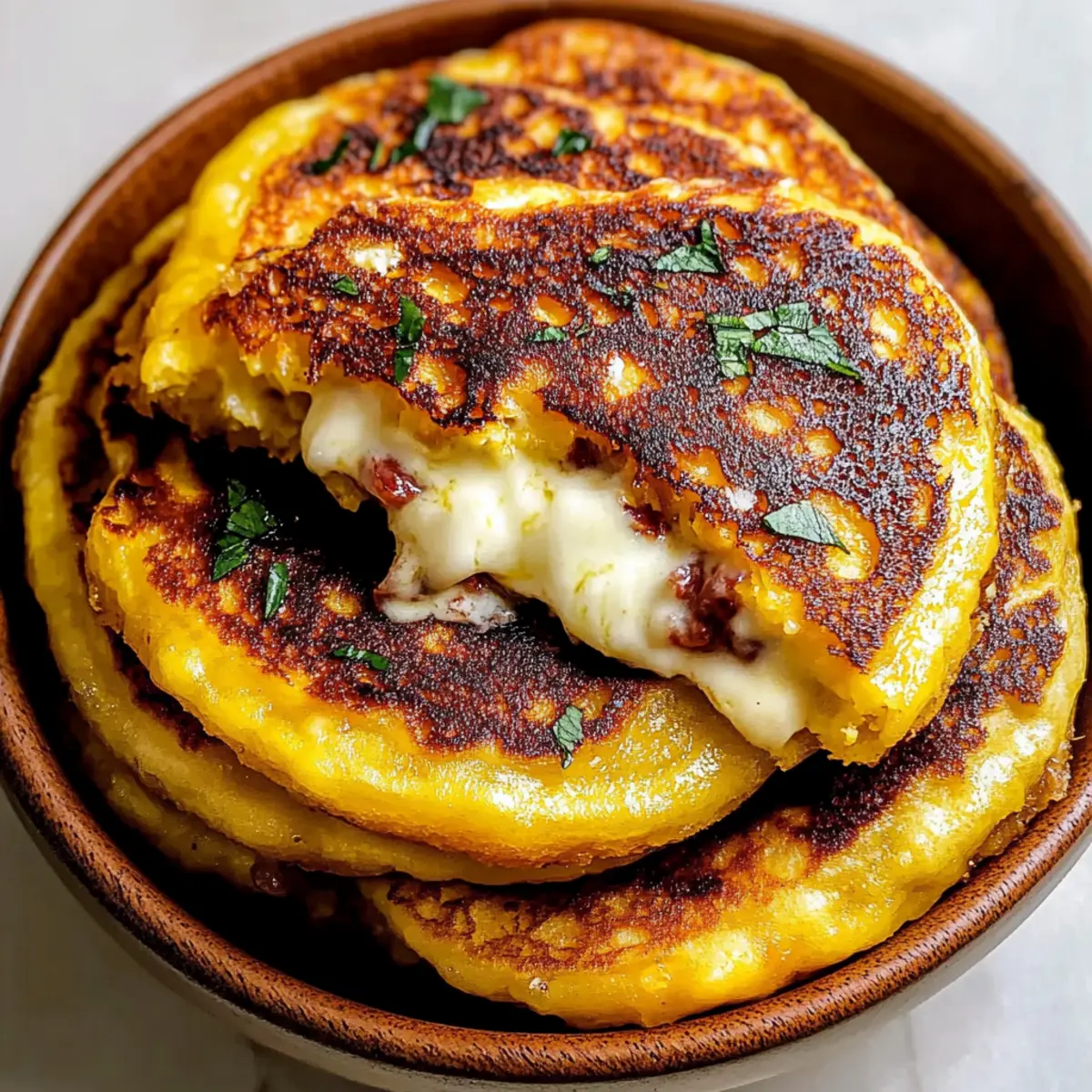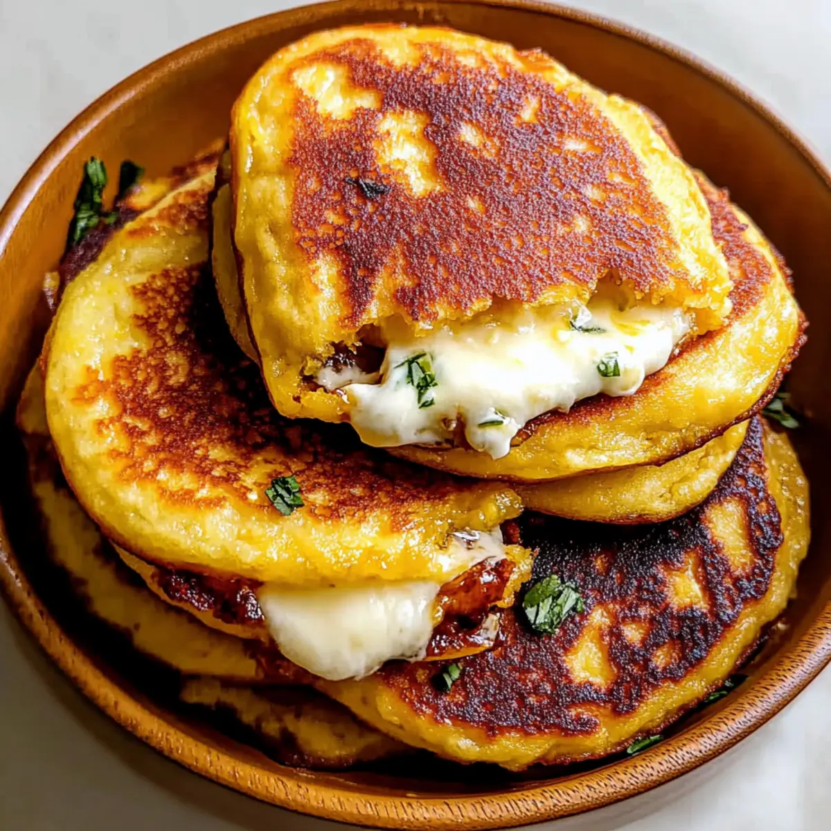 Jump to Recipe Print RecipeAs I stood in my kitchen, the sweet aroma of golden corn sizzling on the skillet swept me away to the vibrant streets of Venezuela. I couldn’t help but feel excited to share my latest culinary discovery: Sweet Corn Cachapas, a comforting delight that’s perfect for any meal of the day. With their tender, fluffy texture and warm, melted mozzarella filling, these pancakes create a heavenly balance of sweet and savory. Not only are they a breeze to whip up, but they also offer a hearty, vegetarian option that will impress anyone at your table. Whether you’re seeking a cozy breakfast, a satisfying lunch, or a fun snack to share, these cachapas are sure to become a family favorite. Curious to learn how to make them? Let’s get started on an adventure in flavor! Why Will You Love Sweet Corn Cachapas? Comforting Flavors: Every bite brings together the sweet, sunny taste of corn and the comforting melt of mozzarella, creating a dish that’s truly satisfying. Quick and Easy: With simple steps, you can whip up these delightful pancakes in no time—perfect for those busy mornings or spontaneous lunch cravings! Versatile Serving Ideas: Serve them with crispy bacon or top with a drizzle of honey for a unique twist, making them suitable for breakfast, lunch, or dinner. Vegetarian Delight: These cachapas are ideal for anyone craving a hearty vegetarian meal, proving that comfort food can be delicious and healthy! Crowd-Pleaser: Friends and family will be lining up for seconds when they experience the rich flavor and delightful texture of these Venezuelan treats! Ready to elevate your meal with these scrumptious cachapas? Pair them with a dipping sauce or fresh avocado for a complete taste sensation! Sweet Corn Cachapas Ingredients • You’ll need these essential ingredients to create your delicious Sweet Corn Cachapas! For the Batter Sweet Corn – Provides signature tenderness and sweetness; fresh or thawed frozen corn is best, while canned corn should be avoided. Egg – Acts as a binder and adds richness to the batter. All-Purpose Flour – Adds structure to the pancakes; you can use gluten-free flour for a gluten-free version. Salt – Enhances flavor without substitutions. Granulated Sugar – Adds sweetness; a splash of honey can lend an extra floral touch. Vegetable Oil – Essential for frying, adding richness and aiding in that perfect golden crust. For the Cheese Filling Buffalo Mozzarella – This classic filling melts beautifully for a gooey center; alternatives include queso de mano or queso fresco, or use plant-based cheese for a dairy-free option. For Serving Unsalted Butter – Adds flavor and richness when topped on warm cachapas; no substitutions suggested. Gather these ingredients, and you’ll be on your way to creating comforting Sweet Corn Cachapas that everyone will adore! Step‑by‑Step Instructions for Sweet Corn Cachapas Step 1: Blend the Batter Begin by adding the sweet corn, egg, flour, salt, and sugar into a blender. Blend on medium speed until mostly smooth, aiming for a consistency that retains some corn texture for that delightful bite. This should take about 30-60 seconds. Once finished, pour the batter into a mixing bowl and set it aside to rest for about 10 minutes while you prepare to cook. Step 2: Heat the Skillet Place a non-stick skillet or frying pan over medium heat and allow it to warm up for about 2 minutes. Add a drizzle of vegetable oil to the skillet, ensuring it coats the bottom evenly. You want the oil shimmering but not smoking, which indicates it’s hot enough for frying. Step 3: Cook the Cachapas Using a measuring cup, spoon approximately 60 ml (¼ cup) of the batter into the hot skillet. Gently spread the batter into a circle about 4-5 inches wide. Cook for 3-4 minutes until the edges appear set and the bottom is golden brown. Flip it over carefully, cooking the other side for an additional 3-4 minutes until it also turns a lovely golden color. Step 4: Add the Cheese Once the cachapa is cooked, place a generous amount of buffalo mozzarella in the center of the pancake. Fold it in half and allow the residual heat from the cachapa to melt the cheese, which should take about 1-2 minutes. The cheese must be silky and gooey, adding to the overall comfort of these Sweet Corn Cachapas. Step 5: Serve Warm Remove the cachapa from the skillet and immediately top it with a pat of unsalted butter, allowing it to melt into the warm pancake. Serve your Sweet Corn Cachapas immediately while they’re hot and fresh. They can be enjoyed as-is or accompanied by a dipping sauce or additional toppings like avocado, sweet syrup, or crispy bacon. What to Serve with Sweet Corn Cachapas? The perfect complement can elevate a delicious meal, creating a full dining experience that tantalizes the senses. Creamy Avocado Salad: Fresh, buttery avocado mixed with lime and cilantro provides a creamy contrast to the warm cachapas. You’ll love how the flavors dance together! Tangy Greek Yogurt Sauce: A dollop of tangy yogurt mixed with herbs adds a refreshing zest, balancing the sweetness of the corn perfectly. This adds a delightful creaminess that invites a second helping. Spicy Salsa: A fresh and zesty salsa made from tomatoes, onions, and jalapeños brightens up the dish and adds a kick. The combination of flavors will awaken your taste buds! Sweet Plantains: Fried or baked sweet plantains add a lovely sweetness and a slight crunch, harmonizing with the savory notes of cachapas. Each bite is a delightful dance of textures! Crispy Bacon or Ham: The addition of crispy bacon or thinly sliced ham brings a salty crunch that contrasts beautifully with the sweet corn pancakes. It’s a classic pairing that feels indulgent! Light Tropical Fruit Salad: A refreshing tropical fruit salad with pineapple, mango, and berries brings brightness and sweetness, enhancing the overall dining experience. It’s a fruity burst that’s simply irresistible! Hot C