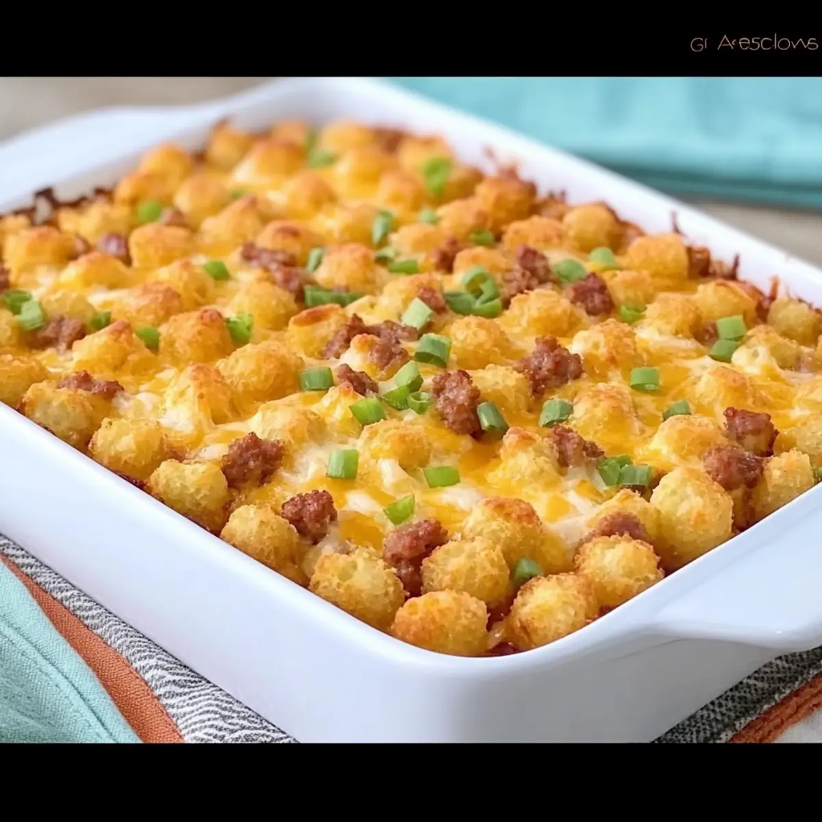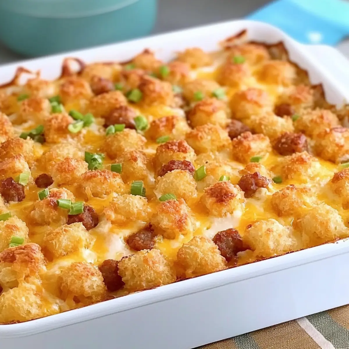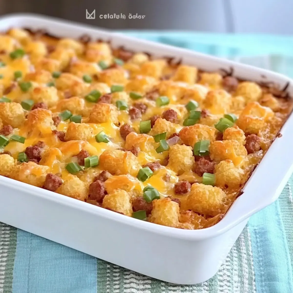 Jump to Recipe Print RecipeThere’s something magical about waking up to the tantalizing aroma of a hearty breakfast wafting through the house, and that was my first thought when I made this Cheesy Make-Ahead Tater Tot Breakfast Casserole. Featuring crispy tater tots and rich, savory sausage, this dish transforms regular mornings into something extraordinary. It’s not just a crowd-pleaser for holiday gatherings; it’s also a game-changer for busy weekdays, allowing you to prep ahead and enjoy each bite with ease. Plus, it’s freezer-friendly, so you can savor that cheesy comfort anytime the craving strikes. Intrigued by how this delightful casserole can become a staple in your kitchen? Let’s dive into the recipe and discover the joy of this delicious morning delight! Why is this Tater Tot Casserole a Must-Try? Versatile and Adaptable: This Tater Tot Breakfast Casserole can be tailored to your tastes! Opt for a classic oven-baked version or whip it up in an air fryer for a quicker cook time. Make-Ahead Convenience: Perfect for busy mornings, prepare it in advance, and simply pop it in the oven when you’re ready. It’s hassle-free whether you’re hosting a holiday brunch or enjoying a cozy weekend breakfast. Hearty and Satisfying: Loaded with rich flavors from sausage and cheese, every bite brings comfort. Need more veggies? Toss in your favorites like spinach or peppers for added nutrition! Crowd-Pleasing Appeal: This dish is certain to impress guests and family alike. It’s hearty enough to keep everyone satisfied and is sure to be a favorite at any gathering. Freezer-Friendly Option: Want to enjoy cheesy goodness whenever the craving strikes? This casserole can be assembled in advance and stored in the freezer for an easy meal later on! Experience the delicious comfort of this casserole paired with flavors similar to those in a Skillet Breakfast Hash or a loaded Broccoli Casserole for a satisfying start to your day! Tater Tot Breakfast Casserole Ingredients For the Base Ground Breakfast Sausage – Provides a savory base; consider swapping with ground turkey for a lighter option. Large Eggs – Binds the casserole together; essential for structure, no substitutes recommended. Whole Milk – Moistens the dish; skim or unsweetened almond milk works well for calorie-conscious or dairy-free diets. For Flavor Shredded Sharp Cheddar Cheese – Adds rich flavor; feel free to use Monterey Jack for a milder taste. Onion Powder – Contributes depth; you can opt for fresh onions if you prefer. Pepper – Enhances flavor; adjust to your liking or add a dash of cayenne for a spicy kick. Salt – Balances flavors; sea salt or kosher salt can serve as alternatives. For the Topping Frozen Tater Tots – Creates a crispy topping; homemade or fresh tater tots can be substituted, adjusting cook times as needed. Cooked Bacon – Adds smokiness; turkey bacon is a leaner option, or simply skip it for a vegetarian delight. Green Onions – Gives a fresh finish; easily replace with chives for a similar taste. Unlock the potential of this Tater Tot Breakfast Casserole and enjoy a meal that’s not only delectable but also a breeze to prepare for any occasion! Step‑by‑Step Instructions for Cheesy Tater Tot Breakfast Casserole Step 1: Cook the Sausage In a large skillet over medium-high heat, brown 1 pound of ground breakfast sausage for about 5-7 minutes, breaking it up as it cooks until it’s no longer pink. Once browned, drain any excess grease and spread the sausage evenly in a greased 9×13-inch baking dish, forming the savory base of your Tater Tot Breakfast Casserole. Step 2: Add Cheese Sprinkle 2 cups of shredded sharp cheddar cheese over the browned sausage, ensuring even distribution. This cheesy layer will melt and blend with the sausage during baking, creating a deliciously rich flavor. With the cheese in place, you’re ready to proceed to the egg mixture for extra creaminess in your casserole. Step 3: Whisk Eggs and Milk In a medium bowl, whisk together 6 large eggs, 1 cup of whole milk, 1 teaspoon of pepper, 1 teaspoon of onion powder, and 1 teaspoon of salt until the mixture is smooth and well combined. Pour this egg mixture gently over the cheese and sausage layers in the baking dish, ensuring every corner is coated for a hearty Tater Tot Breakfast Casserole. Step 4: Layer Tater Tots Evenly layer a bag of frozen tater tots over the top of the egg mixture, arranging them in a single layer for optimal crispiness. This will create a deliciously golden topping that will finish your casserole perfectly. Once the tater tots are nicely positioned, it’s time to bake. Step 5: Bake the Casserole Preheat your oven to 350°F (175°C) and bake the casserole uncovered for about 35 minutes. You’ll know it’s done when the edges are bubbling and the tater tots are golden brown. This baking step allows the flavors to meld beautifully, making your Tater Tot Breakfast Casserole irresistible. Step 6: Add Toppings Once the casserole is cooked, remove it from the oven carefully. Sprinkle the remaining 1 cup of cheddar cheese and crumbled cooked bacon over the top. Return the casserole to the oven for an additional 5-10 minutes until the cheese is melted and bubbly, which adds a deliciously decadent finish to your dish! Step 7: Let it Rest and Garnish After baking, let the casserole rest for 10 minutes before slicing and serving. This resting period helps the casserole set perfectly and makes it easier to cut. Finally, garnish with sliced green onions for a fresh touch that complements the cheesy, hearty flavors of your Tater Tot Breakfast Casserole. Tater Tot Breakfast Casserole Variations Feel free to let your creativity shine by customizing this delicious casserole to suit your taste buds! Dairy-Free: Substitute whole milk with unsweetened almond milk and use dairy-free cheese for a creamy, guilt-free option. Plant-based eaters will appreciate this twist that makes it inclusive for everyone. V