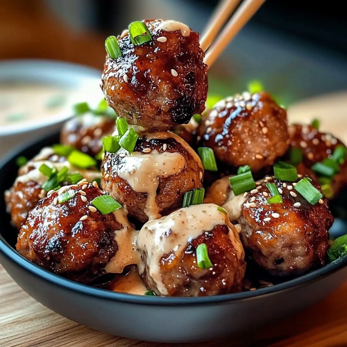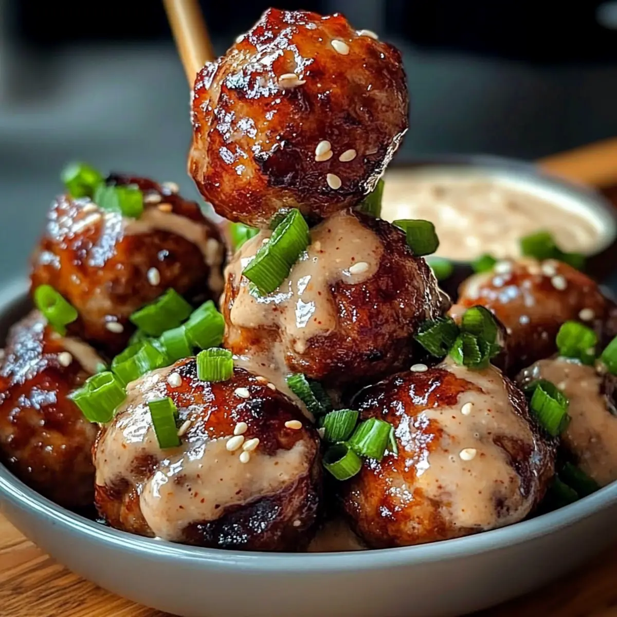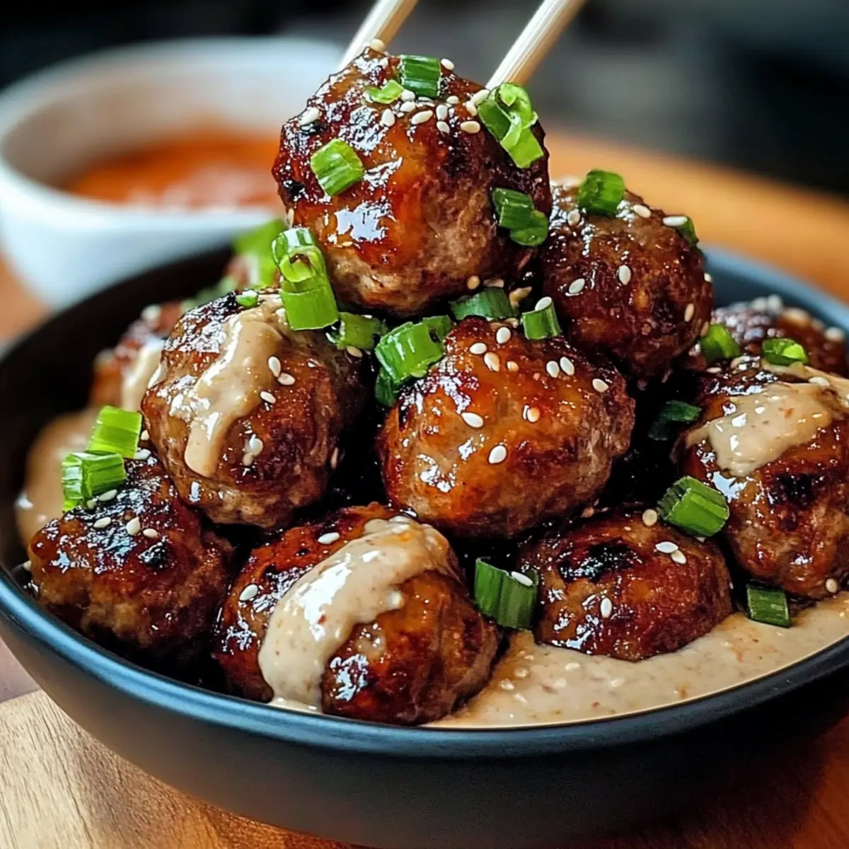 Jump to Recipe Print RecipeAs I stood in my kitchen, the scent of garlic and ginger wafting through the air, a craving for something different hit me like a bolt of inspiration. I was about to embark on a delicious journey with my Tender Korean BBQ Meatballs, a recipe that’s not just easy to whip up, but also an absolute crowd-pleaser. With their juicy, sticky texture coated in a rich BBQ glaze and paired with a cool spicy mayo dip, they make for the ideal appetizer or a standout dinner option any day of the week. Plus, they’re great for meal prep, effortlessly cooling down to become perfect leftovers for lunches or snacks. Curious to learn how to make these Korean-inspired delights? Let’s dive in! Why Are These Meatballs a Must-Try? Irresistible Flavor: The blend of garlic, ginger, and gochujang creates a savory profile that’s both exciting and addictive. Effortlessly Simple: Prepare this dish using just a few pantry staples, making it accessible for everyone – beginners and seasoned cooks alike! Perfect for Any Occasion: Serve as a chic appetizer at your next gathering, or over rice for a comforting weeknight dinner. Meal Prep Champion: Easily whip up a double batch to ensure tasty lunches throughout the week. These meatballs are perfect cold or reheated! Customization Options: Feel free to switch up ingredients or dipping sauces to fit your taste—check out my Hawaiian BBQ Chicken for more delicious ideas! Tender Korean BBQ Meatball Ingredients For the Meatballs • Ground Beef – Provides rich flavor and juicy texture; substitute with ground chicken or turkey for a leaner version. • Breadcrumbs – Add structure to the meatballs; ensure they’re fresh for the best binding. • Large Egg – Binds ingredients together; no suitable substitute available for this recipe. • Garlic (minced) – Enhances overall flavor; fresh garlic is recommended for optimal taste. • Fresh Ginger (grated) – Adds warmth and depth; can substitute with 1/2 teaspoon ground ginger if fresh is unavailable. • Green Onions (sliced) – Provides a fresh and mild onion flavor; can use chives as an alternative. • Soy Sauce – Adds umami and saltiness; use low-sodium soy sauce for a healthier option. • Sesame Oil – Introduces nutty notes; substitute with olive oil for a different flavor profile, but sesame oil is preferred for authenticity. • Brown Sugar – Balances the savory flavors with sweetness; can use coconut sugar as a substitute. • Gochujang (Korean chili paste) – Infuses heat and umami; substitute with a mix of miso and chili flakes for a different profile if unavailable. • Rice Vinegar – Adds acidity and brightness; can use white vinegar as a substitute. For the Spicy Mayo Dip • Honey – Provides sweetness and glaze; maple syrup can be used as a substitute. • Mayonnaise – Creates a creamy texture for the dip; substitute with Greek yogurt for a lighter version. • Sriracha (or hot sauce) – Adds heat to the dip; adjust the amount to taste based on spice preference. • Salt and Pepper – Essential for seasoning; adjust to taste. These Tender Korean BBQ Meatballs are not only flavorful but also effortlessly simple to make. Dive into your cooking adventure with these delectable ingredients! Step‑by‑Step Instructions for Tender Korean BBQ Meatballs Step 1: Preheat the Oven Begin by preheating your oven to 400°F (200°C). This will ensure that your Tender Korean BBQ Meatballs cook evenly and reach that perfect golden-brown hue. While the oven warms up, gather all your ingredients and equipment, such as a large mixing bowl and a parchment-lined baking sheet. Step 2: Prepare the Meatball Mixture In a large bowl, combine the ground beef, breadcrumbs, egg, minced garlic, grated ginger, sliced green onions, soy sauce, sesame oil, salt, and pepper. Mix gently with your hands or a spoon until just combined, being careful not to overwork the mixture. This way, your meatballs will maintain a tender texture after baking. Step 3: Shape the Meatballs With your hands, form the mixture into 1 to 1.5-inch balls, each roughly the size of a golf ball. Place the shaped meatballs on your prepared baking sheet, making sure they are evenly spaced to allow for even cooking. This step creates those delightful little bites that everyone will love at your gathering or dinner. Step 4: Bake the Meatballs Transfer the baking sheet to your preheated oven and bake the meatballs for 18-20 minutes. You’ll know they are done when they are browned and cooked through, with an internal temperature reaching 160°F (70°C). This crucial step caramelizes the outside while keeping the inside juicy and flavorful. Step 5: Make the Glaze While the meatballs are baking, prepare the glaze by combining gochujang, soy sauce, brown sugar, rice vinegar, and honey in a saucepan. Heat over medium-low until the mixture comes to a gentle simmer. Stir occasionally for 3-5 minutes, allowing it to thicken slightly and develop sweet-and-spicy flavors that perfectly complement your meatballs. Step 6: Glaze the Meatballs Once the meatballs are fully cooked, carefully remove them from the oven and transfer them to a large bowl. Pour the warm glaze over the hot meatballs and gently toss until they are evenly coated. This step adds a sticky, irresistible layer of flavor that makes your Tender Korean BBQ Meatballs truly special. Step 7: Prepare the Spicy Mayo Dip In a small bowl, mix mayonnaise with sriracha and an optional drizzle of sesame oil. Adjust the spice levels to your preference by adding more sriracha for an extra kick. This creamy dip will balance the heat from the meatballs, enhancing your overall tasting experience. Step 8: Serve and Enjoy Plate the glazed meatballs, garnishing with sesame seeds and additional sliced green onions for a vibrant presentation. Serve them warm alongside the spicy mayo dip. Whether as a tasty appetizer or a charming main course, these Tender Korean BBQ Meatballs are sure to 