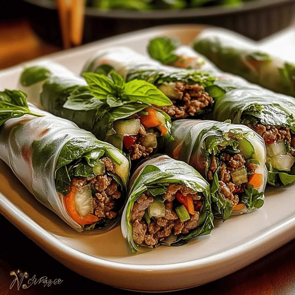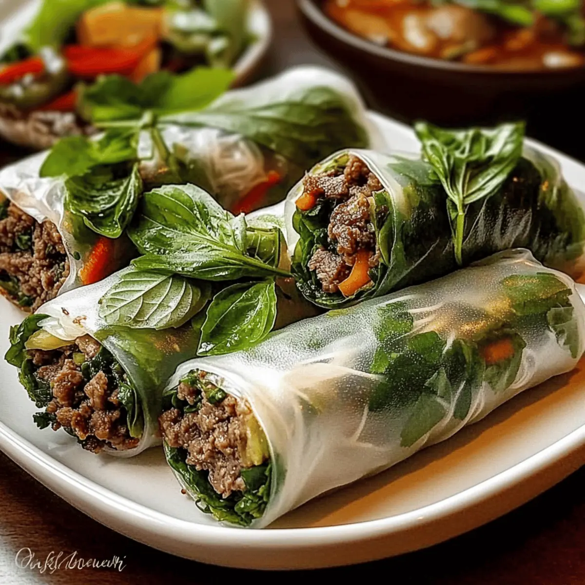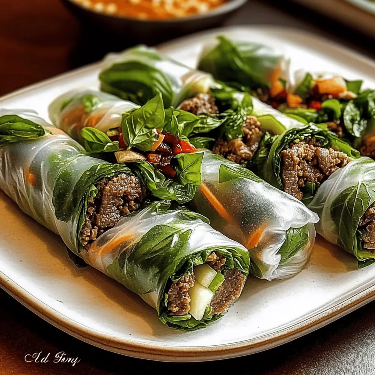 Jump to Recipe Print RecipeThe aroma of sizzling garlic and tender beef filled my kitchen as I embarked on a culinary adventure that whisked me straight to the vibrant markets of Thailand. These Thai Basil Beef Rolls bring a burst of flavor and a touch of adventure to your dining table, all in just 30 minutes! With their gluten-free rice paper and a filling that’s completely customizable, they’re perfect for any occasion—whether you’re hosting friends or just indulging on a busy weeknight. Each bite offers a delightful contrast of freshness from the herbs and savory depth from the beef, making them an effortless crowd-pleaser. Ready to roll up these tasty delights and impress your loved ones? Let’s dive into this delicious recipe together! Why make Thai Basil Beef Rolls? Quick and Easy: Whip up these Thai Basil Beef Rolls in just 30 minutes, making dinner stress-free! Flavor Explosion: Enjoy a delightful mix of fragrant herbs and juicy beef that will transport your taste buds to Thailand. Customizable: Tailor the filling to your preferences—try adding your favorite veggies or swapping beef for tofu. Gluten-Free Delight: These wraps are perfect for those with dietary restrictions, allowing everyone to enjoy them! Perfect for Any Occasion: Whether it’s a casual dinner or a special gathering, these colorful rolls are sure to impress. Pair them with a side like Mongolian Ground Beef for a well-rounded meal! Thai Basil Beef Rolls Ingredients • Get ready to gather what you need! For the Filling • Vegetable Oil – Adds fat for sautéing and flavor; any neutral oil works well. • Garlic (3 cloves, minced) – Provides aromatic depth; fresh garlic is highly recommended. • Shallot (1 small, finely chopped) – Adds sweetness and mild onion flavor; can be substituted with onion if needed. • Ground Beef (1 pound, 85/15) – Main protein source, offers flavor and richness; go for leaner beef with added moisture if desired. • Soy Sauce (2 tablespoons) – Brings umami and saltiness; tamari is a great gluten-free option. • Oyster Sauce (1 tablespoon) – Adds sweetness and depth; can be swapped for a plant-based sauce for a vegan alternative. • Brown Sugar (1 teaspoon) – Balances flavors with a touch of sweetness; consider using honey or maple syrup if preferred. • Lime Juice (1 tablespoon) – Enhances flavor and provides acidity; fresh lime is the best choice. • Chili Flakes (1/2 teaspoon or 1 minced Thai chili) – Adds heat; feel free to adjust according to your taste. • Fresh Thai Basil Leaves (1 cup, chopped) – Provides vibrant freshness and key flavor; mint or cilantro can be used instead if desired. For Rolling • Rice Paper Wrappers (8 to 10) – Encasses your filling; Vietnamese-style wrappers are recommended for a light texture. • Optional Vegetables (1/2 cup) – Enhance flavor and texture with veggies like mint, cilantro, green onion, carrots, or cucumbers. These delicious Thai Basil Beef Rolls are ready to bring incredible freshness to your table! Step‑by‑Step Instructions for Thai Basil Beef Rolls Step 1: Sauté Aromatics In a skillet, heat 2 tablespoons of vegetable oil over medium heat for about 1 minute. Once warm, add 3 cloves of minced garlic and 1 finely chopped shallot, sautéing them until fragrant and translucent, about 2-3 minutes. The inviting aroma will fill your kitchen, setting the stage for your Thai Basil Beef Rolls. Step 2: Brown the Beef Add 1 pound of ground beef to the skillet, breaking it apart as it cooks. Stir frequently for 5-7 minutes until the beef is fully browned and no longer pink. This step not only creates a lovely depth of flavor but also ensures your filling is tender and delicious, ready to shine in your rolls. Step 3: Add Seasonings Once the beef is browned, stir in 2 tablespoons of soy sauce, 1 tablespoon of oyster sauce, 1 teaspoon of brown sugar, and ½ teaspoon of chili flakes. Allow the mixture to simmer for 2-3 minutes. You’ll want it to become glossy and well-combined, enhancing the savory notes that will flavor your Thai Basil Beef Rolls. Step 4: Incorporate Fresh Ingredients Remove the skillet from heat and mix in 1 tablespoon of lime juice and 1 cup of chopped fresh Thai basil leaves. Allow the mixture to cool slightly; this is vital before rolling. The fresh basil adds vibrancy and ensures that your filling is aromatic and full of zing. Step 5: Prepare the Rolling Station Fill a shallow bowl with warm water and gather your rice paper wrappers and the beef filling. Set up your workspace with a clean, damp surface to roll the Thai Basil Beef Rolls. This preparation will streamline the rolling process and help your wrappers stay moist and pliable. Step 6: Soak the Rice Paper Take a rice paper wrapper and dip it into the warm water for about 5-10 seconds until it becomes flexible. Be cautious not to oversoak, as too much water can cause tearing. Lay the softened wrapper flat on your damp surface, and you’re ready for the delicious filling! Step 7: Fill the Wrapper Place a spoonful of the beef filling, along with any optional vegetables like mint or carrot, near the bottom of the wrapper. Keeping the filling compact will make rolling easier and ensures that each bite of your Thai Basil Beef Rolls is satisfying and flavorful. Step 8: Roll It Up Fold the bottom of the rice paper over the filling, tucking in the sides snugly, and roll it tightly away from you. The goal is to create a neat package that encloses the savory goodness. Repeat this process for the remaining wrappers and filling, enjoying the rhythmic repetition. Step 9: Arrange and Serve Once all your Thai Basil Beef Rolls are rolled, place them on a serving platter. It’s ideal to slice them in half for visual appeal and easier eating. Pair with your favorite dipping sauce, such as a tangy fish sauce or a sweet chili sauce, to complement the vibrant flavors of the rolls. Step 10: Enjoy Your Creation Serve your Thai Basil Beef Rolls fresh