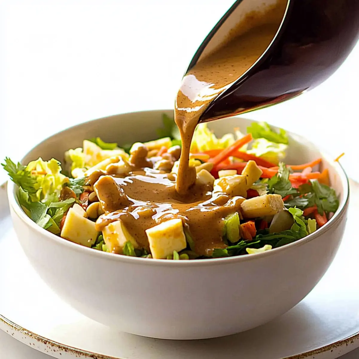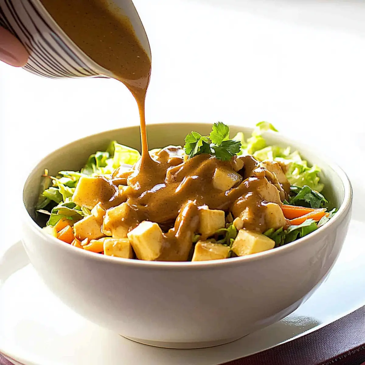 Jump to Recipe Print RecipeAs I whisked together the rich ingredients for my Quick and Easy Vegan Thai Peanut Sauce, a wave of nostalgia hit me—reminding me of vibrant street markets in Thailand, where the air is filled with tantalizing aromas. This Thai salad dressing seamlessly combines creaminess and zing, bringing your favorite dishes to life in just 5 minutes. Not only is it a speedy culinary solution for salad lovers seeking fresh flavors, but it’s also a guilt-free dressing that caters to everyone—from vegan enthusiasts to health-conscious eaters. With every drizzled bite, you’ll experience an explosion of taste, all without the need for added sugars! Are you ready to elevate your salads and wraps with this homemade delight? Why is Thai Salad Dressing so special? Quick Preparation: Whip up this dressing in just 5 minutes, making it a perfect last-minute addition to any meal. Vibrant Flavor: Each drizzle bursts with a tangy, umami-rich profile that transforms ordinary salads into extraordinary dishes. Health-Conscious Choice: Enjoy peace of mind with a vegan-friendly recipe that contains no added sugars, perfect for those seeking healthier options. Versatile Uses: This dressing isn’t just for salads; try it as a dip for spring rolls or a zesty drizzle over grilled vegetables. Customizable: Easily adapt it to your taste—mix in sriracha for heat or substitute peanut butter with tahini for a new twist. Dive into this delectable dressing to experience flavors that resonate with freshness, much like a taste of the streets of Thailand! For more delicious salad inspirations, check out my Strawberry Spinach Salad or try the refreshing Watermelon Berry Salad as a delightful pairing. Thai Salad Dressing Ingredients For the Base • Peanut Butter – Provides a creamy foundation and nutty flavor; choose creamy or crunchy based on your texture preference. • Water – Adjusts the thickness of the dressing; use ½ cup for a thicker consistency or ¾ cup for a lighter one. • Low Sodium Soy Sauce – Adds essential umami; regular soy sauce can be substituted if needed. For Sweetness & Acidity • Agave Nectar – Offers a gentle sweetness without added sugars; honey can be used as a substitute if preferred. • Apple Cider Vinegar or Rice Vinegar – Contributes the acidity that brightens flavors; adjust according to your taste. • Lime Juice – Instantly freshens the dressing with a citrus kick. For Flavor Boost • Fresh Ginger – Introduces a warm, spicy flavor; always opt for fresh for the best impact. • Garlic – Adds aromatic depth; fresh cloves are recommended for optimum taste. • Sesame Oil – Offers a nutty undertone; optional depending on your flavor preferences. For Garnishing • Fresh Cilantro – Imparts a refreshing herbal note; great as a garnish to enhance the dressing’s presentation. With these delightful ingredients, you’ll whip up a Thai salad dressing that brings joy to any meal! Step‑by‑Step Instructions for Quick and Easy Vegan Thai Peanut Sauce Step 1: Gather Ingredients Start by assembling all your ingredients for the Thai salad dressing. You’ll need peanut butter, water, agave nectar, low sodium soy sauce, apple cider vinegar or rice vinegar, lime juice, grated fresh ginger, minced garlic, and optional sesame oil and fresh cilantro. Make sure your ingredients are fresh for the best flavor. Step 2: Combine Ingredients In a high-speed blender or food processor, add 1/2 cup of peanut butter, 1/2 to 3/4 cup of water (depending on desired thickness), 2 tablespoons of agave nectar, 3 tablespoons of low sodium soy sauce, 2 tablespoons of vinegar, the juice of one lime, a teaspoon of freshly grated ginger, and a clove of minced garlic. If using, add a teaspoon of sesame oil for extra nuttiness. Step 3: Blend Until Smooth Secure the lid on your blender or processor and blend the mixture on high speed for about 30 seconds to 1 minute. Keep blending until the Thai salad dressing is completely smooth and creamy with no lumps. You may need to stop occasionally and scrape down the sides with a spatula to ensure an even blend. Step 4: Adjust Consistency and Flavor After blending, taste your Thai peanut sauce. If it’s too thick, slowly pour in a little more water until you reach your desired consistency. You can also adjust the sweetness with more agave nectar or acidity with additional vinegar or lime juice, all while blending to combine. Step 5: Transfer and Store Once you are satisfied with the taste and texture, transfer the Thai salad dressing into a tightly-sealed jar or container. Store it in the refrigerator for up to a week. The flavors will deepen as it sits, making each use even more flavorful! Step 6: Serve and Enjoy When ready to use, give your dressing a good shake or stir to reincorporate any settled ingredients. Drizzle it generously over salads, use it as a dip for spring rolls, or drizzle it over grilled vegetables or proteins for a zesty flavor boost. Enjoy the homemade goodness! Expert Tips for Thai Salad Dressing • Use Fresh Ingredients: Ensure all ingredients, especially ginger and garlic, are fresh to achieve the best flavor profile in your Thai salad dressing. • Blend Thoroughly: To avoid any lumps and create a smooth, creamy consistency, blend the mixture thoroughly until all ingredients are well combined. • Taste as You Go: Adjust sweetness and acidity to your preference by tasting the dressing during preparation; this helps create a flavor that you’ll love. • Control Thickness: If the sauce is too thick, incrementally add more water while blending until you reach your desired consistency. • Experiment with Flavors: Don’t hesitate to customize your Thai salad dressing by adding chili flakes or substituting peanut butter with tahini for a unique twist! How to Store and Freeze Thai Salad Dressing Fridge: Store your Thai salad dressing in an airtight container in the refrigerator for up to 1 week. The flavors will 