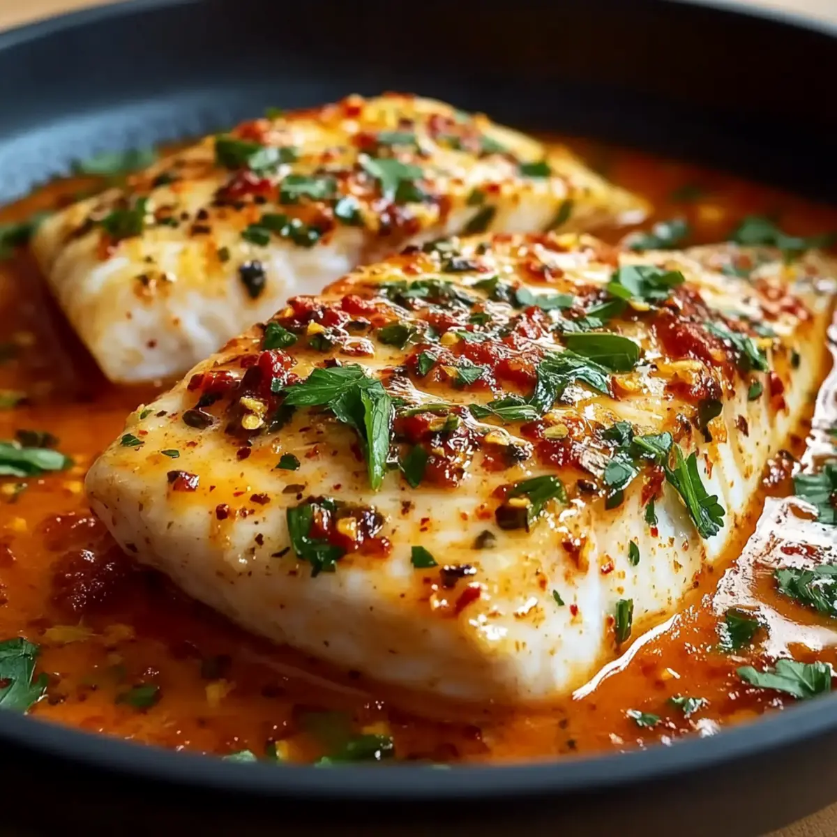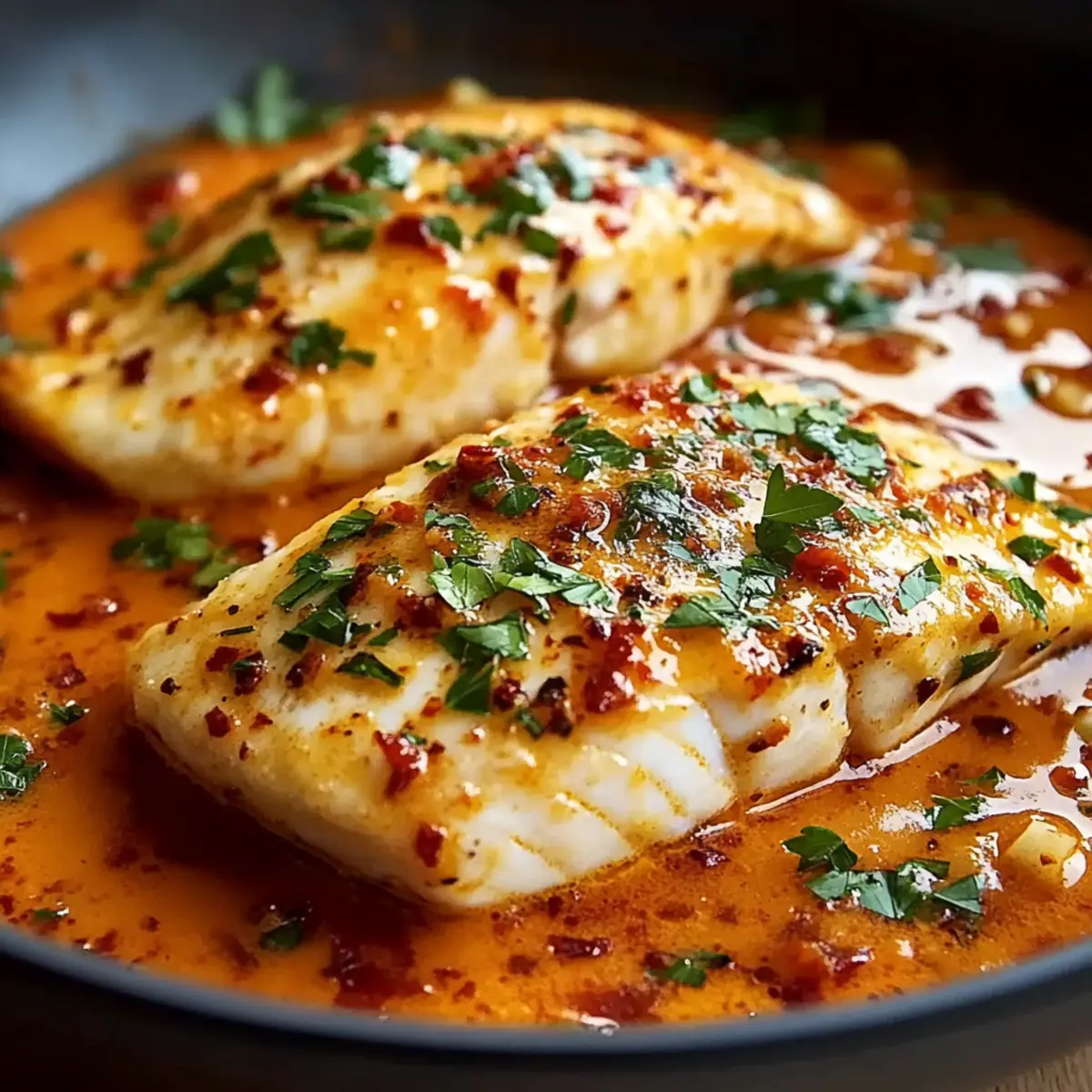 5. Pour the roasted pepper sauce over cooked tilapia and simmer for 1 minute.