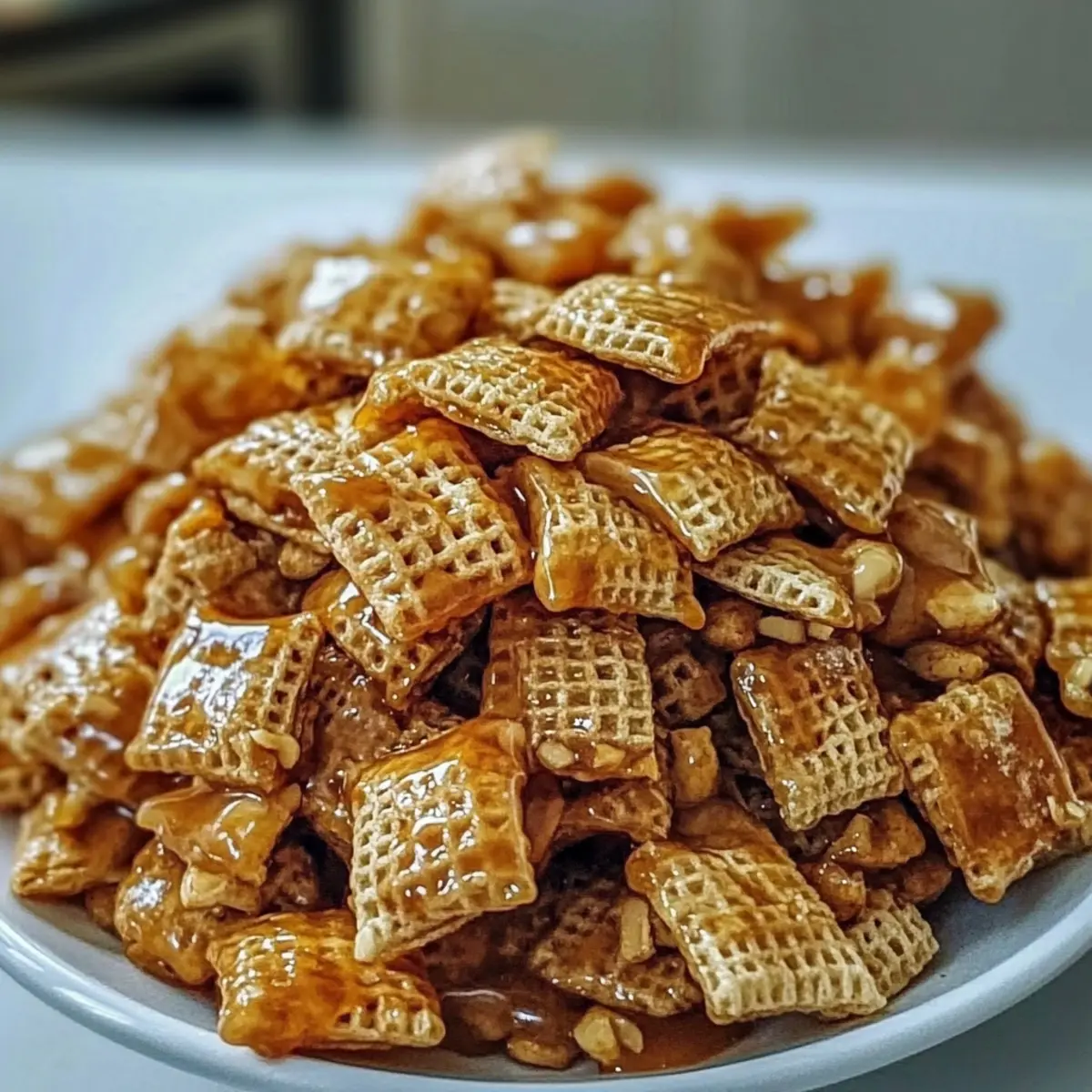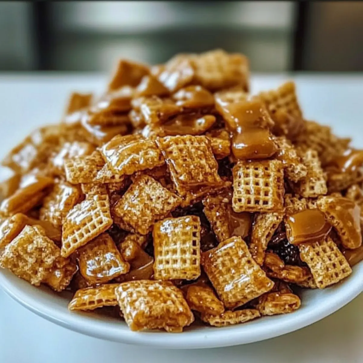 Jump to Recipe Print RecipeThe aroma of caramel wafts through the air, instantly transporting me back to cozy afternoons spent indulging in homemade snacks. If you’re searching for the perfect treat that combines sweet, crunchy goodness, look no further than this Addicting Toffee Chex Mix. With its irresistible toffee coating enveloping every piece of Chex and nut, this recipe is a breeze to whip up—making it an ideal game day snack or a delightful holiday gift straight from your kitchen. In just a few simple steps, you can create a light and airy crunch that will have everyone reaching for more. Are you ready to transform your snacking game with this delicious treat? Why is Toffee Chex Mix So Addictive? Irresistible Crunch: Each bite of this Toffee Chex Mix delivers an incredible crunch that elevates every handful. Quick & Easy: This recipe comes together in just minutes, making it perfect for those last-minute gatherings or late-night cravings. Crowd-Pleasing Delight: Whether you’re hosting a game day or holiday celebration, this mix will have everyone raving and asking for the secret. Versatile & Customizable: Feel free to experiment by adding your favorite nuts or indulging in different flavor variations—mini pretzels, anyone? Perfect Gift Idea: Package it in a decorative jar and you’ve got a thoughtful homemade gift that’s sure to impress! Toffee Chex Mix Ingredients • Unlock the delicious secrets inside! Chex Cereal: 8–9 cups. The foundation of this Toffee Chex Mix, providing that irresistible crunch. Substitutions: Rice Chex or a combination of Rice & Corn Chex work wonderfully! Nuts: 1 1/2 cups (pecan halves or walnuts). Adds a rich, buttery flavor for an extra layer of deliciousness. Variations: Mix in your favorite nuts for a unique profile! Unsalted Butter: 1 cup (226 g, 2 sticks). Essential for creating the toffee’s rich texture. Tip: Unsalted butter helps you control the overall saltiness better! Brown Sugar: 1 1/2 cups (packed, light or dark). The key to that sweet toffee flavor. Note: Dark brown sugar gives a more robust taste! Light Corn Syrup: 1/2 cup. This ingredient ensures the toffee achieves the perfect consistency. Alternatives: Golden syrup or honey can be used, but may affect texture slightly. Vanilla Extract: 1 tsp. Enhances the sweet and buttery flavors of the toffee. Baking Soda: 1 tsp. Responsible for that airy, crisp texture by creating micro-bubbles. Safety: Handle with care, as it can cause hot splatters! Fine Salt: 1/2 tsp. Balances the sweetness beautifully and amplifies the flavors. Tip: A sprinkle of flaky sea salt on top adds fantastic extra flavor! Step‑by‑Step Instructions for Addicting Toffee Chex Mix Step 1: Preheat & Set Up Begin by preheating your oven to 250°F (120°C). While the oven warms, prepare a large rimmed baking sheet by lining it with parchment paper. This step is crucial to prevent sticking and ensures that the toffee-coated mix bakes evenly, resulting in a delightful crunchy texture. Step 2: Mix Ingredients In a large heatproof bowl, combine 8-9 cups of Chex cereal with 1 1/2 cups of your chosen nuts, like pecan halves or walnuts. To prevent the toffee from seizing, gently warm the bowl under hot water or in the microwave for a few seconds before mixing. This small detail enhances your Toffee Chex Mix and contributes to a smoother coating. Step 3: Make Toffee In a medium saucepan, melt 1 cup of unsalted butter alongside 1 1/2 cups of brown sugar and 1/2 cup of light corn syrup over medium-high heat. Allow the mixture to come to a rolling boil without stirring for a full 5 minutes. You’ll know it’s ready when the mixture turns a lovely golden brown color. Step 4: Create Foaming Reaction Remove the saucepan from heat and carefully whisk in 1 teaspoon of vanilla extract, 1/2 teaspoon of fine salt, and 1 teaspoon of baking soda. This will produce a delightful foaming reaction, causing the mixture to expand and become light. Keep your hands clear of the steam for safety, and remember that this mixture is extremely hot. Step 5: Coat Cereal Mixture Quickly pour your toffee over the warmed Chex cereal and nuts, which will still be warm from the previous step. Use a spatula to gently fold and toss the mixture until every piece is evenly coated. The warmth helps the toffee spread evenly, ensuring no part of the Toffee Chex Mix is left behind. Step 6: Bake Spread the toffee-coated cereal and nuts evenly on the prepared baking sheet. Bake in the preheated oven for 45–60 minutes, stirring every 15 minutes. Look for a dry, light texture before removing it from the oven. It should be golden and crisp to the touch, perfect for the addictive crunch you desire. Step 7: Cool & Store Once baked, allow the Toffee Chex Mix to cool completely on the pan for 30-45 minutes. As it cools, the toffee will harden into crunchy shards. After cooling, break it into pieces and store your delicious creation in an airtight container to keep it fresh and maintain that delightful crunch for days to come. Expert Tips for Addicting Toffee Chex Mix Avoid Sticky Toffee: Check consistently for smoothness while boiling to prevent the toffee from becoming sticky; it should be a lovely golden brown. Even Coating: Quickly pour the toffee over the Chex mixture while it’s still warm to ensure each piece is adequately coated with the delicious toffee. Use the Right Bowl: A large, heatproof bowl is essential for mixing ingredients; it will help prevent spills and allow you to mingle the mix easily! Store for Freshness: Keep your Toffee Chex Mix in an airtight container; it stays fresh for up to a week, keeping that satisfying crunch intact. Temperature Awareness: Be cautious when handling the toffee, as hot sugar can lead to serious burns; it’s best to keep your hands and sleeves cleared. Make Ahead Options These Addicting Toffee Chex Mix treats are perfect for meal prep, saving you time during busy weeks! You can prepare the toffee mixture up to 24 