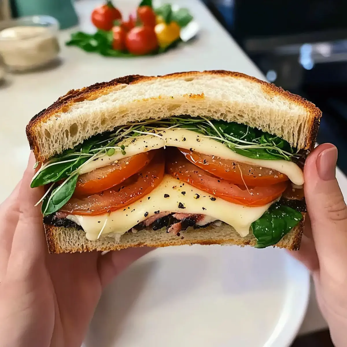Once the cheese is melted and gooey, layer the seasoned tomato slices on top of the melted mozzarella. If you’d like to add protein, layer optional slices of ham, followed by a handful of fresh sprouts and spinach, which adds a delightful crunch and nutritional boost, creating a delicious balance in your Tomato Mozzarella Melt Sandwich.