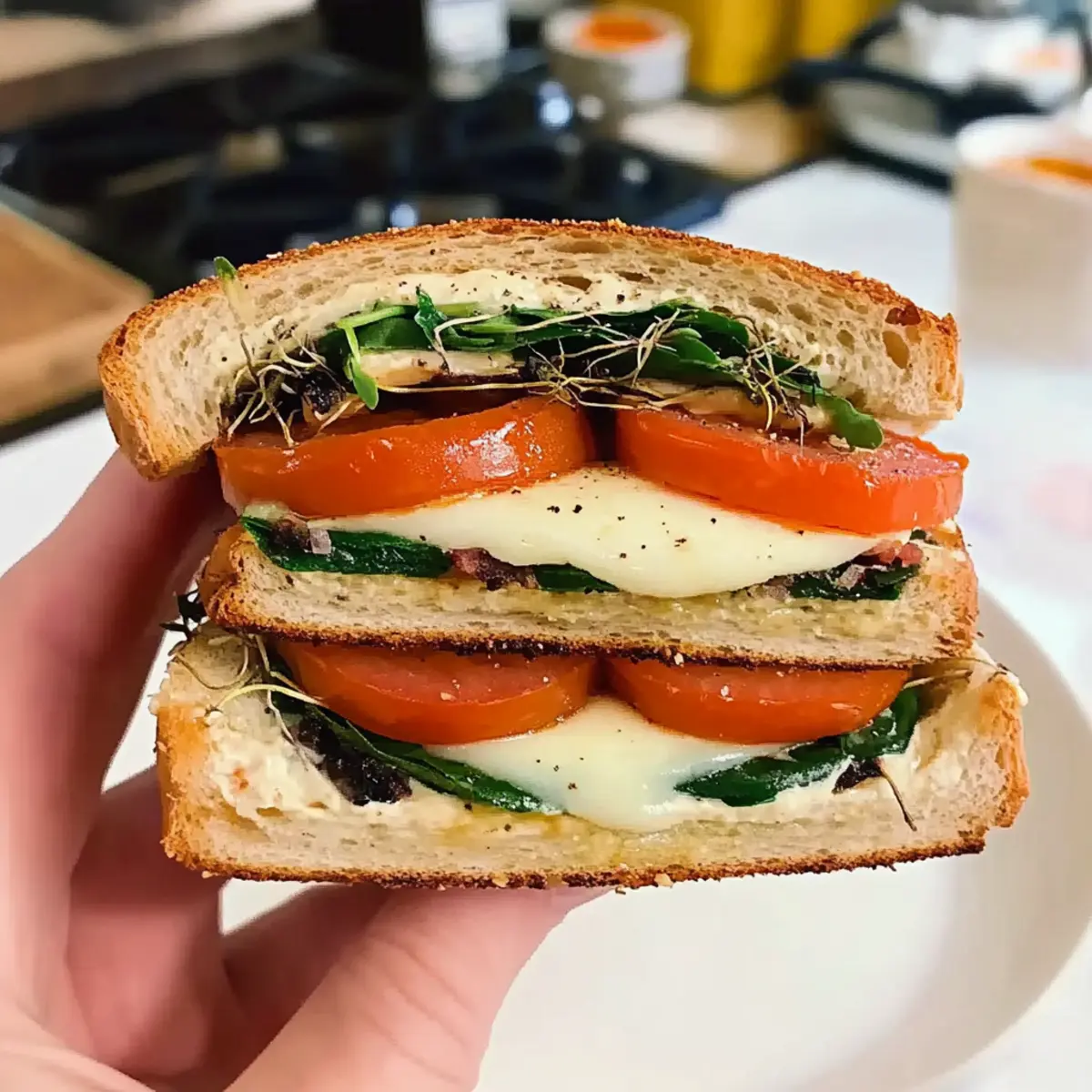 On the other half of the toasted bread, spread a drizzle of mustard for a tangy kick. Firmly press this half onto the assembled layers to complete your sandwich. The contrasting textures of gooey cheese and crisp bread will deliver an amazing eating experience, making your Tomato Mozzarella Melt Sandwich a flavorful delight to savor!
