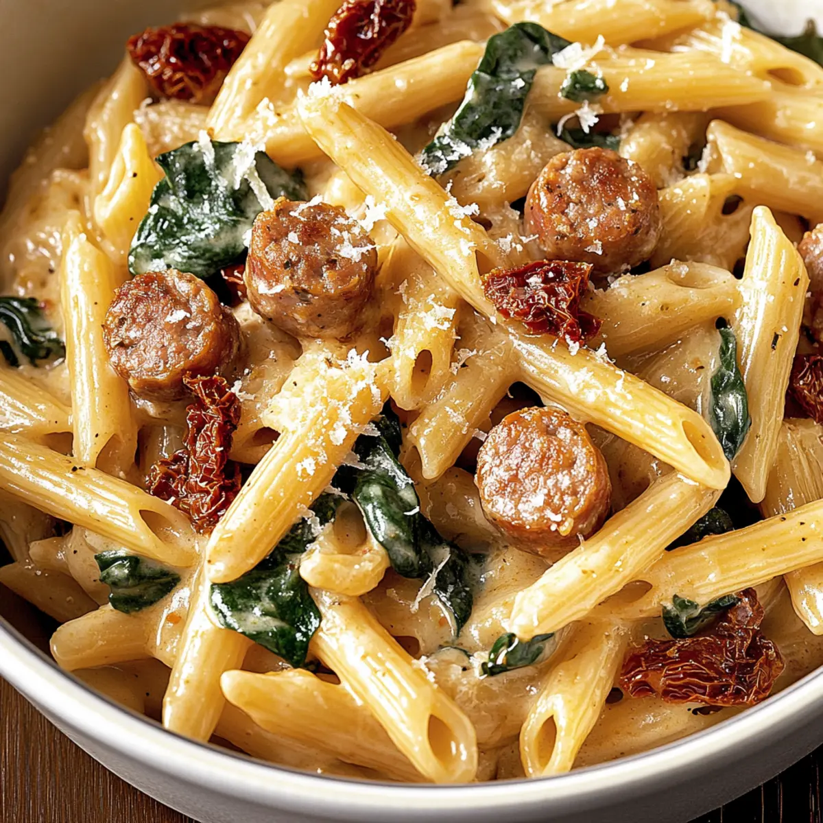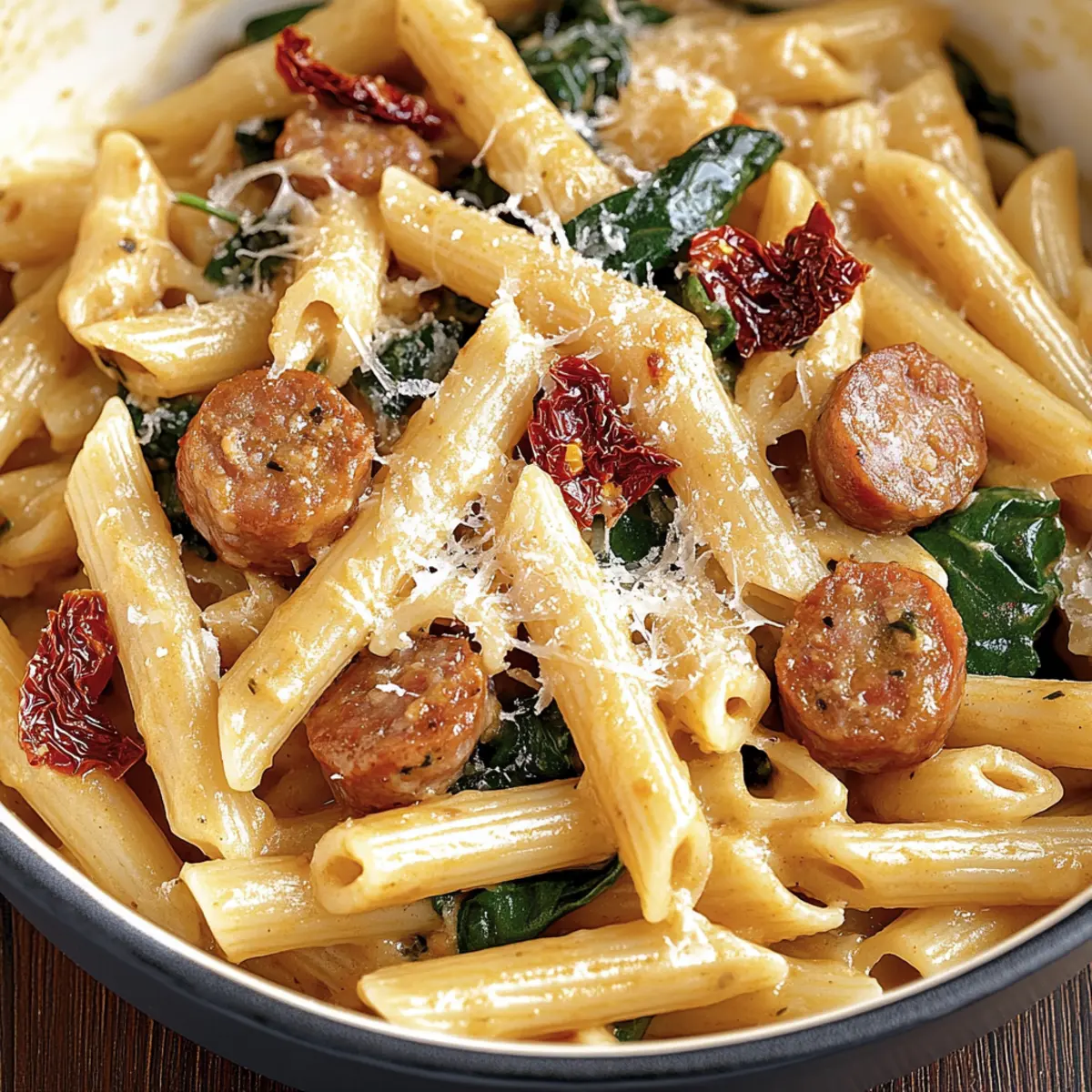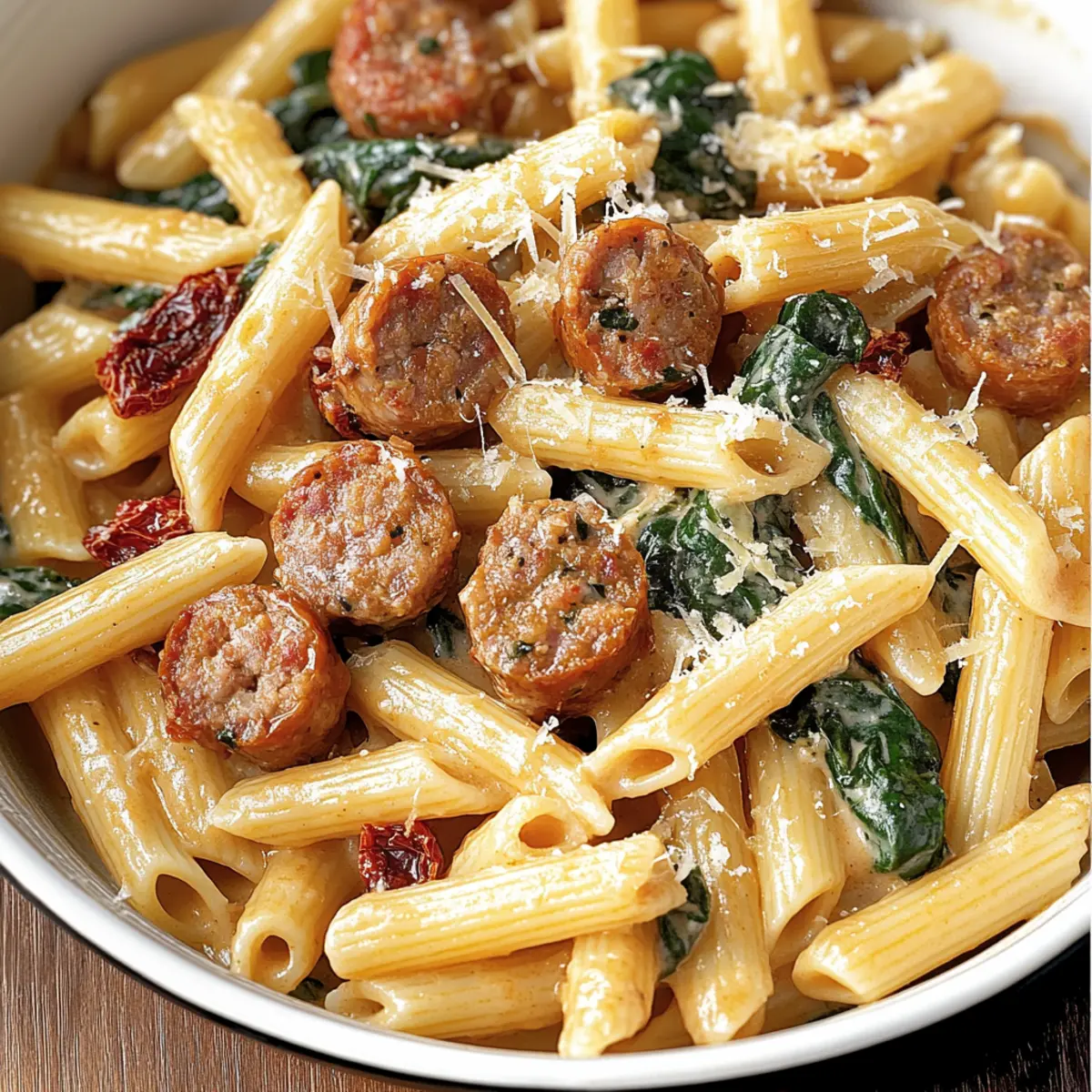 Jump to Recipe Print RecipeImagine a cozy evening in your kitchen, the aroma of sizzling Italian sausage wrapping around you like a warm hug. My Quick and Creamy Tuscan Sausage Pasta captures that essence perfectly. This dish brings together tender penne pasta, rich sausage, and the savory zing of sun-dried tomatoes—all enveloped in a dreamy garlic cream sauce. The best part? It’s a breeze to whip up, ready in just 30 minutes, making it an ideal solution for hectic weeknights or special dinner gatherings. Plus, it strikes the perfect balance between comfort food and Italian flair, ensuring both satisfaction and delight for everyone at the table. Are you curious to dive into this flavorful journey? Let’s get cooking! Why is This Pasta Recipe a Must-Try? Quick and Easy: This Creamy Tuscan Sausage Pasta transforms dinner into a delightful experience, ready in just 30 minutes to accommodate your busy lifestyle. Flavorful Fusion: With rich Italian sausage and tangy sun-dried tomatoes, every bite bursts with authentic flavors that make you feel like you’re dining in a fine Italian restaurant. Comforting satisfaction: It combines classic comfort food with a gourmet twist, ensuring everyone at your table will be coming back for seconds! Versatile ingredients: Not only does the recipe shine on its own, but it pairs beautifully with a refreshing side salad or some classic garlic bread. Crowd pleaser: This dish is perfect for family dinners or casual gatherings, making it a go-to choice for impressing your guests! Dive deeper into Italian cuisine with our other recipes like the Italian Pasta Salad or the hearty High Protein Pasta. Tuscan Sausage Pasta Ingredients For the Pasta • Penne Pasta – A robust base that perfectly absorbs the creamy sauce; can be swapped for rigatoni or cavatappi. For the Sauce • Italian Sausage (1 pound) – This savory star delivers deep, rich flavors; feel free to use bulk sausage or links (just remove the casing). • Olive Oil (2 tablespoons) – Essential for sautéing the sausage and garlic to perfection. • Garlic (4 cloves, minced) – This aromatic hero adds incredible depth; avoid overcooking it to keep that delightful sweetness intact. • Sun-Dried Tomatoes (½ cup, chopped) – These tangy stars bring a Mediterranean flair; look for those packed in oil for extra flavor. • Chicken Broth (1 cup) – Offers a savory backbone to balance the creaminess of the sauce. • Italian Seasoning (1 teaspoon) – Essential for enhancing that classic Italian flavor profile. • Red Pepper Flakes (½ teaspoon) – Gives a gentle heat; adjust according to your preference for spice. • Heavy Cream (2 cups) – The creamy core of the sauce; you can lighten it up a bit by substituting with half-and-half or evaporated milk if desired. • Parmesan Cheese (1 cup, freshly grated) – This salty, nutty addition elevates the dish; always opt for freshly grated for the best results! For the Veggie Boost • Baby Spinach (2 cups) – This fresh green not only adds nutrition but wilts beautifully, enhancing the dish’s appearance and flavor. To Taste • Salt and Pepper – Essential for seasoning and balancing the flavors. • Fresh Basil (for garnish) – Adds a fragrant final touch and bright flavor; pick some fresh leaves for that aromatic burst! Embrace the warmth and heartiness of this Tuscan Sausage Pasta as you gather with loved ones for a delightful meal! Step‑by‑Step Instructions for Creamy Tuscan Sausage Pasta Step 1: Cook the Pasta Begin by bringing a large pot of salted water to a rolling boil over high heat. Add 12 ounces of penne pasta and cook according to package instructions for 8-10 minutes, or until al dente—tender yet firm to the bite. Once done, reserve 1 cup of pasta water for later use, then drain the pasta and set it aside. Step 2: Brown the Sausage In a large skillet, heat 2 tablespoons of olive oil over medium heat. Add 1 pound of Italian sausage, breaking it apart with a spatula as it cooks. Sauté for 5-7 minutes until the sausage is browned and crisped on the edges. Remove the sausage from the skillet and transfer it to a plate; leave the drippings in the pan for flavor. Step 3: Sauté the Garlic With the skillet still over medium heat, reduce the temperature slightly and add 4 cloves of minced garlic. Cook, stirring frequently, for about 1 minute until the garlic is fragrant but not browned, which can lead to bitterness. This step is essential for building the rich flavor base of your creamy Tuscan sausage pasta. Step 4: Combine Ingredients Next, add ½ cup of chopped sun-dried tomatoes, 1 cup of chicken broth, 1 teaspoon of Italian seasoning, and ½ teaspoon of red pepper flakes to the skillet. Stir well and let this mixture simmer for 3-5 minutes until slightly thickened, allowing the flavors to meld beautifully and become aromatic. Step 5: Incorporate Cream and Cheese Pour in 2 cups of heavy cream and add 1 cup of freshly grated Parmesan cheese to the skillet, stirring to combine. Return the browned sausage to the pan, followed by 2 cups of baby spinach. Cook for 1-2 minutes, or until the spinach wilts and the sauce thickens to a creamy consistency; season with salt and pepper to taste. Step 6: Combine with Pasta Add the drained penne pasta to the skillet and toss everything together gently. If the sauce seems too thick, use the reserved pasta water, adding it gradually until you achieve your desired creamy consistency. The penne should be nicely coated in the rich sauce, enhancing the flavors of the creamy Tuscan sausage pasta. Step 7: Serve Spoon the creamy Tuscan sausage pasta into bowls and garnish with fresh basil leaves and extra Parmesan cheese. Serve hot, allowing everyone to revel in the rich, savory aromas that fill the kitchen. Enjoy a delightful experience that brings warmth and comfort to your dinner table! Make Ahead Options These Creamy Tuscan Sausage Pasta preparations are ideal for busy weeknights when time is of 
