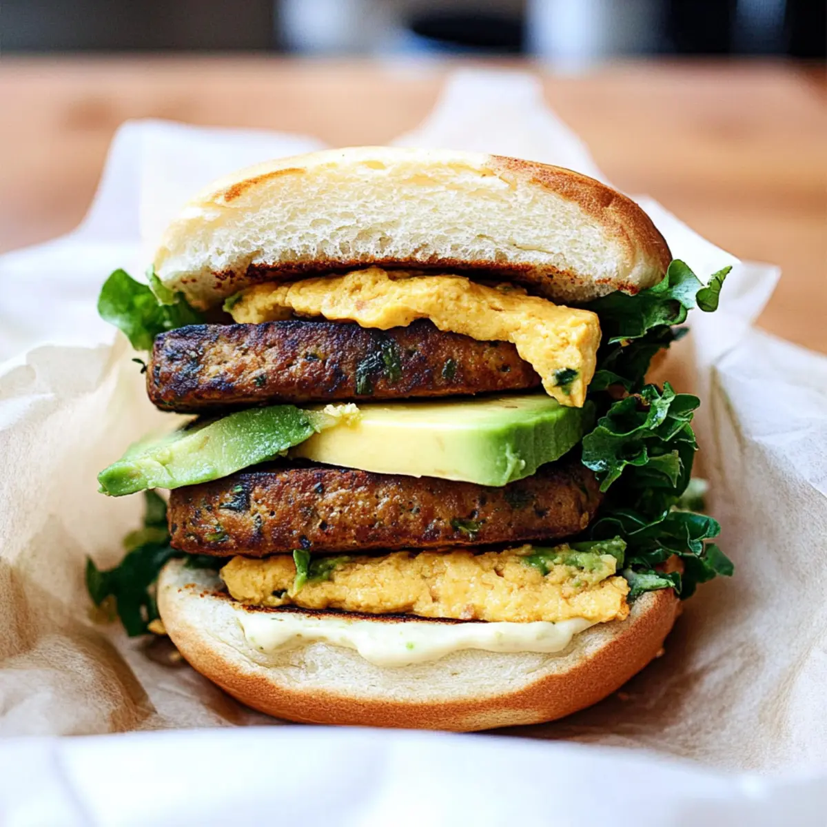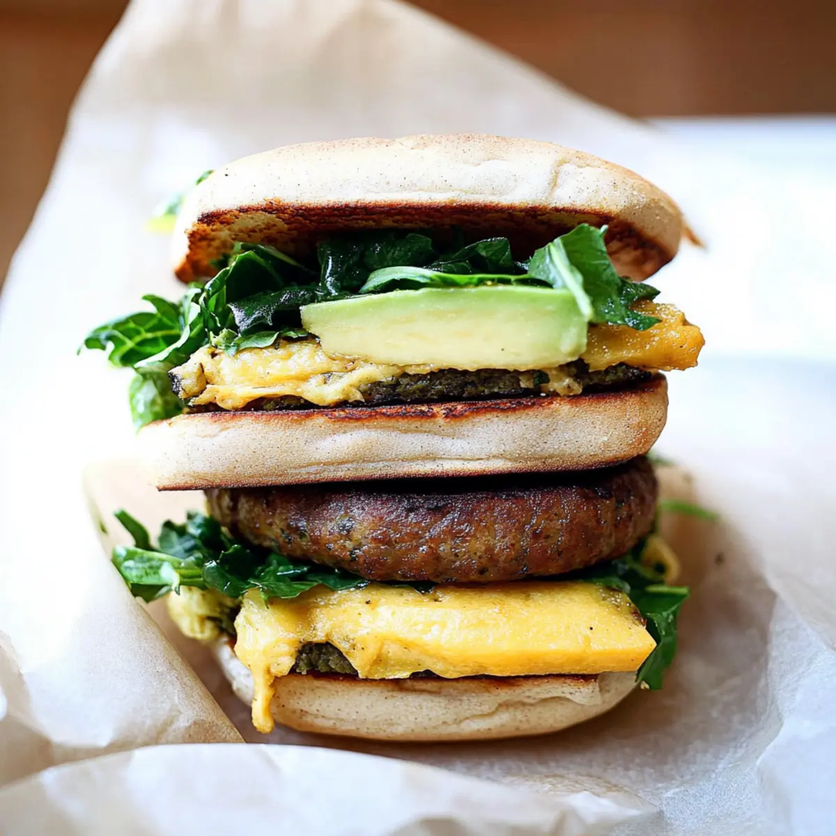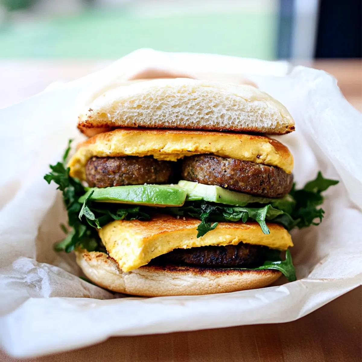 Jump to Recipe Print RecipeAs I stood in the kitchen this morning, the smell of sizzling vegan sausage mingled with the inviting aroma of toasted English muffins, transforming my home into a welcoming breakfast haven. This High Protein Vegan Breakfast Sandwich promises a deliciously satisfying start to your day, crafted in under 10 minutes. Packed with layers of mouthwatering flavors—savory breakfast sausage, velvety tofu “egg,” creamy avocado, and vibrant greens—this easy vegan breakfast is a treasure trove of nutrition and a crowd-pleaser for anyone looking to ditch fast food. Not only does it offer a hearty dose of protein to fuel your morning, but it also brings a delightful twist to your brunch routine. Are you ready to fall in love with this plant-based delight? Why is this Vegan Breakfast Sandwich a Must-Try? Satisfying your morning cravings has never been easier! This Vegan Breakfast Sandwich is not just a meal; it’s a high-protein powerhouse that tastes incredible. Quick to prepare, getting this delightful sandwich on your plate takes less than 10 minutes, perfect for busy mornings. Unique flavors blend together, from savory sausage to creamy avocado, making it a standout choice for anyone bored with fast food. Customizable with variations like tempeh bacon or different greens, it’s adaptable to your taste. Make it a part of your breakfast repertoire alongside other delicious options like Bagel Breakfast Sliders or Skillet Breakfast Hash for an exciting rotation! Vegan Breakfast Sandwich Ingredients Here’s everything you need to whip up this delightful Vegan Breakfast Sandwich in no time! For the Sandwich Base 1 English Muffin (vegan) – Look for naturally vegan brands like Trader Joe’s for a perfect foundation. For the Cheesy Layer 2 tablespoons shredded plant-based cheddar (or 1 slice) – Adds scrumptious creaminess; substitute with any vegan cheese that melts well. For the Savory Elements 1 vegan breakfast sausage patty – Provides a hearty flavor and protein; brands like Field Roast or Trader Joe’s are highly recommended. 1 (1/2″ thick) slice super firm, high protein tofu – Acts as the egg substitute for protein; you can use Just Egg for an easier option. For the Flavor Boost Pinch ground turmeric – This adds a beautiful golden color to the tofu, mimicking egg yolk for that classic touch. Salt and pepper – Essential seasonings to enhance all the amazing flavors. For the Creamy Touch 1/4 ripe avocado (optional) – Gives a rich creaminess and healthy fats for a truly satisfying bite. For the Freshness 1/4 cup favorite greens (shredded kale suggested) – Adds a refreshing crunch; feel free to substitute with spinach or arugula as per your preference. Step‑by‑Step Instructions for Vegan Breakfast Sandwich Step 1: Toast the English Muffin Begin by cutting your English muffin in half and placing one half on a baking tray. Top it with the shredded plant-based cheddar or a slice of vegan cheese and toast it under the broiler for 2-3 minutes, or until it’s melted and golden. Keep an eye on it to prevent burning, creating a crispy base for your Vegan Breakfast Sandwich. Step 2: Cook the Sausage While the muffin is toasting, heat a skillet over medium-high heat and lightly coat it with cooking spray or a drizzle of olive oil. Place the vegan breakfast sausage patty into the hot skillet and cook according to the package instructions for about 4-5 minutes, flipping once, until it’s nicely browned and crisp on both sides, infusing your kitchen with savory aromas. Step 3: Prepare Tofu After the sausage is done, push it to the side of the skillet and add the super firm tofu slice. Cook the tofu for about 2 minutes on each side until it achieves a golden color. Sprinkle a pinch of ground turmeric, salt, and pepper on top, and cook for an additional minute, allowing the seasonings to enhance the tofu’s flavor, making it a delightful egg substitute. Step 4: Assemble the Sandwich Take the toasted English muffin and lay the non-cheesy half on a plate. Start layering with sliced avocado if desired, then add the cooked sausage patty, followed by the golden tofu slice, and finish with a handful of shredded greens. These fresh layers will add great texture and nutritional boost, setting up the perfect bite for your Vegan Breakfast Sandwich. Step 5: Serve Finally, place the cheesy half of the muffin on top, creating your complete sandwich masterpiece. Enjoy your Vegan Breakfast Sandwich immediately for the best taste and texture—bite into the warm, savory goodness, and relish the delicious combination of flavors that come together beautifully on your plate! Expert Tips for the Best Vegan Breakfast Sandwich Choose the Right Tofu: Use super firm, high-protein tofu to avoid excess moisture and ensure it holds its shape. No pressing is necessary! Cook Simultaneously: For quicker prep, cook both the sausage and tofu in the same skillet. This saves time and enhances flavors! Freshness Matters: Serve the sandwich immediately after assembling. The contrast of warm ingredients with cold avocado and greens maximizes the enjoyable texture of your Vegan Breakfast Sandwich. Experiment with Greens: Don’t hesitate to switch up the greens! Adding different options like spinach or arugula can give your sandwich a fresh twist and enhance nutrients. Check for Vegan Cheese: Ensure your cheese is truly vegan; some brands contain dairy. Opt for varieties that melt well to enhance the sandwich experience. Make Ahead Options These Vegan Breakfast Sandwiches are a game-changer for meal prep enthusiasts! You can cook the vegan sausage and super firm tofu up to 3 days in advance, storing them in an airtight container in the refrigerator to maintain their flavors. When you’re ready to enjoy your sandwich, simply reheat the sausage and tofu in a skillet over medium heat for a few minutes until warmed through. Also, consider toasting the English muffins and pre-slicing the avocado to