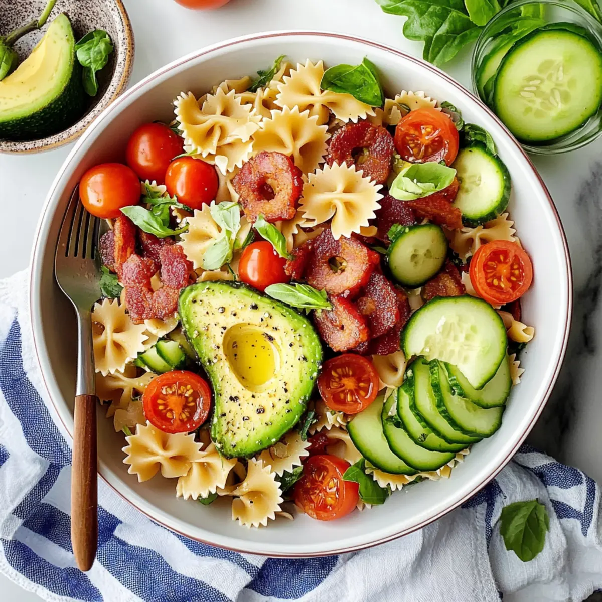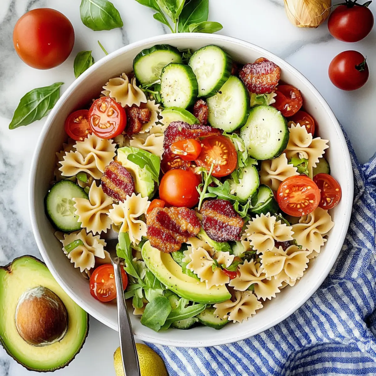 Jump to Recipe Print RecipeAs I strolled through the bustling farmers’ market last weekend, the vibrant colors and fresh scents of summer produce ignited my culinary imagination. I stumbled upon perfectly ripe avocados, plump cherry tomatoes, and crisp cucumbers—ingredients that would perfectly transform a nostalgic classic into something new: a Vegetarian BLT Pasta Salad. This dish captures all the delightful essence of a traditional BLT, while offering a refreshing twist that’s perfect for light lunches or summer gatherings. With quick prep and a bounty of fresh flavors, it’s a crowd-pleaser that even the meat-lovers in your life won’t resist. Curious about how to elevate your pasta salad game this season? Let’s dive in! Want a Unique Summer Pasta Dish? Refreshing, this Vegetarian BLT Pasta Salad reinvents a beloved classic into a vibrant, delicious dish. Easy to prepare, you can whip it up in no time, making it perfect for busy summer days. Bursting with flavors, the combination of fresh veggies and creamy avocado offers a delightful contrast that elevates any meal. Crowd-pleasing, this salad is sure to impress guests, even those who typically crave traditional bacon. Plus, for more exciting twists, check out our Italian Pasta Salad and elevate your summer gatherings with fresh flavors! BLT Pasta Salad Ingredients For the Pasta Farfalle Pasta – This is the base of the salad; cook until just past al dente for a perfect texture. For the Dressing Extra-Virgin Olive Oil – Adds rich flavor; can substitute with other neutral oils if needed. Red Wine Vinegar – Provides a bright acidity; apple cider vinegar works well as an alternative. Garlic Cloves – Freshly minced enhances the aromatic character of the dish. Dried Oregano – An herbal note that complements the salad beautifully; mixed Italian herbs can be used as a substitute. Dried Parsley – Adds color and flavor; fresh parsley will enhance the freshness even more. Sea Salt – Essential for enhancing the flavors; adjust to fit your personal taste. For the Salad Tempeh Bacon – Offers a savory element; for a vegan version, you can use store-bought or homemade options. Cherry Tomatoes – Sweet and juicy bites; substitute with diced tomatoes if preferred. Sun-Dried Tomatoes – Adds depth of flavor; roasted red peppers work for a different twist. Cucumber – Brings a refreshing crunch; shredded zucchini can be a delightful swap. Red Onion – Adds a sharp bite; green onions are a milder substitute if desired. Avocado – Ensures creaminess, mimicking the richness of a traditional BLT; add right before serving to keep it fresh. Fresh Arugula – Gives a peppery finish; spinach is a milder alternative that fits well. This Vegetarian BLT Pasta Salad is not just easy to make, it’s a beautifully fresh and vibrant option for your summer meals! Step‑by‑Step Instructions for Vegetarian BLT Pasta Salad Step 1: Prepare Tempeh Bacon Begin by cutting the tempeh into thin strips and steam them for about 10 minutes until tender. Once steamed, marinate the strips in a mix of olive oil, salt, and your choice of spices for 15 minutes. Then, bake them in a preheated oven at 400°F for 20-25 minutes, flipping halfway through, until they are crispy. Let them cool and break into small pieces. Step 2: Cook Pasta In a large pot, bring salted water to a boil. Add the farfalle pasta and cook according to package instructions until just past al dente, approximately 10-12 minutes. Drain the pasta and rinse under cool water to stop the cooking process, allowing it to cool completely. This method ensures the perfect texture for your Vegetarian BLT Pasta Salad. Step 3: Make Dressing In a large mixing bowl, whisk together 1/2 cup of extra-virgin olive oil, 3 tablespoons of red wine vinegar, two minced garlic cloves, 1 teaspoon of dried oregano, 1 teaspoon of dried parsley, and a pinch of sea salt. Keep whisking until the mixture is smooth and emulsified; this dressing will bring flavor and brightness to your salad. Step 4: Combine Ingredients Add the cooled pasta to the bowl with the dressing, tossing gently to coat every piece evenly. Next, incorporate the crispy tempeh bacon, along with 1 cup of halved cherry tomatoes, 1/2 cup of chopped sun-dried tomatoes, 1 diced cucumber, and 1/4 cup of finely chopped red onion. Toss the mixture lightly to combine all the ingredients without breaking the pasta. Step 5: Finish Salad To complete your Vegetarian BLT Pasta Salad, fold in 1 diced avocado and 2 cups of fresh arugula. Gently mix until everything is coated with the dressing, taking care not to mash the avocado. Season the salad to taste with additional salt if needed, and serve immediately to enjoy the fresh flavors and textures. Variations & Substitutions for Vegetarian BLT Pasta Salad Feel free to get creative with this recipe and make it truly yours – your taste buds will thank you! Tempeh Bacon: Substitute with crispy bacon or turkey bacon for a classic version. Just add it the same way for that satisfying crunch! Chickpeas or Beans: Add protein like canned chickpeas or black beans for a heartier salad. They complement the other flavors while boosting nutrition. Dried Herbs: Experiment with fresh herbs instead of dried oregano and parsley for a brighter taste. Basil or cilantro can give a fresh summer vibe! Different Pastas: Swap the farfalle for rotini or bowtie pasta. Each shape provides a delightful twist in texture and presentation to this beautiful dish. Zucchini Ribbons: For a low-carb option, replace pasta with spiralized zucchini. Enjoy the added freshness, making it an even lighter dish. Kick it Up a Notch: If you love heat, toss in some red pepper flakes or a splash of hot sauce. It’s a simple way to amp up the flavor profile! Feta Cheese: Crumble some feta cheese on top for a savory twist. The salty creaminess pairs perfectly with the freshness of the veggies, transforming your pasta salad. Avocado Alternative: If you’re 