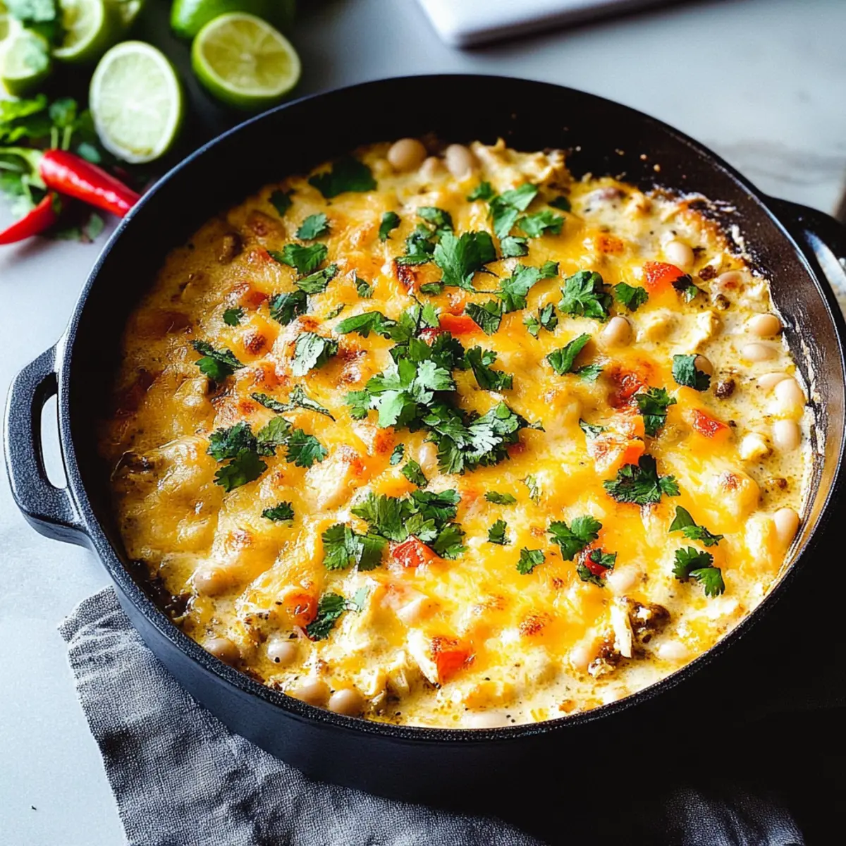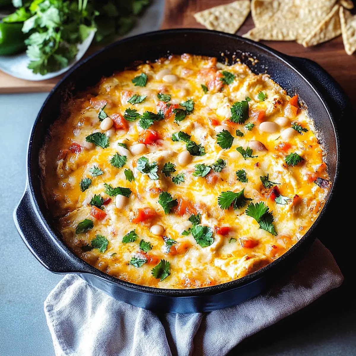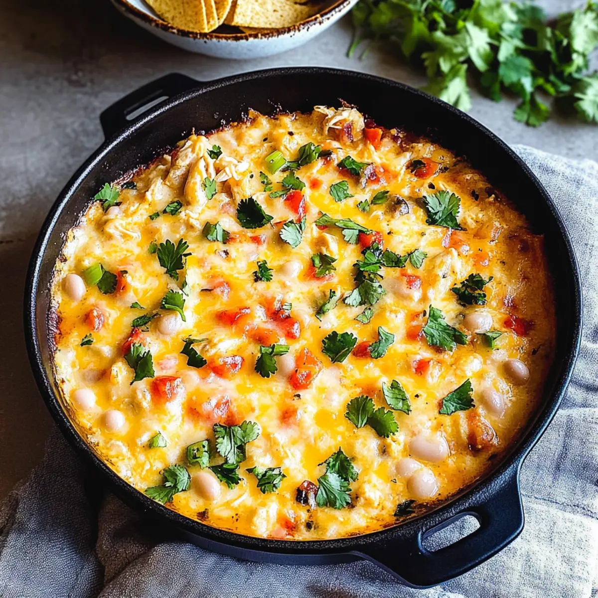 Jump to Recipe Print RecipeThe aroma of garlic and roasted chicken wafting through the kitchen pulls me back to cozy evenings spent with friends gathered around the table. Today, I’m excited to share my recipe for Cheesy Baked White Chicken Chili Dip, a delightful twist on the classic comfort of white chicken chili. This dish seamlessly blends smooth white beans, zesty salsa verde, and oodles of melted cheese, making it a perfect appetizer for any occasion. Not only is it a crowd-pleaser, but it also comes together in a flash, letting you spend less time in the kitchen and more time enjoying the company of your loved ones. Whether you’re hosting a game day gathering or whipping up a special treat for a weeknight snack, this dip’s creamy texture and vibrant flavors will surely become a favorite. Are you ready to dive into the joy of homemade comfort food? Why Will You Love This Dip? Comforting and familiar, this White Chicken Chili Dip brings all the cozy vibes of your favorite soup in a shareable form. Quick to prepare, it requires minimal effort, so you can save time for mingling with guests. Rich and creamy, the gooey cheese and seasoned chicken melt together for a flavor explosion. Versatile ingredients mean you can customize it—try substituting with rotisserie chicken or even a vegan twist using beans! Perfect for game day or family gatherings, this dip will become the star of your spread! Pair it with some tortilla chips for a snack that’s utterly irresistible. White Chicken Chili Dip Ingredients • Discover the essential ingredients for a creamy delight! For the Dip White Beans – Provides protein and creaminess; you can substitute with cannellini or navy beans if preferred. Sour Cream – Adds creaminess and tang; Greek yogurt is a fantastic lower-fat alternative. Garlic – Enhances flavor depth; opt for roasted garlic for milder sweetness or fresh for more punch. Lime Juice – Balances flavors with a citrus note; lemon juice makes a good substitute if needed. Red Pepper Flakes – Adds heat; adjust to taste or omit for a milder dip. Ground Cumin – Infuses the dip with earthy flavor; consider omitting if not your preference, but it’s recommended for depth. Kosher Salt – Enhances all flavors; be sure to adjust seasoning to taste throughout preparation. Shredded Cooked Chicken – Delivers protein and texture; rotisserie chicken offers great convenience, or omit for a vegetarian option. Sweet Corn – Adds sweetness and texture; fresh or frozen works well and can be swapped with black beans for variation. Minced Cilantro – Brings a fresh, herbal note; substitute with green onions for a milder touch. Mozzarella/Cheddar Cheese Combination – Creates that ooey-gooey texture; any cheese blend will do, and dairy-free cheese is an option for a vegan version. Diced Red Pepper – Provides color and crunch; try diced jalapeños if you’re looking for an extra kick. Salsa Verde – Imparts tangy flavor; feel free to adjust for your preferred spice level, or swap for mild tomato salsa if desired. Step‑by‑Step Instructions for Cheesy Baked White Chicken Chili Dip Step 1: Preheat the Oven Begin by preheating your oven to 375°F (190°C). While the oven warms up, take a 10-inch cast iron skillet and brush it lightly with olive oil to prevent sticking. This step will ensure that your cheesy baked white chicken chili dip has a lovely golden crust when it’s finished. Step 2: Prepare the Beans Next, open a can of white beans and drain them, setting aside 1/4 cup of the beans for later. In a food processor, combine the remaining white beans with sour cream, 1/4 cup of salsa verde, garlic, lime juice, red pepper flakes, ground cumin, and kosher salt. Blend until smooth and creamy, creating the base for your dip. Step 3: Mix in the Ingredients In a large mixing bowl, fold in the shredded cooked chicken, sweet corn, minced cilantro, and 1 cup of your cheese blend into the creamy bean mixture. Stir gently until everything is well combined; you want to distribute the chicken and corn evenly throughout the cheesy baked white chicken chili dip for maximum flavor. Step 4: Assemble the Dip Carefully spread the combined mixture into the prepared skillet, ensuring it’s evenly distributed. Sprinkle the reserved white beans and diced red pepper on top for added texture and color. Then drizzle with the remaining salsa verde for a fresh kick that enhances your dip’s flavor. Step 5: Top with Cheese Generously sprinkle the remaining cheese over the top of the assembled dip. This layer will melt beautifully, turning golden and bubbly as it bakes, creating the deliciously gooey texture everyone loves in a cheesy baked white chicken chili dip. Step 6: Bake Until Bubbling Place the skillet in the preheated oven and bake for 20 minutes. Keep an eye on it; you want the edges to bubble and the cheese to melt beautifully. This will ensure your dip has that irresistible creamy texture with a touch of crispy cheese on top. Step 7: Broil for a Perfect Finish After baking, switch your oven to broil and cook the dip for an additional 2-3 minutes. This step adds a lovely golden-brown finish to the cheese, making your cheesy baked white chicken chili dip both visually appealing and mouthwateringly delicious. Step 8: Serve and Enjoy Once golden and bubbling, remove the skillet from the oven. Let it sit for a moment before serving; this will allow the dip to set slightly. Serve it warm with tortilla chips, fresh vegetables, or crusty bread, and get ready to delight your friends and family with this incredible cheesy dip. What to Serve with Cheesy Baked White Chicken Chili Dip The perfect accompaniments can elevate your cheesy baked white chicken chili dip into a full-fledged feast that delights all the senses! Tortilla Chips: Crunchy and salty, they create the ideal vessel for scooping up that creamy dip, enhancing every bite. Fresh Veggies: Crisp bell peppers, carrots, and cucumbers provide a refres