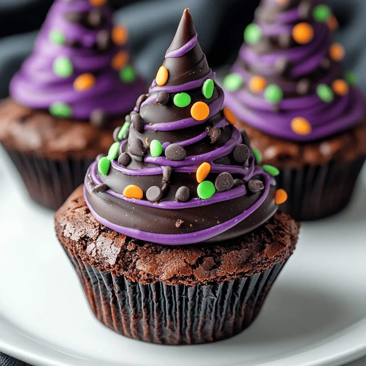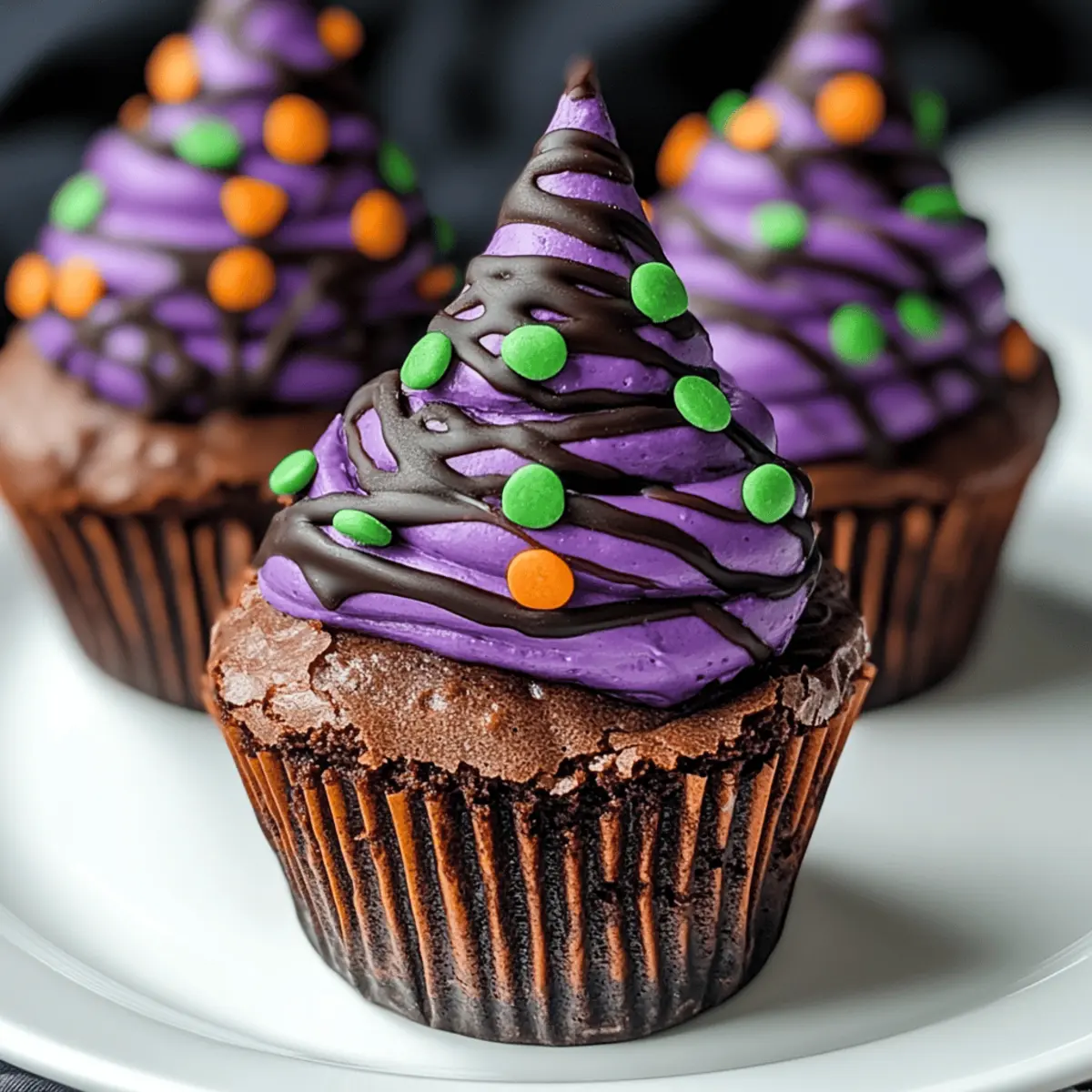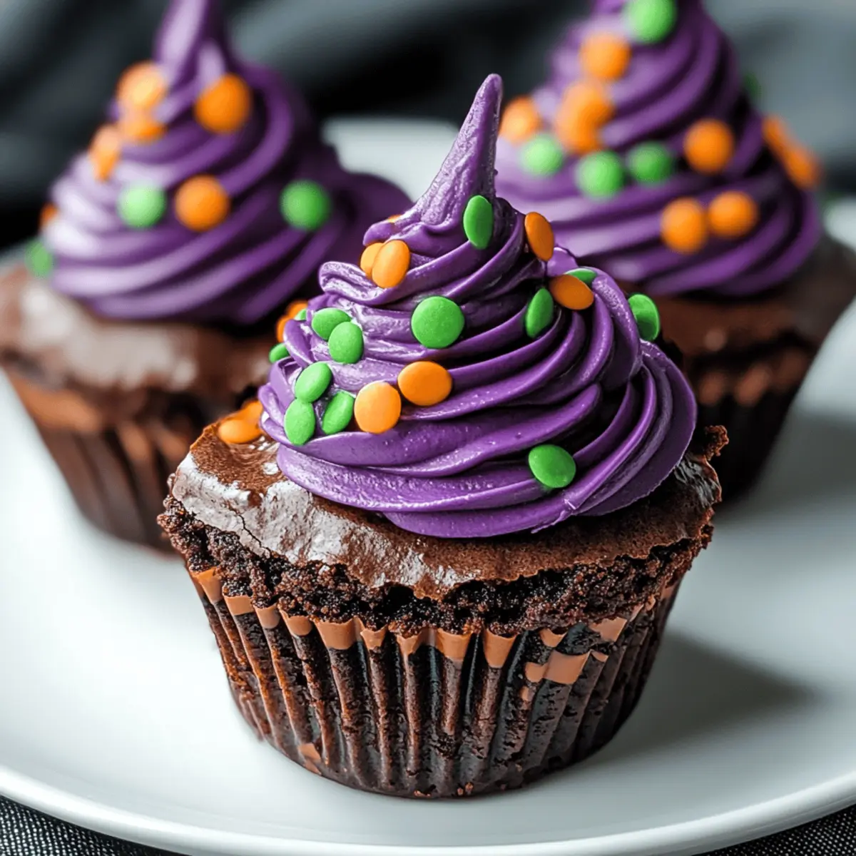 Jump to Recipe Print RecipeWith a playful twist that screams Halloween, these Witch Hat Cupcakes are bound to steal the show at your festive gatherings! Imagine the delight on everyone’s faces as they bite into these chocolaty wonders, topped with enchanting, edible hats that are almost too cute to eat. What I love about these treats is their simplicity—perfect for budding bakers and seasoned pros alike—while also being a fun project to tackle with the kids. Whether you’re hosting a spooky soirée or just looking to add a festive touch to your fall table, these easy and kid-friendly cupcakes will create unforgettable memories in the kitchen. Ready to conjure up some Halloween magic? Let’s dive into these bewitching recipes! Why are Witch Hat Cupcakes a must-try? Spellbinding Appeal: These cupcakes are not just delicious; they visually enchant with their cute edible hats, making them a centerpiece for Halloween gatherings. Easy Fun: Perfect for novice bakers, the simple recipe allows everyone, including kids, to join in on the fun! Chocolaty Goodness: Rich chocolate flavor paired with festive aesthetics guarantees that each bite is a treat for the taste buds. Versatile Design: Feel free to personalize your witch hats with different colors and toppings! You can also try pairing these cupcakes with other spooky treats like Ghost Meringues or Grilled Sausage Grazing for a complete Halloween spread. Memorable Moments: Making these cupcakes together is sure to create fun-filled memories, providing the perfect blend of deliciousness and holiday spirit! Witch Hat Cupcake Ingredients Get ready to summon some festive flavors! For the Cupcakes All-Purpose Flour – Provides structure to your cupcakes; consider using a gluten-free blend for a delightful alternative. Granulated Sugar – Sweetens the batter for a scrumptious treat; coconut sugar can be used for a less refined option. Cocoa Powder – Adds that rich chocolate flavor witches crave; swap it out with carob powder for a caffeine-free version. Eggs – Binds everything together; flax eggs are a fantastic vegan substitute! Butter – Introduces moisture and richness; substitute with coconut oil for a dairy-free treat. For the Witch Hats Chocolate Wafers – Form the main structure of your witch hats; mini cookies can also work well for a different shape. Candy Melts – These melted candies will fix the hat to the cupcake; choose vibrant colors for a magical touch. Decorative Sprinkles – Use them for extra flair on your witch hats; select themed sprinkles to enhance the spooky look. For the Frosting Buttercream Frosting – The creamy base that holds your witch hats; consider adding food coloring to make it festive! Chocolate Chips – Sprinkle on top for added texture; dark chocolate offers a deeper flavor. Whether you’re hosting a haunted gathering or just whipping up some spook-tacular treats at home, these Witch Hat Cupcakes are a delightful way to celebrate Halloween! Step‑by‑Step Instructions for Witch Hat Cupcakes Step 1: Prepare the Oven Begin your magical baking journey by preheating the oven to 350°F (175°C). This ensures the Witch Hat Cupcakes bake evenly and rise beautifully. While the oven warms up, gather your mixing bowls, cupcake pan, and cupcake liners for a seamless baking experience. Step 2: Mix Dry Ingredients In a large mixing bowl, whisk together 1 1/2 cups of all-purpose flour, 1 cup of granulated sugar, 1/2 cup of cocoa powder, and 1 teaspoon of baking powder. This dry mixture provides the foundational structure for your cupcakes. Ensure that there are no lumps after mixing, as a smooth batter leads to delightful, fluffy Witch Hat Cupcakes. Step 3: Cream Butter and Sugar In a separate bowl, cream together 1/2 cup of softened butter and your 1 cup of sugar until light and fluffy, about 2 minutes. The mixture should become pale in color and slightly increased in volume. This step adds richness to your cupcakes, ensuring every bite bursts with chocolaty goodness. Step 4: Add Eggs Crack in 2 large eggs, one at a time, mixing well after each addition. Continue to beat the mixture for another minute until it’s combined and smooth. This is essential for binding your batter since the eggs help create that perfect cupcake texture, setting the stage for your magical Witch Hat Cupcakes. Step 5: Combine Wet and Dry Ingredients Gradually add the dry flour mixture to the creamed mixture, alternating with 1 cup of milk to maintain a smooth consistency. Stir until just combined—don’t overmix! Your batter should be thick yet pourable, ready to take shape in the cupcake liners, channeling all that enchanting chocolate flavor. Step 6: Shape the Batter Pour the batter into lined cupcake pans, filling each liner about two-thirds full. This allows space for the cupcakes to rise without overflowing. Once filled, gently tap the pans on the kitchen counter to remove any air bubbles, leading to perfectly shaped Witch Hat Cupcakes. Step 7: Bake the Cupcakes Place the cupcake pans in the preheated oven and bake for 18-20 minutes. To check for doneness, insert a toothpick in the center of a cupcake; it should come out clean or with a few moist crumbs. This visual cue will guide you to a successful baking outcome. Step 8: Cool the Cupcakes Once baked, remove the cupcakes from the oven and allow them to cool in the pan for 5 minutes. Then transfer them to a wire rack to cool completely. This step is crucial for avoiding melted toppings, ensuring your Witch Hat Cupcakes maintain their spellbinding appearance. Step 9: Decorate with Frosting Once cooled, use a piping bag to swirl buttercream frosting on top of each cupcake. Aim for a generous, grassy hill of frosting to securely hold your witch hats. Feel free to tint the frosting with food coloring for an extra festive touch that makes these Witch Hat Cupcakes truly magical. Step 10: Assemble the Witch Hats To create the witch hats, melt your candy melts according to packag