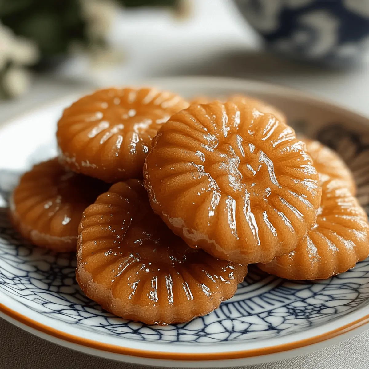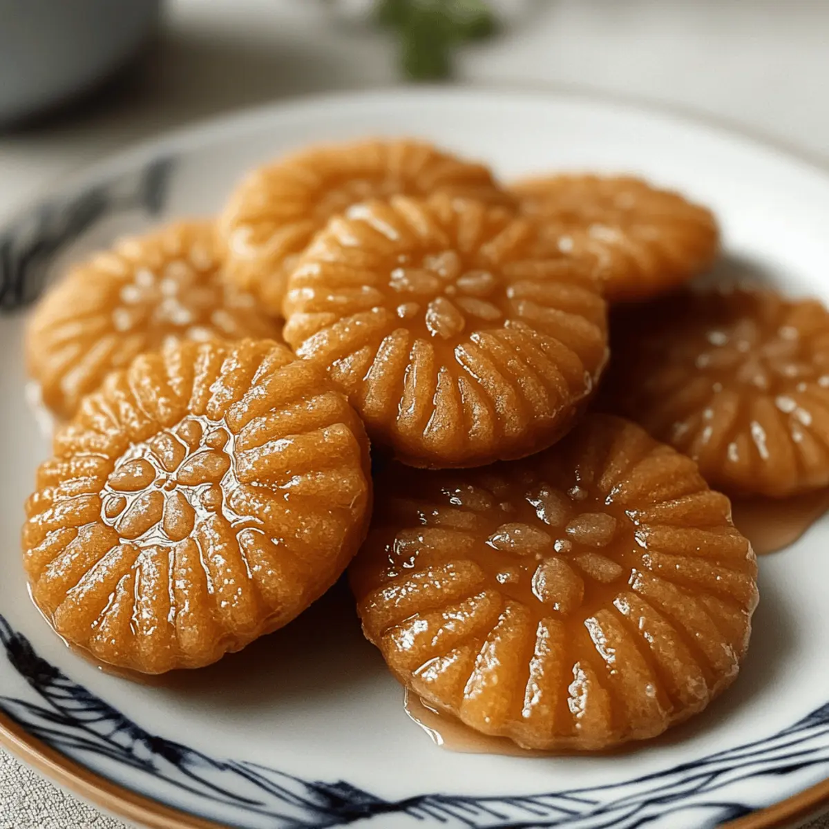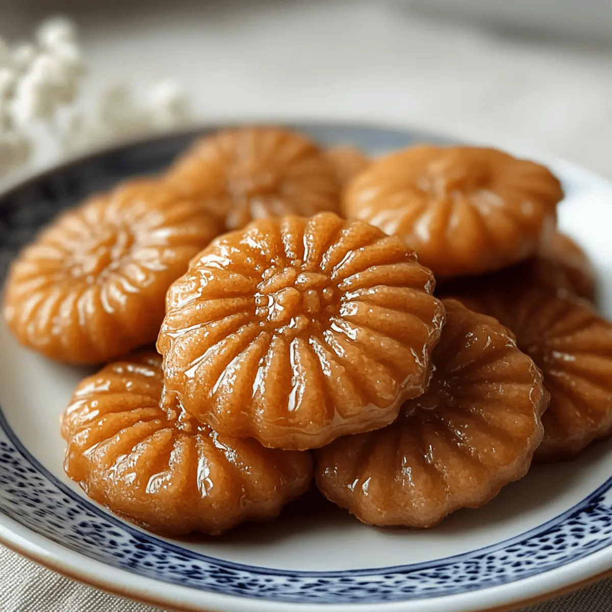 Jump to Recipe Print RecipeAs I stand at the kitchen counter, the sweet and spicy aroma of fresh ginger fills the air, instantly transporting me to the vibrant streets of Korea during Lantern Festival. Today, I’m excited to share a delightful recipe for Yakgwa (Korean Honey Cookies)—a cherished traditional dessert often enjoyed during special occasions with family and friends. These cookies, with their beautifully crispy exterior and soft, chewy center, are a treat for both the senses and the soul. Plus, they’re vegetarian-friendly and you can choose to make a lighter, baked version if frying isn’t your thing! Whether you’re looking to impress guests or indulge your own cravings, Yakgwa offers a comforting taste of culture that’s sure to delight. Ready to dive into the world of these scrumptious honey cookies? Let’s get started! Why are Yakgwa the perfect treat? Crispy exterior, soft and chewy inside—Yakgwa offers a unique textural contrast that keeps each bite interesting. Perfect for sharing, these honey cookies are best enjoyed with loved ones over a cup of tea, making them a go-to for celebrations and gatherings. Versatile variations mean you can bake them for a lighter option, or spice up the syrup for a personalized twist. Plus, their gorgeous golden hue and sweet aroma will fill your kitchen with a welcoming warmth. If you’re a fan of delightful desserts, these Honeycrisp Apple Feta and Cajun Honey Butter flavors will have your taste buds dancing with joy! Yakgwa Ingredients • Dive into the world of Yakgwa with these essential ingredients for making your own delightful honey cookies! For the Dough All-purpose flour – Provides the structure; consider using glutinous rice flour for a chewier texture. Honey – Adds essential sweetness and a floral note that defines the cookie’s flavor. Sesame oil – Introduces deep, nutty flavor; opt for neutral oil if you must, but sesame is best for authenticity. Ginger – Gives warmth and spice; fresh ginger is preferred for robustness, though powdered can work in a pinch. Rice wine (or mirin) – Enhances flavor and tenderizes the dough; feel free to omit for a non-alcoholic version. Water – Hydrates the dough; adjust as needed for the right consistency. For Frying Vegetable oil – Essential for frying; ensure the oil reaches around 350°F (175°C) for optimal crispiness. For the Syrup Honey – Key ingredient for the sweet syrup; harmonizes beautifully with ginger. Water – Helps achieve the perfect syrup consistency when simmered with honey and ginger. These ingredients will guide you through creating authentic, indulgent Yakgwa (Korean Honey Cookies) that will impress your friends and family! Step‑by‑Step Instructions for Yakgwa (Korean Honey Cookies) Step 1: Make the Dough In a large mixing bowl, combine all-purpose flour, honey, sesame oil, freshly grated ginger, rice wine, and water. Mix thoroughly until the ingredients form a smooth, pliable dough. Cover the bowl with a damp cloth and let the dough rest for about 30 minutes at room temperature to allow the flavors to meld and the texture to soften. Step 2: Prepare the Syrup While the dough is resting, prepare the syrup by combining honey and water in a small saucepan. Add more grated ginger for an extra punch of flavor. Bring the mixture to a simmer over medium heat, allowing it to thicken for about 10-15 minutes until syrupy. Once ready, remove from heat and let it cool to room temperature. Step 3: Shape and Fry the Cookies After resting, take small portions of the dough and shape them into your desired forms—traditionally, these are oval or flower shapes. Heat vegetable oil in a deep frying pan to 350°F (175°C). Carefully drop the shaped dough into the hot oil, frying a few pieces at a time for about 4-5 minutes, or until they turn golden brown, ensuring even cooking. Step 4: Drain and Soak in Syrup Once fried, transfer the Yakgwa to a plate lined with paper towels to drain any excess oil. When they’ve cooled slightly, immerse the warm cookies in the prepared ginger-honey syrup. Allow them to soak for at least 2-3 hours, as this enhances the flavor and texture, making your Yakgwa beautifully rich and sticky. Step 5: Serve and Savor Once the soaking time is complete, remove the Yakgwa from the syrup and let them sit for a short while to absorb the syrup. Arrange them on a serving plate, ready for sharing. These delightful Yakgwa (Korean Honey Cookies) pair perfectly with a warm cup of tea, making them a wonderful treat for any special occasion or just an afternoon indulgence. Yakgwa (Korean Honey Cookies) Variations Embrace your inner chef and discover how to personalize these delicious Yakgwa cookies with fun twists and substitutions! Baked Version: For a lighter option, bake the shaped cookies at 350°F (175°C) until golden brown, about 15-20 minutes. The result? A slightly drier but equally delightful treat! Nutty Crunch: Mix in ground nuts like walnuts or almonds into the dough for added texture and a delightful crunch. This variation introduces nuttiness that pairs perfectly with the honey flavor. Spiced Syrup: Infuse the syrup with cinnamon or cloves for a warm, aromatic twist. A sprinkle of spice can completely transform the flavor profile and add a comforting warmth that’s perfect for cozy gatherings. Coconut Twist: Add shredded coconut into the dough for a chewy texture and tropical flair. This twist brings a delightful surprise that transports your taste buds to paradise. Gluten-Free Alternative: Substitute all-purpose flour with a gluten-free blend or almond flour. This makes Yakgwa accessible for those with gluten sensitivities while still providing a satisfying taste! Chili Kick: For heat lovers, sprinkle some red chili flakes into the syrup or dough. This unexpected fusion of sweetness and spice creates an exhilarating flavor experience. Herbaceous Notes: Fresh mint or basil leaves can be finely chopped and added to the syrup for a