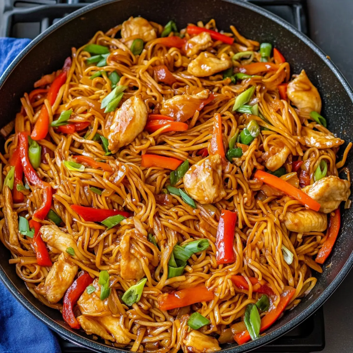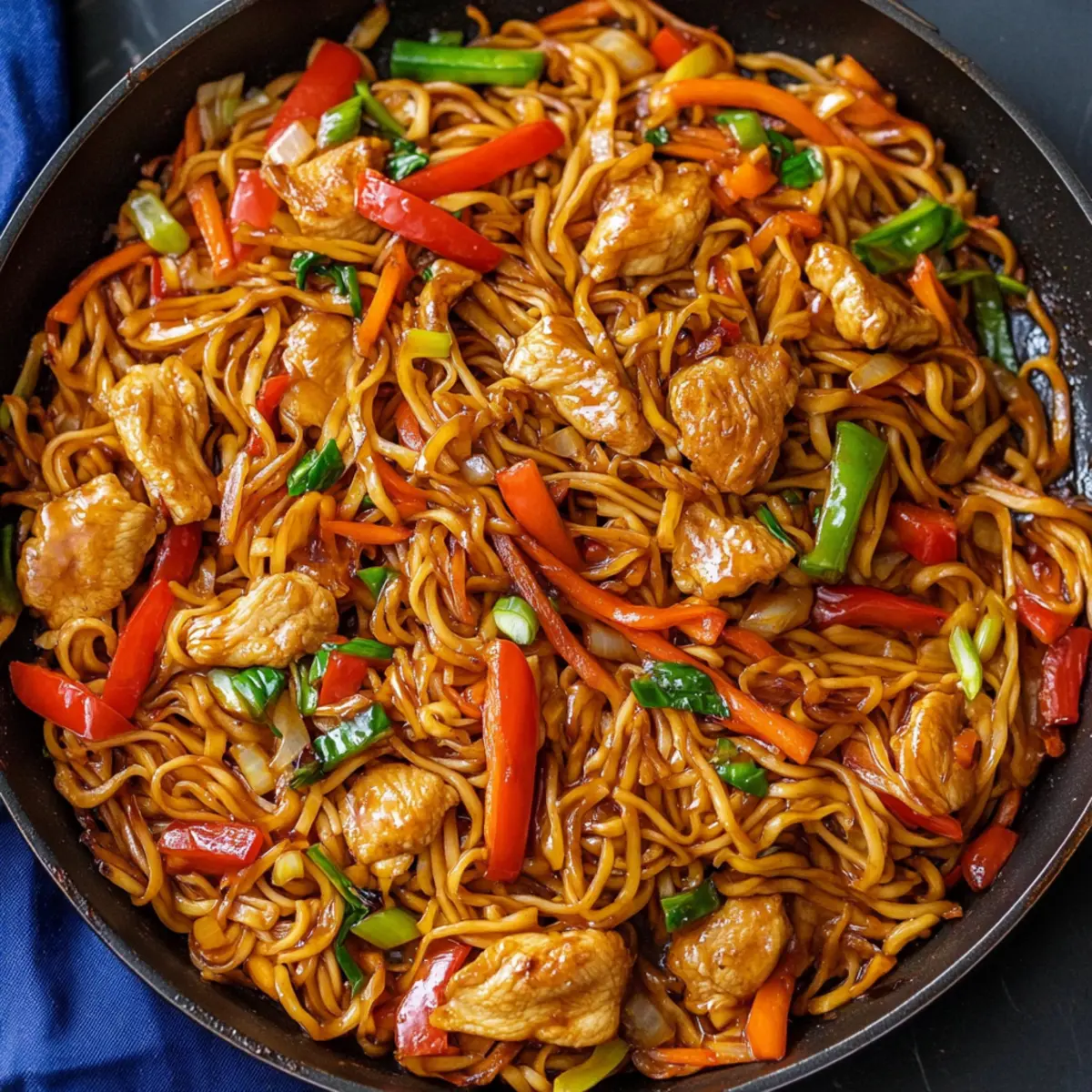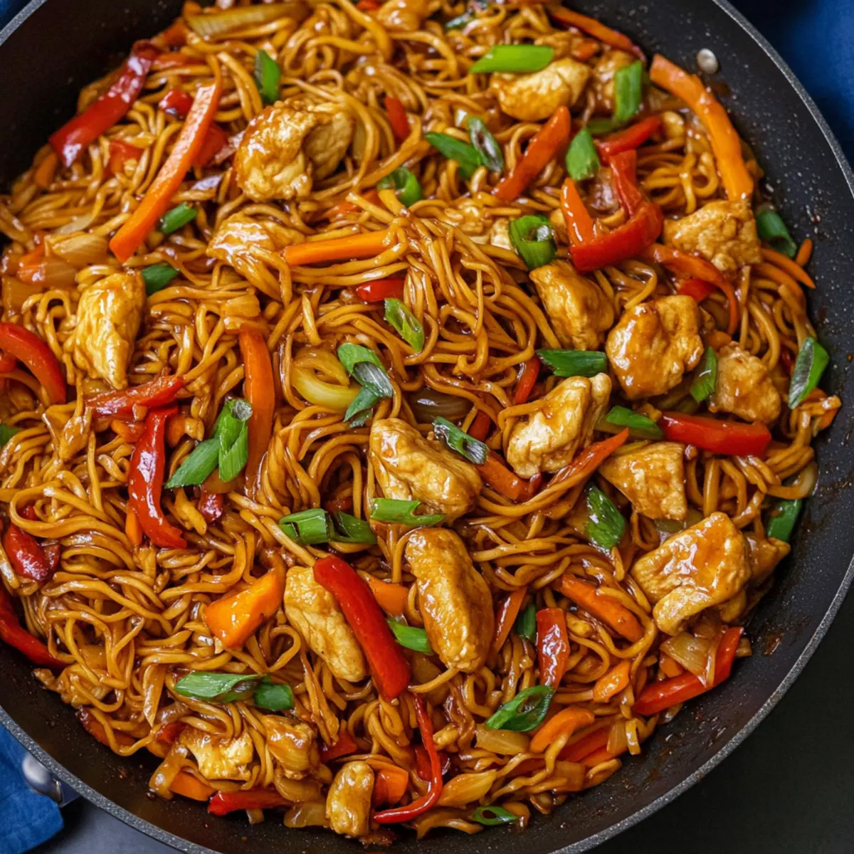 Jump to Recipe Print RecipeAs I tossed together a vibrant array of vegetables and savory sauce, a wave of nostalgia washed over me, transporting me straight to the lively streets of Japan. These Easy One-Pan Yakisoba Noodles have a way of bringing that authentic experience right into your kitchen! In just around 50 minutes, you can whip up a delicious, satisfying meal that is perfect for those hectic weeknights. What’s even better? This recipe is incredibly customizable, allowing you to choose between chicken, beef, or even a delightful vegetarian option with tofu. It’s a dish that not only screams flavor but also offers the ease of one-pan cooking—minimizing cleanup while maximizing taste. Are you ready to dive into a delightful culinary adventure that might just become your new favorite weeknight staple? Why Are These Yakisoba Noodles Unique? Simplicity at Its Best: This recipe combines all the elements you love into one easy pan, making it a go-to for busy weeknights. Flavor Explosion: The savory, sweet, and tangy sauce elevates every bite, making it a delicious escape from mundane meals. Customizable Proteins: Whether you prefer tender chicken, juicy beef, or hearty tofu, this dish fits any craving, accommodating everyone at the table. Quick and Satisfying: Whip it up in just about 50 minutes, so you can enjoy a fulfilling meal without the fuss. Crowd-Pleasing Appeal: With its colorful veggies and aromatic blend, these Yakisoba Noodles are sure to impress family and friends alike, whether served at home or taken to a potluck. Perfect for Meal Prep: Leftovers store well in the fridge, making them a practical choice for lunches throughout the week. For more quick meal ideas, consider trying our delicious Ground Beef Noodles for a different twist! Yakisoba Noodles Ingredients For the Sauce Sugar – Balances the salty flavors of the sauce; feel free to use agave syrup for a healthier option. Soy Sauce – Adds umami flavor; consider using gluten-free soy sauce for those with dietary restrictions. Oyster Sauce – Introduces depth and sweetness; substitute with hoisin sauce for a vegetarian alternative. Ketchup – Provides sweetness; it can be adjusted or omitted based on your taste preference. Worcestershire Sauce – Adds a tangy flavor; can be replaced with balsamic vinegar as a non-fish alternative. For the Noodles and Vegetables Yakisoba Noodles – The main ingredient that provides the structure of the dish; can be swapped with ramen or soba noodles if needed. Oil – Prevents sticking and adds moisture; for a more authentic taste, use sesame oil. Red Bell Pepper – Brings sweetness and crunch; swap it out for yellow or green bell peppers to match your palate. Carrot – Adds sweetness and vibrant color; zucchini is a great substitute if you’re looking for alternatives. Green Onions – Contributes freshness and flavor; red onions are a fitting substitute if you’re in a pinch. Cabbage – Provides texture and volume; bok choy or Napa cabbage can easily fill in if needed. Yellow Onion – Enhances depth of flavor; shallots work well as a milder alternative. Boneless Chicken – Acts as the main protein source; feel free to replace it with beef or tofu for your preferred variation. Dive into the world of homemade Yakisoba Noodles with these essential ingredients, and let your culinary creativity flow as you adapt this dish to your taste! Step‑by‑Step Instructions for Yakisoba Noodles Step 1: Prepare the Sauce In a small bowl, combine 2 tablespoons of sugar, ¼ cup of soy sauce, 2 tablespoons of oyster sauce, 2 tablespoons of ketchup, and 1 tablespoon of Worcestershire sauce. Whisk until the sugar dissolves completely, creating a rich, flavorful sauce. Set this mixture aside to allow the flavors to meld while you prepare the vegetables. Step 2: Prep Vegetables Slice your red bell pepper, carrot, green onions, cabbage, and yellow onion into even pieces to ensure uniform cooking. Aim for matchstick sizes for the carrots and thinly slice the onions. As you do this, visualize the vibrant colors that will soon fill your one-pan dish, bringing both freshness and crunch to your yakisoba noodles. Step 3: Cook Vegetables Heat 2 tablespoons of oil in a large pan or wok over medium-high heat until shimmering. Add each vegetable separately, starting with the onions, followed by the carrots, red bell pepper, and cabbage. Sauté each for about 3-4 minutes until they’re tender but still vibrant, stirring occasionally. This step enhances the texture and vividness of your dish. Step 4: Cook Chicken In the same pan, push the sautéed vegetables to the side and add 1 pound of boneless chicken, cut into bite-sized pieces. Cook the chicken over medium-high heat for about 6-8 minutes, or until it’s golden brown on all sides. This ensures a hearty protein to complement your yakisoba noodles. Step 5: Combine Ingredients Once the chicken is cooked through, pour in the prepared sauce, stirring to coat the chicken and vegetables evenly. Allow the mixture to simmer for about 2 minutes, letting the flavors blend together beautifully. This step is crucial for achieving that delightful savory profile typical of yakisoba noodles. Step 6: Add Noodles Carefully add 12 ounces of cooked yakisoba noodles to the pan, using tongs or chopsticks to toss everything together. Stir-fry the noodles with the chicken and vegetables for an additional 3-5 minutes, until everything is heated through and well combined. You’ll see the noodles soaking up the sauce, creating a luscious coating. Step 7: Serve Once everything is heated and perfectly mixed, transfer your yakisoba noodles to plates or a serving platter. Garnish with sliced green onions for an extra pop of color and freshness. Serve immediately while hot, allowing everyone to enjoy the aromatic, mouthwatering dish that will transport them to the streets of Japan. What to Serve with Easy One-Pan Yakisoba Noodles? Pairing your delicious Yakisoba Noodles wi