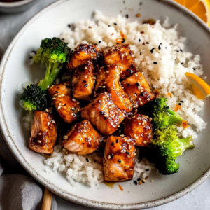 Introduction to Zesty Orange Glazed Salmon After a long day, the last thing I want is to spend hours in the kitchen. That’s where my Zesty Orange Glazed Salmon comes in. This dish is a game-changer, transforming a simple salmon fillet into a vibrant, flavorful experience in just 25 minutes. It’s perfect for impressing guests or treating yourself to a delightful dinner. The bright citrus notes combined with a hint of sweetness create a symphony of flavors that dance on your palate. Trust me, this recipe will quickly become a go-to for busy weeknights or special occasions alike! Why You’ll Love This Zesty Orange Glazed Salmon This Zesty Orange Glazed Salmon is not just a meal; it’s a celebration of flavor and convenience. In just 25 minutes, you can whip up a dish that’s both healthy and delicious. The ease of preparation means you won’t be stuck in the kitchen for hours. Plus, the vibrant glaze adds a burst of taste that will have your family asking for seconds. It’s a win-win for any busy home cook! Ingredients for Zesty Orange Glazed Salmon Gathering the right ingredients is key to making this Zesty Orange Glazed Salmon shine. Here’s what you’ll need: Salmon fillets: Fresh, high-quality salmon is essential. Look for vibrant color and firm texture. Freshly squeezed orange juice: This adds a bright, zesty flavor. Avoid bottled juice for the best taste. Maple syrup: A natural sweetener that balances the citrus. It adds depth and richness to the glaze. Tamari sauce: A gluten-free alternative to soy sauce, it brings umami and saltiness to the dish. Avocado oil: This oil has a high smoke point and a mild flavor, perfect for cooking salmon. Minced shallots: These add a subtle sweetness and complexity to the glaze. Freshly grated ginger: A little zing goes a long way! It enhances the overall flavor profile. Salt and pepper: Essential for seasoning, they help elevate the dish’s flavors. Cilantro: Finely chopped for garnish, it adds a fresh, herbal note that brightens the dish. For those looking to mix things up, consider adding a dash of chili powder to the glaze for a spicy kick. If you’re in the mood for a plant-based option, swap the salmon for tofu, adjusting the cooking time as needed. You can find the exact quantities for each ingredient at the bottom of the article, ready for printing! How to Make Zesty Orange Glazed Salmon Creating this Zesty Orange Glazed Salmon is a breeze! Follow these simple steps, and you’ll have a delicious dinner on the table in no time. Let’s dive in! Step 1: Preheat the Oven First things first, preheat your oven to 400°F (200°C). This ensures your salmon cooks evenly and perfectly. While the oven heats up, line a baking sheet with aluminum foil. This makes cleanup a snap! Step 2: Prepare the Glaze In a mixing bowl, combine the freshly squeezed orange juice, maple syrup, tamari sauce, avocado oil, minced shallots, and grated ginger. Stir until smooth. The aroma of this glaze will have your taste buds tingling with anticipation! Step 3: Arrange the Salmon Now, it’s time to arrange the salmon fillets on the foil-lined baking sheet, skin side down. Lightly season them with salt and pepper. This simple step enhances the natural flavors of the fish. Step 4: Apply the Glaze Generously drizzle the citrus glaze over the salmon. Make sure each piece is well-coated. This is where the magic happens—the glaze will caramelize beautifully as it bakes! Step 5: Bake the Salmon Place the baking sheet in the oven and bake for 12-15 minutes. You’ll know it’s done when the salmon is tender and flakes easily with a fork. The smell wafting through your kitchen will be irresistible! Step 6: Broil for Caramelization If you want that perfect caramelized top, switch to the broiler for an additional 2-3 minutes at the end of baking. Keep a close eye on it, as broilers can be sneaky and cook quickly! Step 7: Garnish and Serve Once done, remove the salmon from the oven and let it rest for a few moments. This helps the juices redistribute. Finally, sprinkle chopped cilantro on top before serving. It adds a fresh touch that complements the glaze beautifully! Tips for Success Use fresh ingredients for the best flavor, especially the orange juice. Don’t skip the resting time after baking; it makes a difference! Adjust the glaze to your taste—add more maple syrup for sweetness or ginger for zing. Keep an eye on the broiler; it can turn from perfect to burnt in seconds. Pair with a light salad for a refreshing meal. Equipment Needed Baking sheet: A standard sheet works, but a rimmed one prevents spills. Aluminum foil: For easy cleanup; parchment paper is a good alternative. Mixing bowl: Any size will do, just ensure it’s sturdy. Whisk or spoon: For mixing the glaze; a fork can work in a pinch. Variations Spicy Kick: Add a dash of chili powder or red pepper flakes to the glaze for a fiery twist. Herb Infusion: Experiment with fresh herbs like dill or parsley instead of cilantro for a different flavor profile. Maple Mustard Glaze: Mix in a tablespoon of Dijon mustard with the glaze for a tangy, sweet combination. Vegetarian Option: Swap the salmon for firm tofu, marinating it in the glaze before baking. Fruit Fusion: Top the salmon with slices of orange or grapefruit before baking for an extra burst of citrus flavor. Serving Suggestions Pair with Quinoa: Serve the salmon over a bed of fluffy quinoa for a nutritious boost. Fresh Salad: A light arugula salad with a citrus vinaigrette complements the dish perfectly. Wine Selection: A chilled Sauvignon Blanc enhances the zesty flavors beautifully. Presentation: Serve on a wooden board with lemon wedges for a rustic touch. FAQs about Zesty Orange Glazed Salmon Can I use frozen salmon for this recipe?Absolutely! Just make sure to thaw the salmon completely before cooking. Frozen salmon can still be delicious when prepared with this zesty orange glaze. What can I substitute for tamari sauce?If you don’t have tama